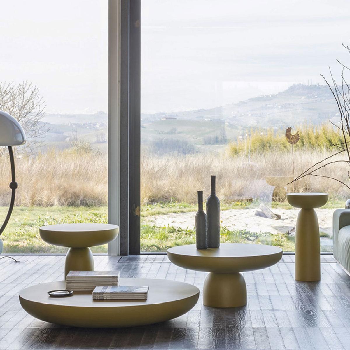 Olo is a family of monolithic coffee tables. This assemblage of pure, solid forms comes from a primitive aesthetic that draws a link between present and past. The curved, soft lines break with our very strict, linear everyday environments. These modern sculptures, essential in their forms, possess maximum expressive force. Olo is a mix of solidity, radicality and sensuality. These coffee tables perfectly meet our needs for authenticity and a return to basics. Olo coffee tables are available in different materials: waxed concrete, matt lacquered wood and mocha-stained natural wood. The different coffee tables from the Olo collection can be combined to form a graphical set.