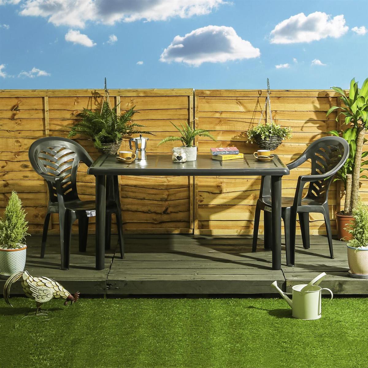 I love this table for its modern, clean lines and vibrant green finish, which instantly brightens outdoor spaces. It works particularly well in contemporary or minimalist gardens, but can also add a pop of colour to more traditional settings. To style it effectively, consider pairing it with neutral or natural tones in the surrounding furniture and accessories, like wicker chairs or wooden planters, to create a balanced look. For practical tips, use weather-resistant tableware and cushions in complementary colours to enhance comfort and longevity, and add festive or seasonal centrepieces to keep the setup inviting throughout the year.