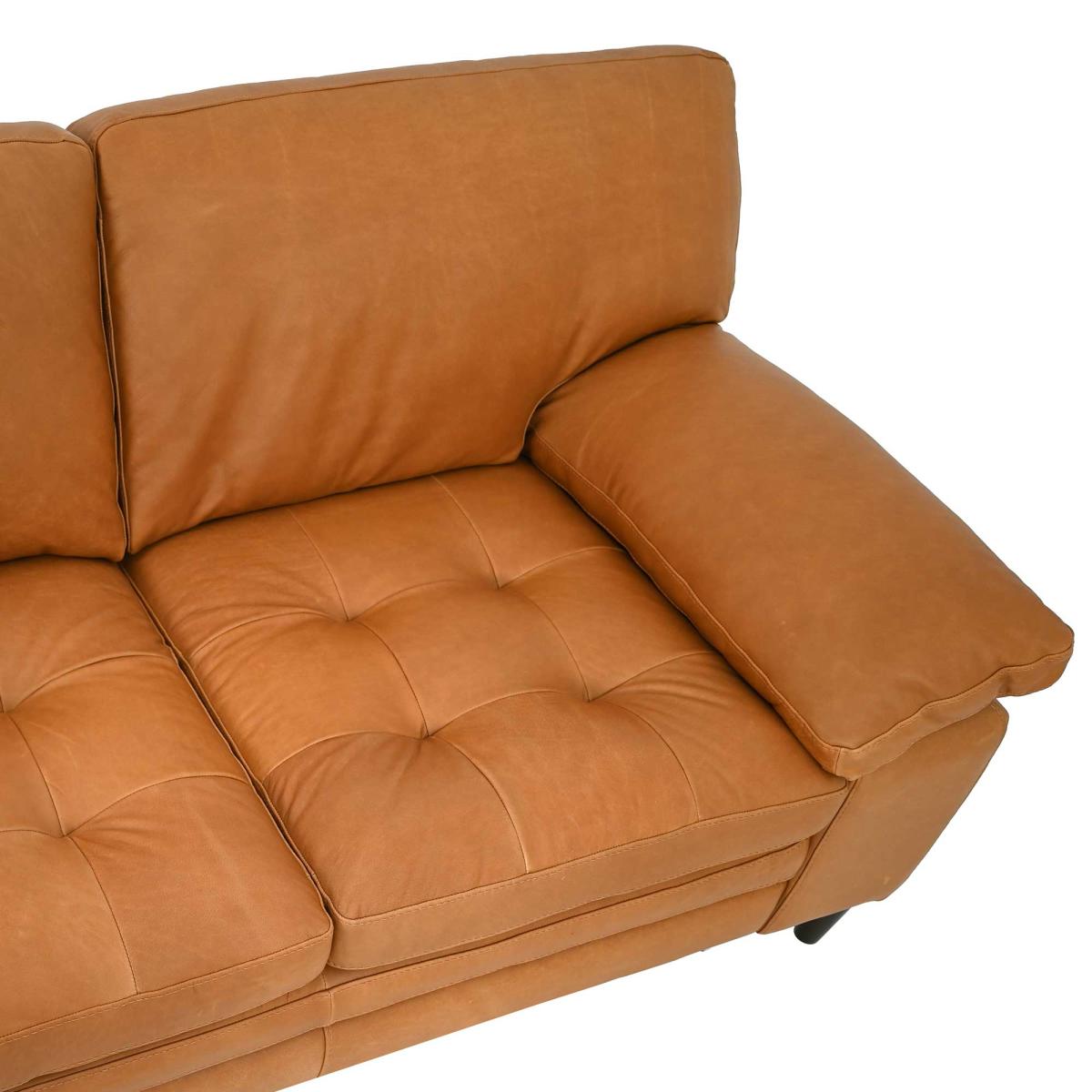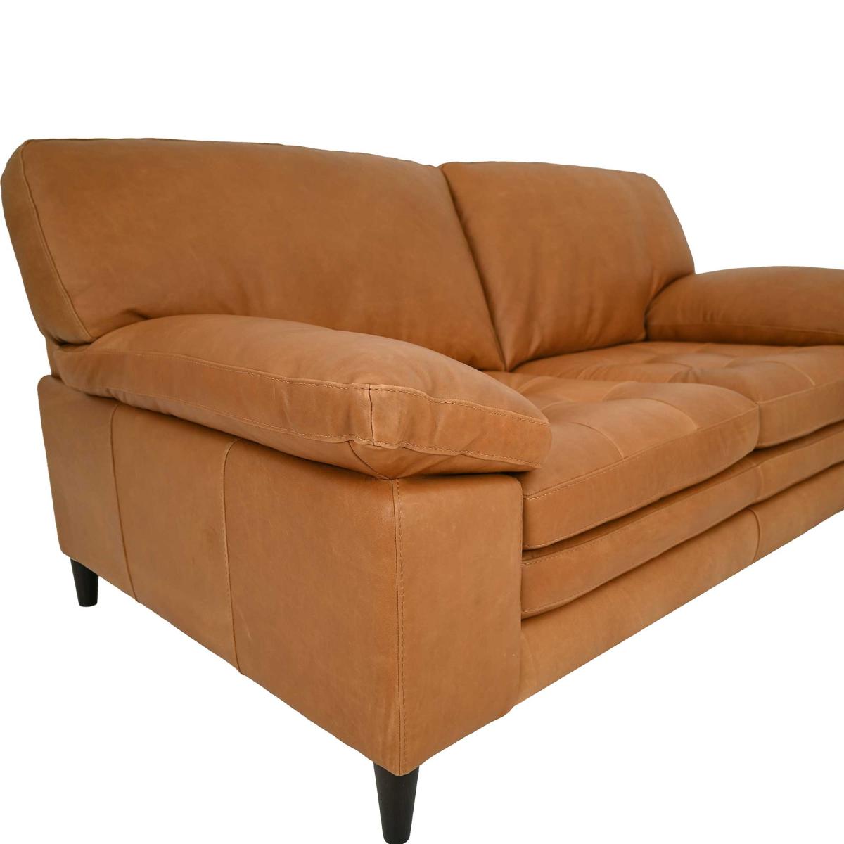 Timeless comfort awaits with the Olson Leather Tufted Loveseat. Rich brown leather, dark brown solid wood legs, and a webbed suspension system offer a perfect balance of style and support. Care for it effortlessly and sink into the plush comfort of high-density foam and layered fibre seat cushions. Meticulously crafted with durability in mind, this loveseat is a timeless addition to your space.