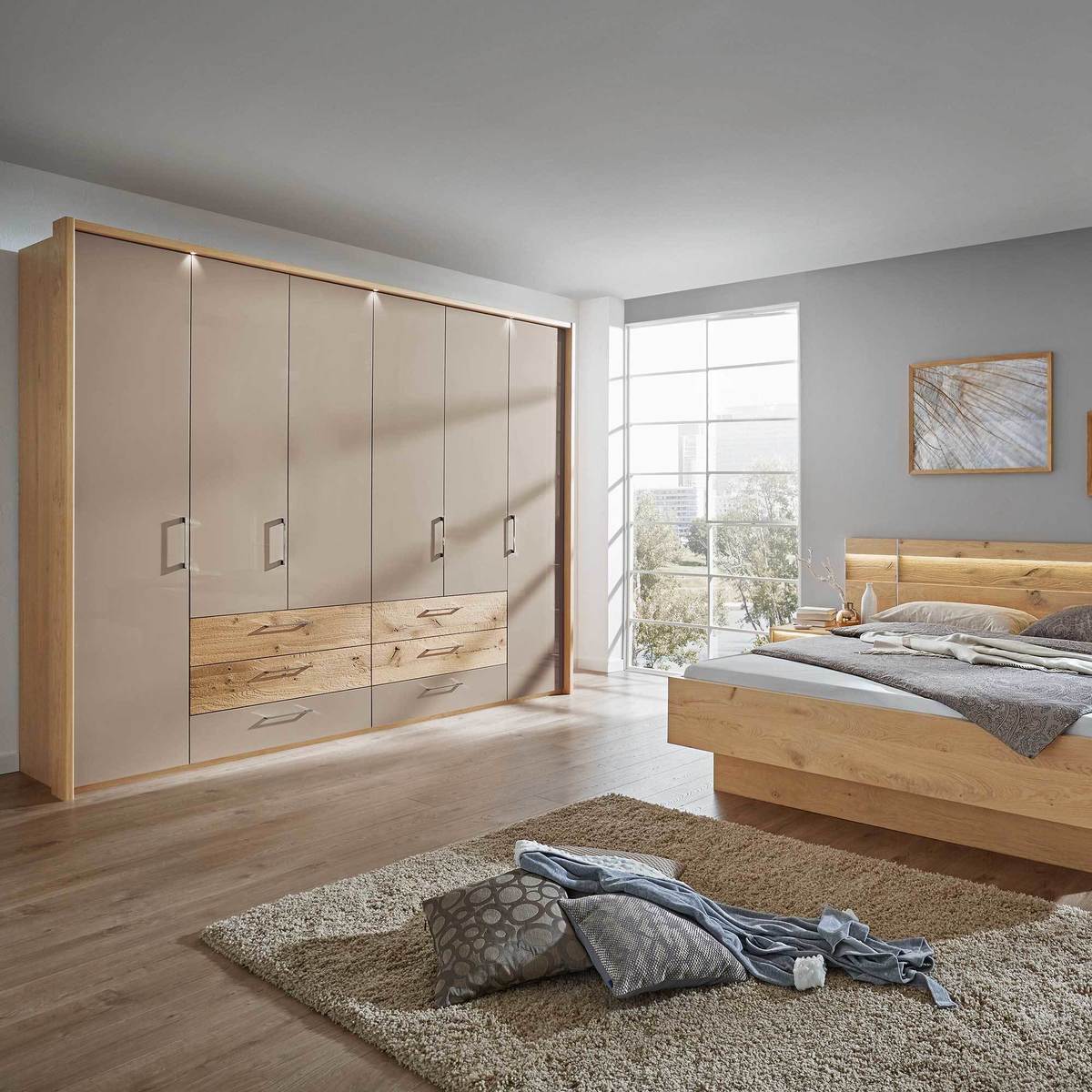 This wardrobe is a smart choice for those looking to combine practicality with a contemporary aesthetic. I love how the Balken oak exterior adds warmth and texture, balancing nicely with the high gloss taupe doors which bring in a sleek, modern touch. It works particularly well in minimalist or Scandinavian-inspired interiors, where clean lines and natural materials are key. For styling, consider pairing it with neutral tones and subtle metallic accents to enhance its sophisticated look. Practical tips include utilising the interior space efficiently with organisers or drawers, especially since the design offers six hinged doors for easy access. Overall, it’s an excellent option for creating a polished, functional bedroom setup.