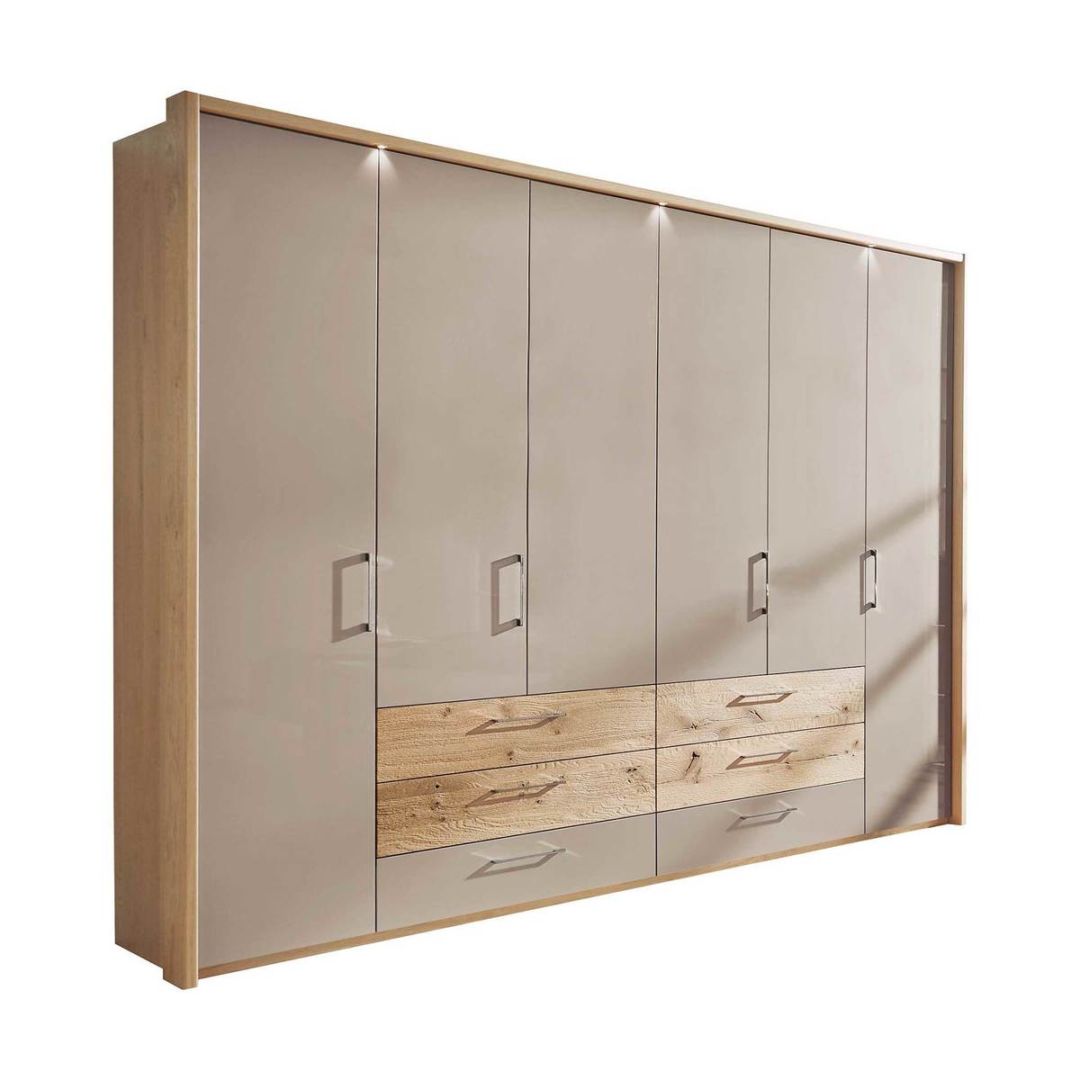 Olvera 6 Door Hinged Wardrobe, Balken Oak and High Gloss Taupe