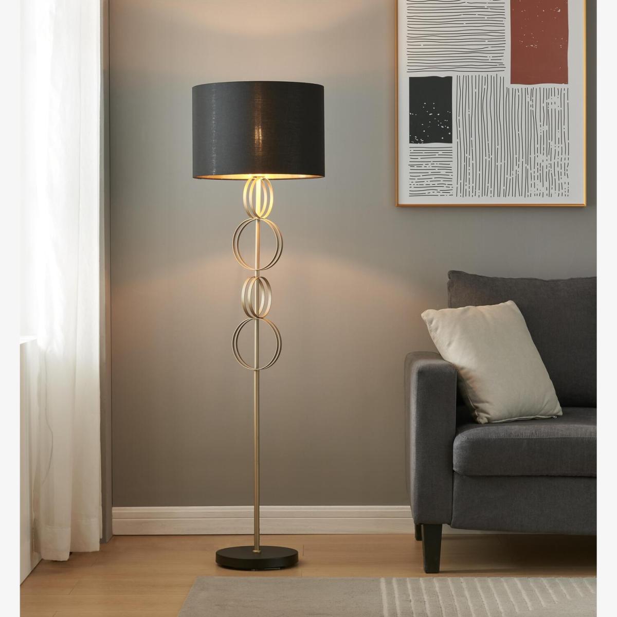 I love this floor lamp for its clean, modern lines and versatile silhouette. It works particularly well in contemporary or minimal interiors, providing a stylish yet unobtrusive source of ambient light. Its understated black shade and sleek gold base make it a good match for colour schemes ranging from monochrome to muted neutrals. Practical styling tips include placing it beside a reading nook or in a corner to add height and visual interest, while keeping the shade clear of surrounding furniture for even light distribution. It’s a functional statement piece that elevates both cosy living areas and more polished, sophisticated rooms.