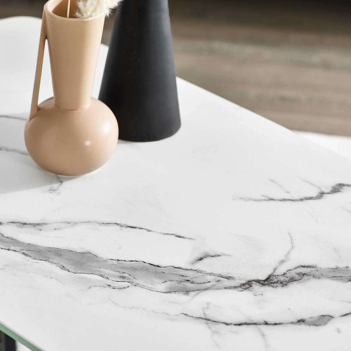 I’m a fan of this marble-effect coffee table for its balance of smart styling and practicality - the white patterned top brings a touch of luxe without the upkeep of real stone, while the black metal base adds a clean, contemporary edge. It sits neatly into modern, Scandi or industrial-inspired interiors and works well against neutral sofas or richer, jewel-toned upholstery. For styling, keep the look uncluttered: a low stack of design or art books, a small potted plant or sculptural vase, and perhaps a couple of metal or ceramic candle holders. Layer a textured rug underneath to define the seating area and introduce a soft contrast to the table’s clean lines.