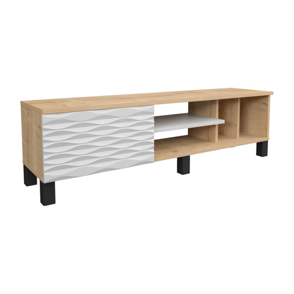 Stylish and elegant, different and unique structure will make this TV stand a new star in your house. One cabinet and four open shelves provide ample storage space. It can accommodate up to 60" TVs. The drop-down opening decorative door of the cabinet are made from an 18 mm thick MDF with membrane vacuum press PVC foil 3D coatings. Special design and unique structure that no other one has. The media stand body is made of an 18 mm thick melamine coated particle board (doors are MDF) and banded with PVC edge banding tape. Legs are solid wooden plastic. Overall, it is manufactured using health-friendly materials. The product will be delivered to the customer in the original package as disassembled. It is designed to be assembled by the customer using a power drill and screwdriver. Assembly instructions and installation hardware are included in the package. For fast and error-free installation, product parts are numbered with stickers in accordance with the assembly guide.