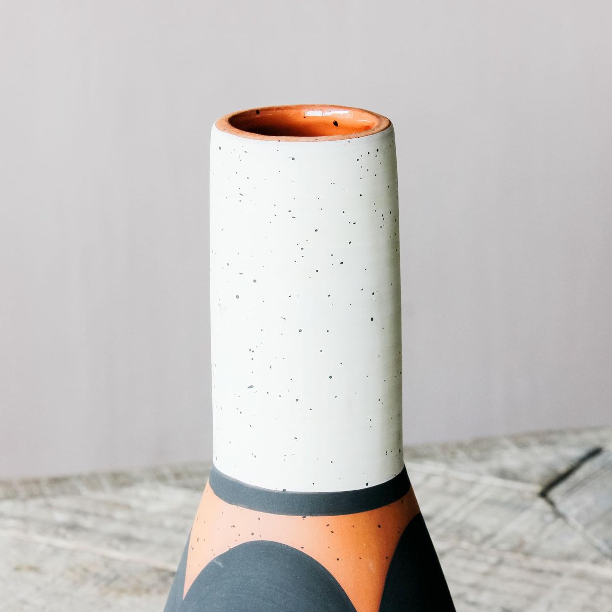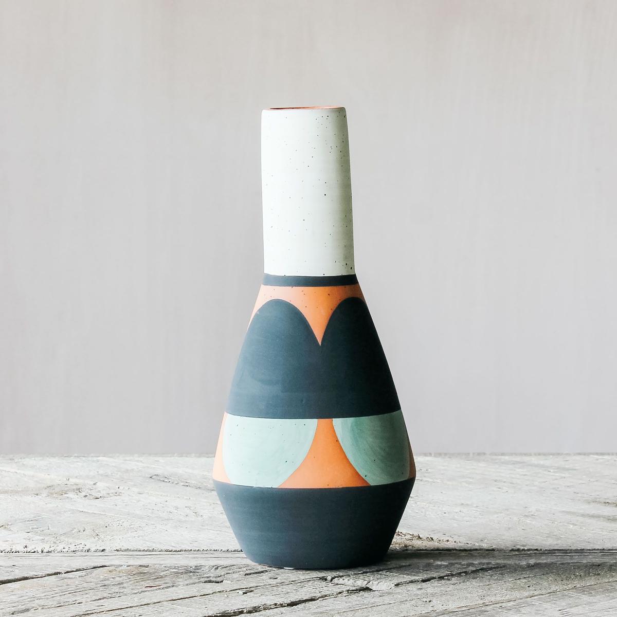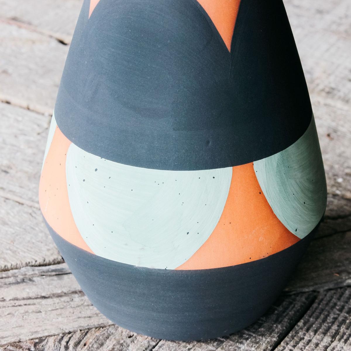 A sculptural terracotta vase with a geometric teal blue and obsidian black design, fill it with natural dried flowers for the Mediterranean inspired home.