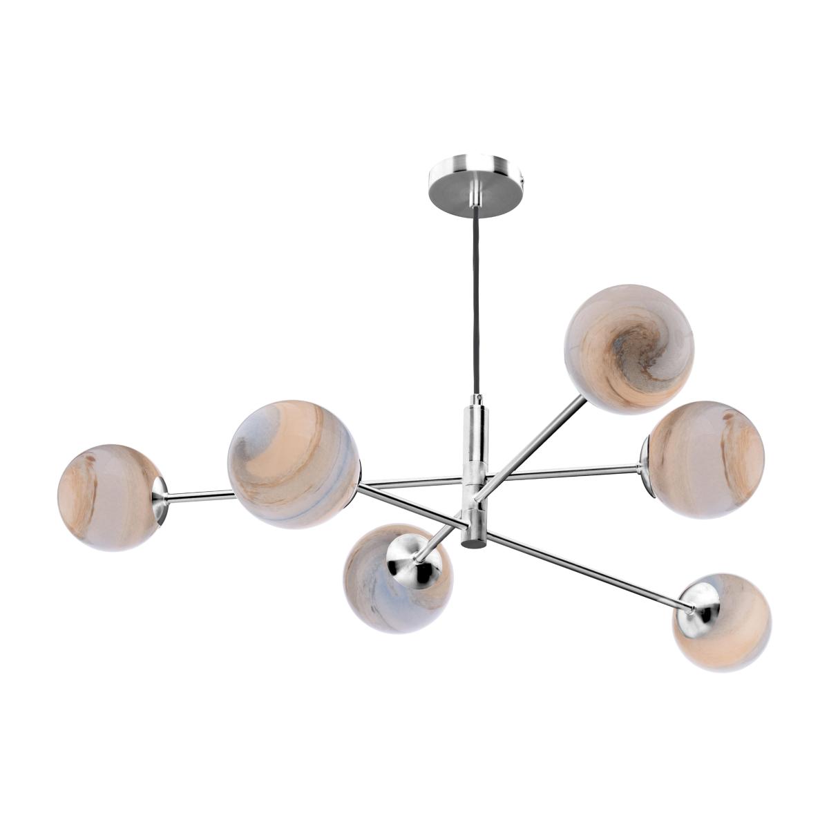 Modern and very eye-catching, this ceiling pendant is a combination of polished chrome metal and marbled glass and brings brightness to any space. Why you'll love it This 6-light ceiling pendant is a stunning combination of glass and metal. Its 6 marbled-glass lights create ample yet softly diffused light. Supporting arms, central column and ceiling rose have a polished chrome finish. Creates a sleek and stylish focal point. Height adjustable at installation. This pendant light is part of the Furniture Village lighting collection. What you need to know Steel base, glass shades. Professional installation advised. Requires 6 x G9 max. 40 W bulbs (not included). Please do not exceed this wattage. To clean, wipe gently with a clean soft cloth. Be sure to disconnect from the power outlet before cleaning. Dimensions Height: 110 cm (44 in). Diameter: 80 cm (32 in). Item code: OMRA6PNDCRM-001