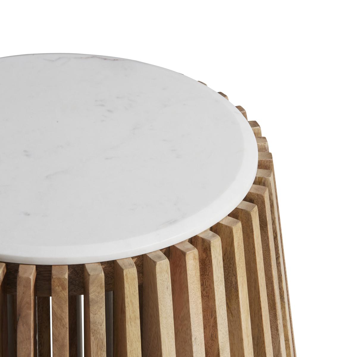 Crafted from natural mango wood which upholds the beautiful marble top, the Ombra Side Table is the perfect spot to place a lamp and perhaps a decorative accessory or plant. The intricate design creates a unique style and certainly makes a statement. A practical piece of furniture to position alongside a sofa or chair, perfect to place your coffee and relax after a busy day.