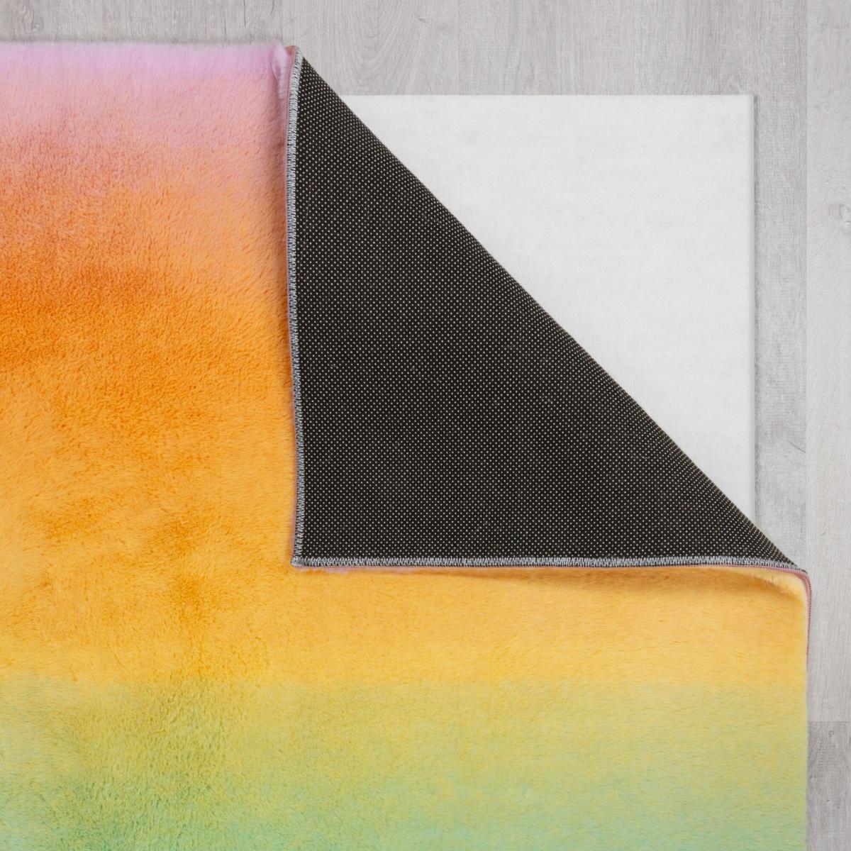* Rainbow design* Horizontal ombre pattern* Faux fur pile* Perfect for bedrooms Bring a burst of colour and joy to your bedroom with the Ombre Supersoft Faux Fur Rug. Its vibrant, multicoloured ombre rainbow design instantly brightens up any space. Soft to the touch, this rug invites little feet to sink in and play while serving as a captivating focal point in their room. Care Instructions: When opening, re-roll your rug pile out and leave in a warm room for 24 hours before putting in place, this will help to reduce wrinkles and curling from packing. Do not pull any loose threads, please cut them carefully with scissors to remove. Avoid prolonged exposure to direct sunlight as this may cause fading of the colour. Turn your rug regularly to ensure even wear and to reduce pressure marks from furniture. Fibres may shed when new and during use, this is a characteristic of this product and is not a defect and should reduce with normal use and regular vacuuming. Before using any cleaning products on your rug, test on an inconspicuous area first to ensure it does not affect the colour. Clean spills immediately by blotting with a clean dry white cloth - do not rub as this may stain the fibres. Vacuum your rug regularly to remove everyday dirt, we recommend the use of a suction type vacuum cleaner as a rotating vacuum brush can cause damage to the pile surface. We recommend the use of an anti-slip mat beneath your rug to prevent it from slipping and sliding out of place. Latex is used on the back of this rug. Please do not leave babies or young children unsupervised on this rug.