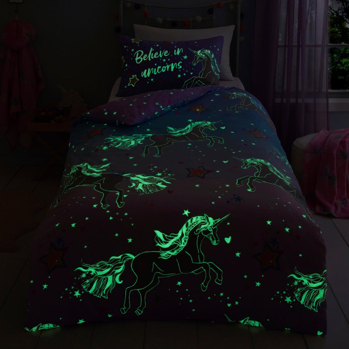* Unicorn ombre design* Glow in the dark reverse Embark on a magical journey with Bedlam's Unicorn Duvet Cover Set! Immerse yourself in a world of enchantment, as the ombre print takes you on a whimsical adventure. And when the lights go out, watch the stars on the lilac reverse glow in the dark, creating a dreamy atmosphere fit for a unicorn lover. Let your dreams gallop away to a realm of wonder and joy - with Bedlam, the world is a magical place where imagination knows no bounds!