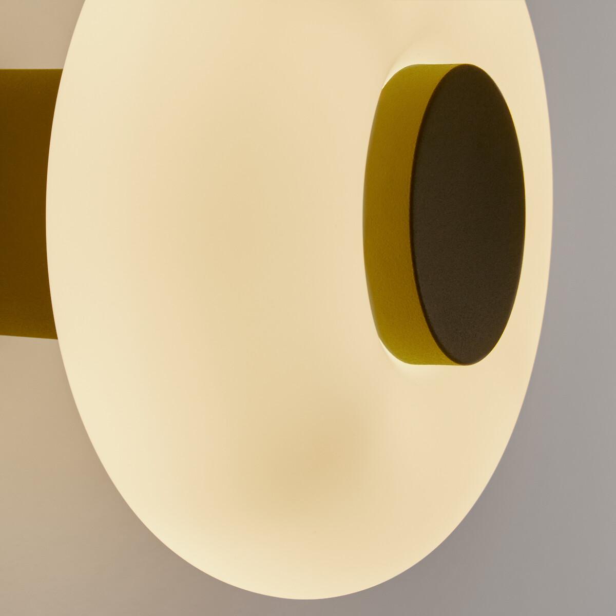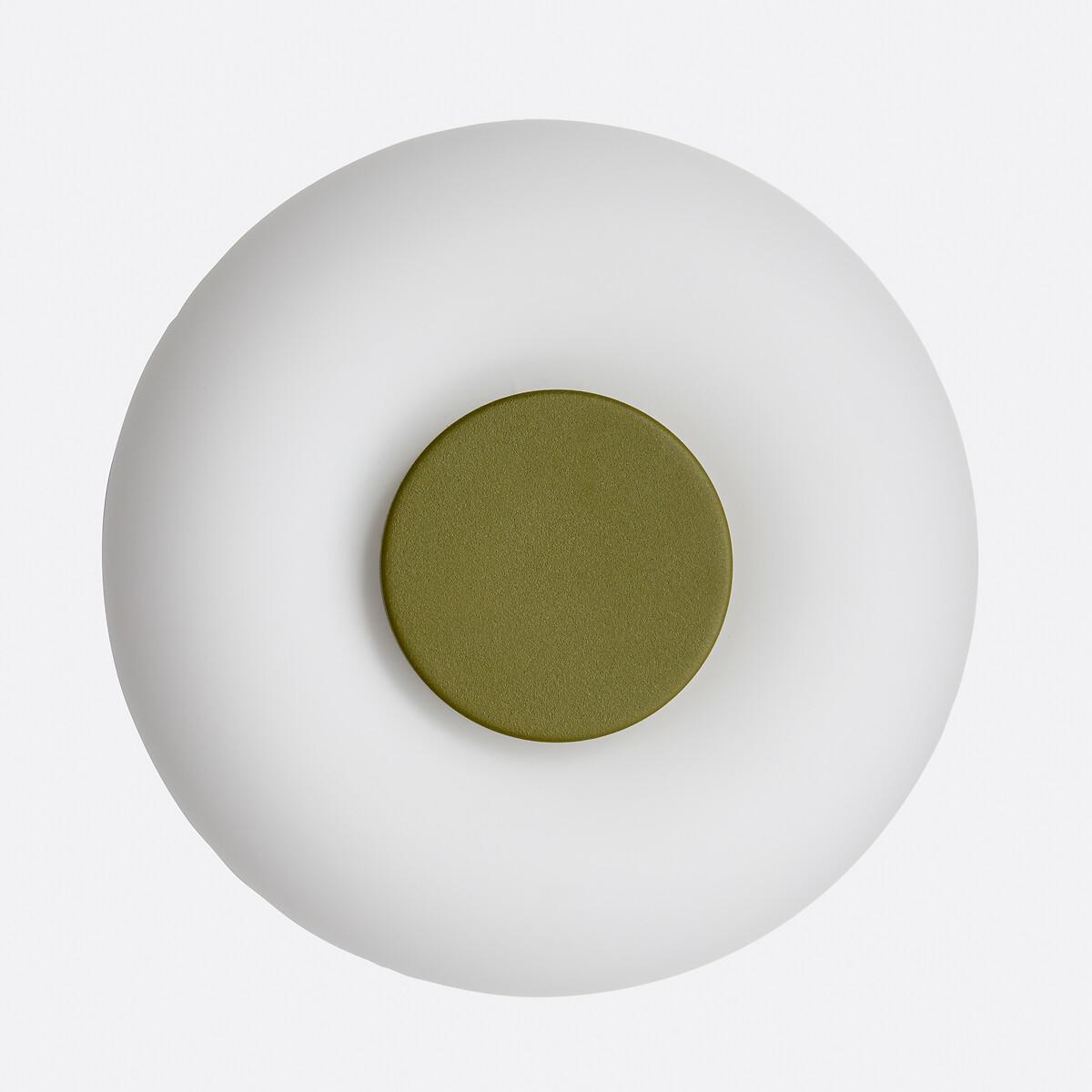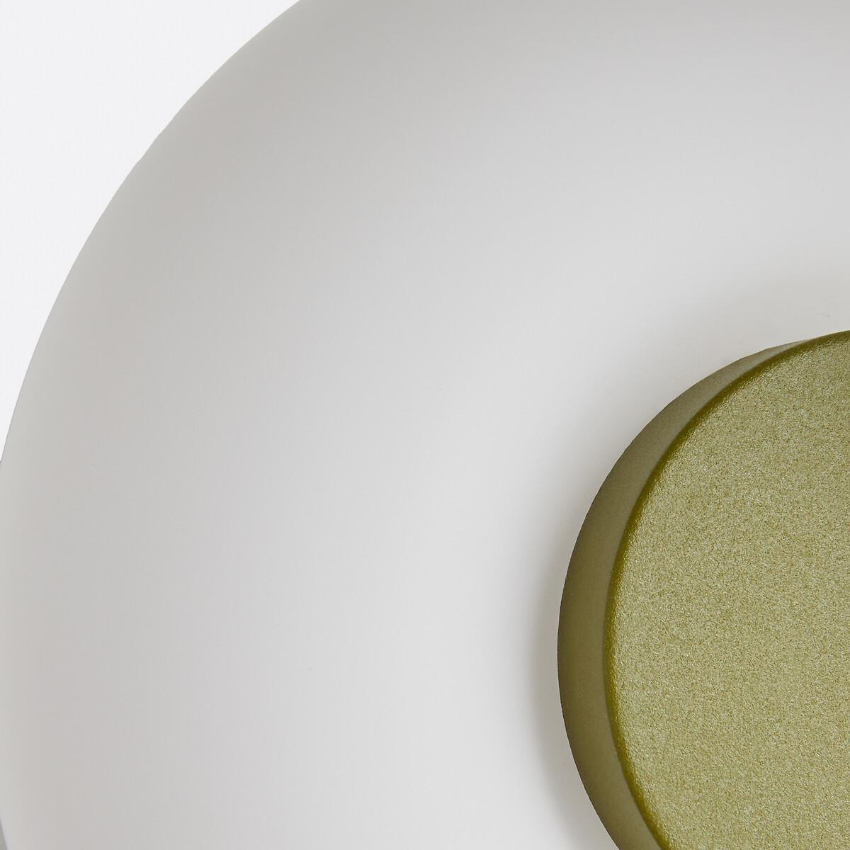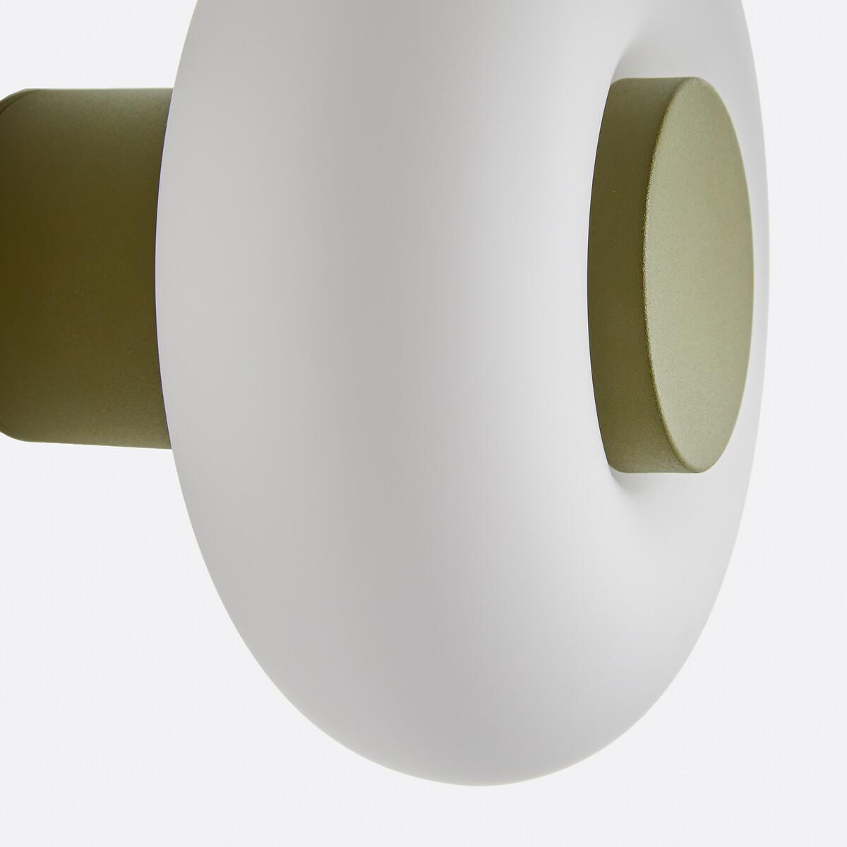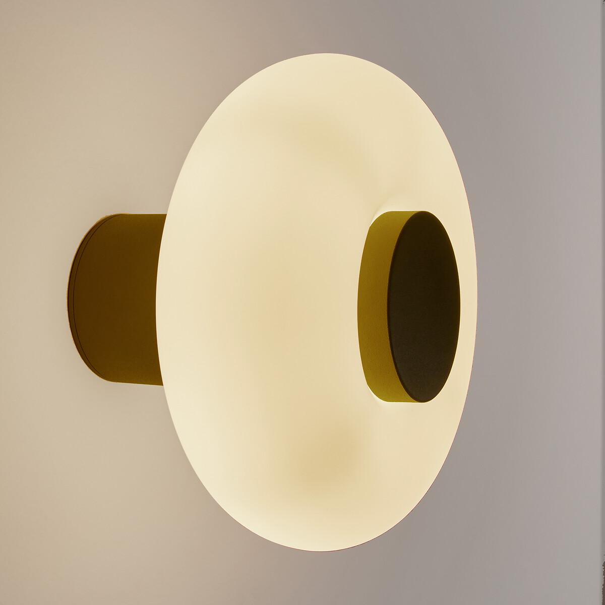 With its hyper-graphic shape, the Omer wall light boldly blends materials and volumes. : base in painted metal and diffuser in opaline in a luminous ring-shaped design. A powerful piece that blends accent lighting with style. Designed by La Redoute Intérieurs. Product Details • Opaline glass shade • Iron base covered with epoxy paint • E14 socket for 4W max LED bulb (not supplied).Dimensions • Diameter: 21.5cm • Height: 15cm • Lampshade:Ø21.5 x H7.7cm Parcel Dimensions: • 1 parcel • W26 x H23 x D26cm, 1.72kg