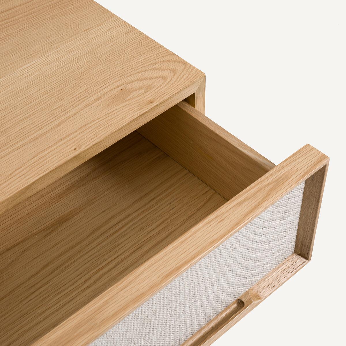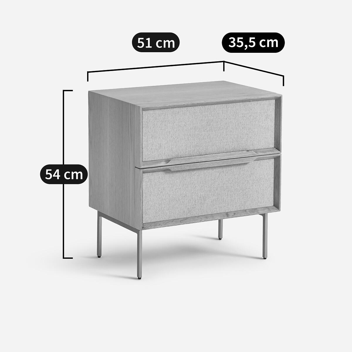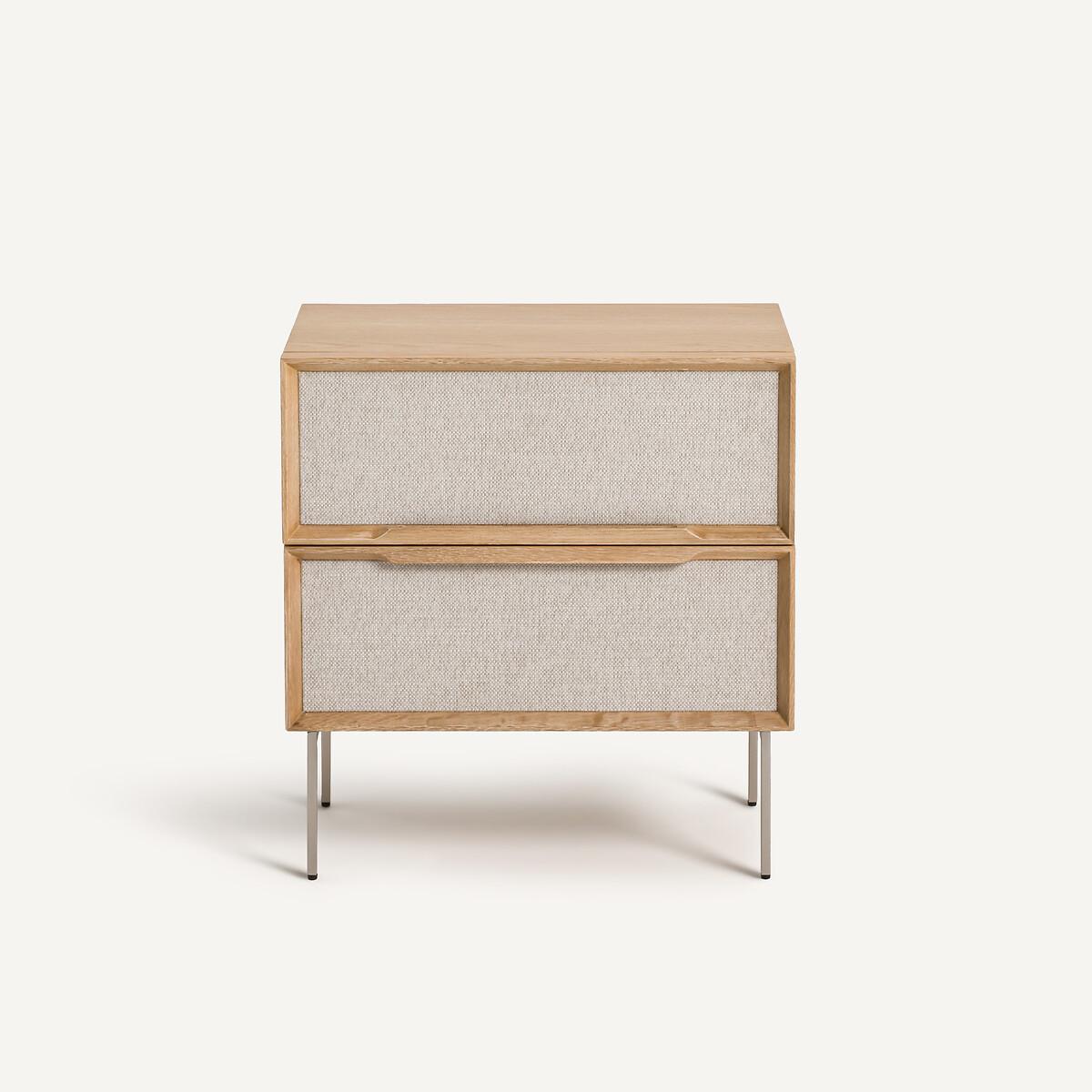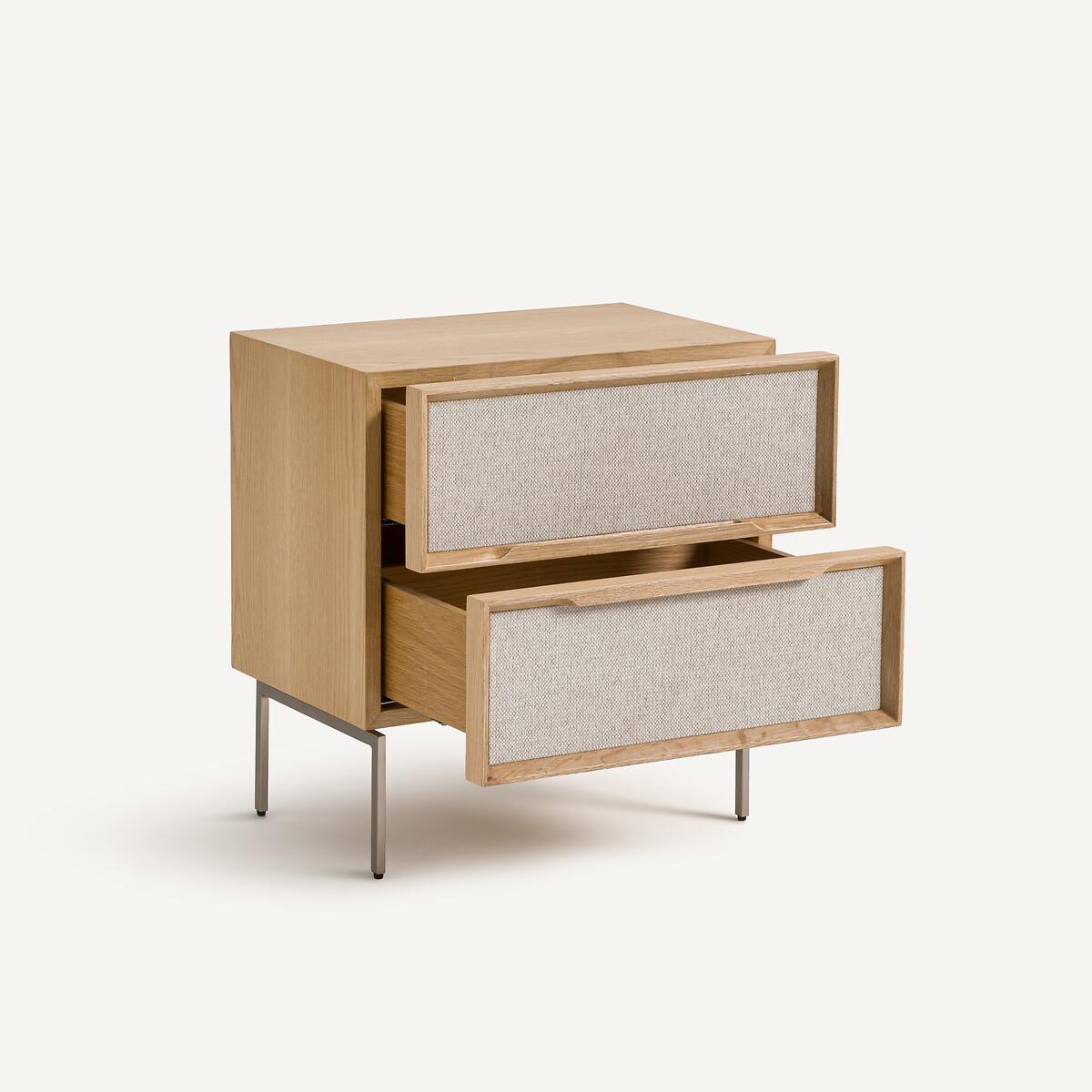 Elegant and discreet, the Omid bedside table evokes the world of luxury hotels. Combining light oak and fabric, Omid is enhanced by slender, lightweight legs with a satin nickel finish. A contemporary, functional and sophisticated exclusive, with the AMPM signature. Product Details • Cabinet and drawers in oak veneered MDF, nitrocellulose finish • Drawer fronts in MDF lined with textured textile, 91% polyester, 9% acrylic, 450g/m² • Soft closing system • Sheet metal legs, satin nickel finish. Quality Info • This furniture is equipped with German brand hardware: reliable, discreet and functional. These accessories ensure the longevity of your product. • Soft-closing : system for closing doors smoothly, silently, also preventing fingers from getting caught. Dimensions. Overall • Width: 51cm • Height: 54cm • Depth: 35.5cm • Height of legs: 16cm. Usable space • Drawers : L51 x H19 x D30cm • Sold pre-assembled. • WOOD FROM SUSTAINABLY MANAGED FORESTS. FSC® certified wood comes from forests that are environmentally, socially and economically well managed. Dimensions and weight of parcel1 parcel • L62 x H64 x D45cm, 23.3kg