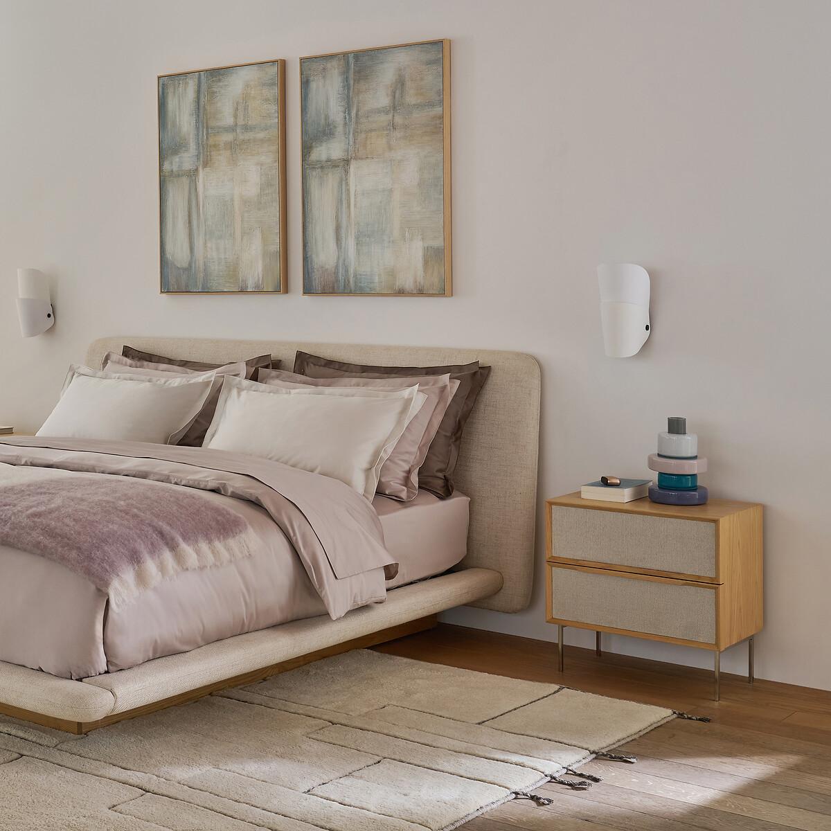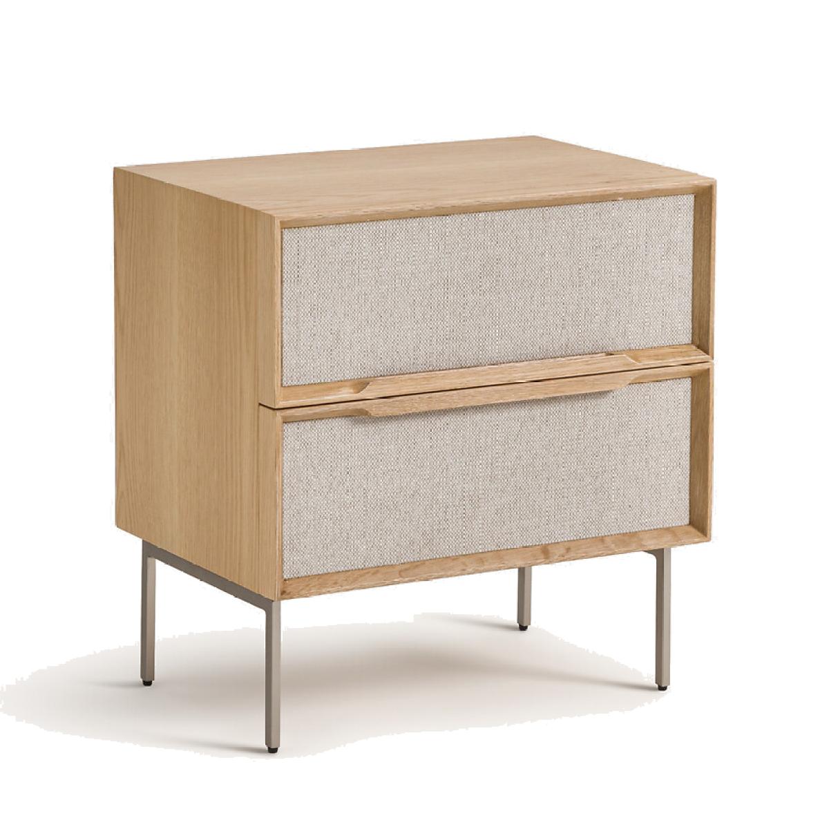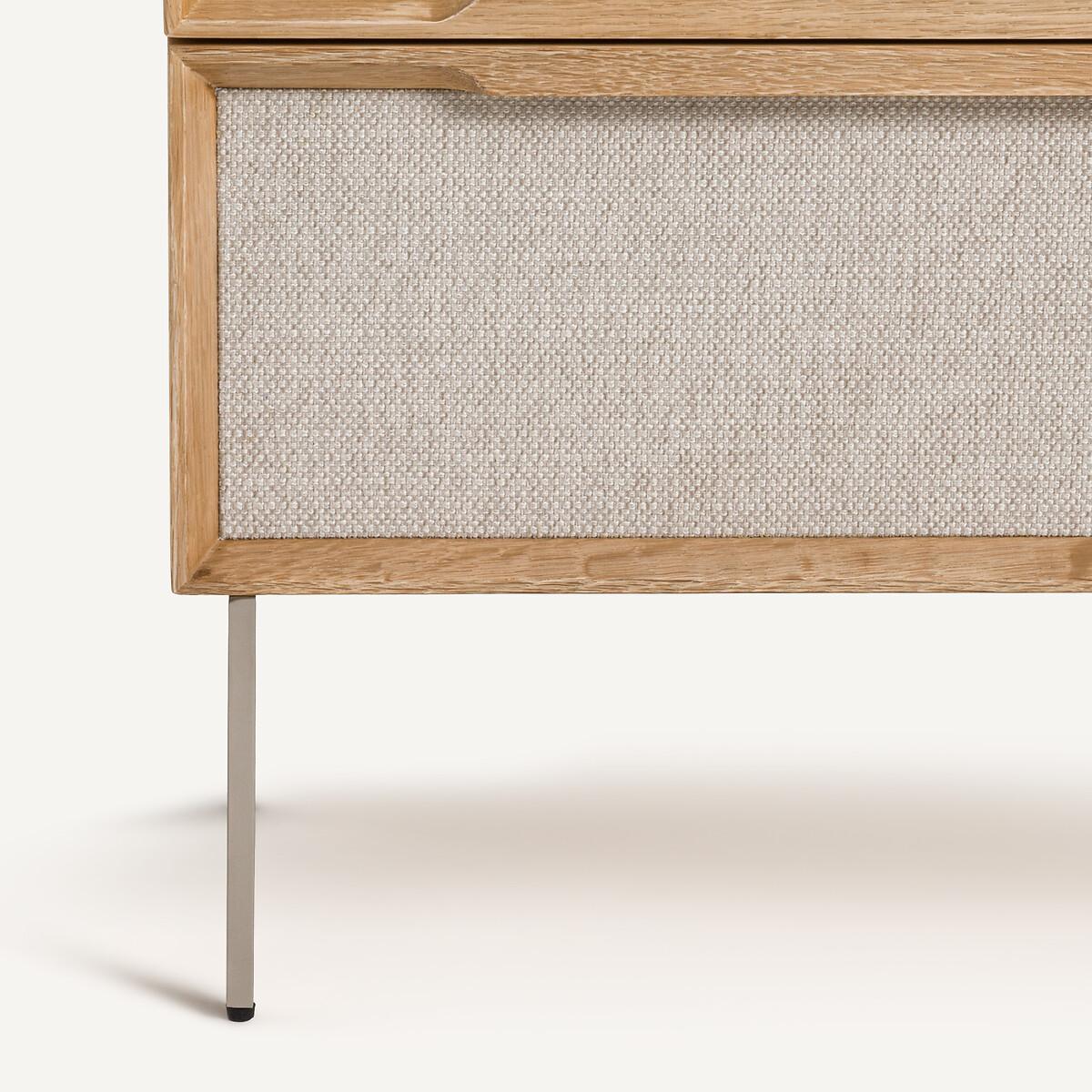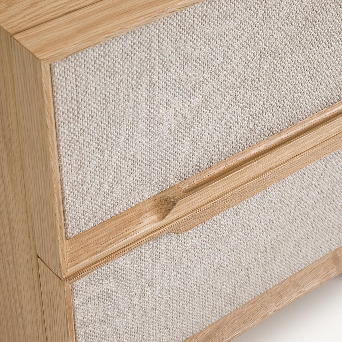 Elegant and discreet, the Omid bedside table evokes the world of luxury hotels. Combining light oak and fabric, Omid is enhanced by slender, lightweight legs with a satin nickel finish. A contemporary, functional and sophisticated exclusive, with the AMPM signature. Product Details • Cabinet and drawers in oak veneered MDF, nitrocellulose finish • Drawer fronts in MDF lined with textured textile, 91% polyester, 9% acrylic, 450g/m² • Soft closing system • Sheet metal legs, satin nickel finish. Quality Info • This furniture is equipped with German brand hardware: reliable, discreet and functional. These accessories ensure the longevity of your product. • Soft-closing : system for closing doors smoothly, silently, also preventing fingers from getting caught. Dimensions. Overall • Width: 51cm • Height: 54cm • Depth: 35.5cm • Height of legs: 16cm. Usable space • Drawers : L51 x H19 x D30cm • Sold pre-assembled. • WOOD FROM SUSTAINABLY MANAGED FORESTS. FSC® certified wood comes from forests that are environmentally, socially and economically well managed. Dimensions and weight of parcel1 parcel • L62 x H64 x D45cm, 23.3kg