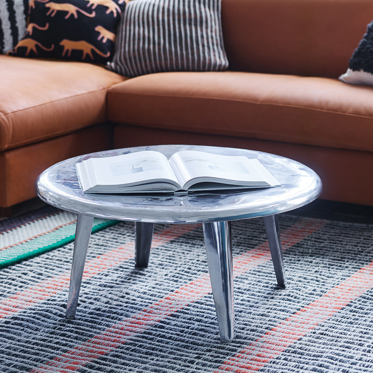 I love this round coffee table for its sleek, contemporary feel and the subtle sheen of its beaten aluminium finish, which adds texture without overwhelming the space. It's versatile enough to work in various interiors, from minimalist Scandinavian-inspired schemes to more eclectic, industrial-rich settings. When styling, consider pairing it with both soft textiles and bold finishes to create visual interest. Practical tips include keeping surfaces clutter-free to let the metal’s finish shine, while adding a few well-chosen accessories like a stack of art books or a small plant can bring colour and personality. Its sturdy yet elegant design makes it perfect for centre-stage in a living room, offering both form and function in one stylish package.