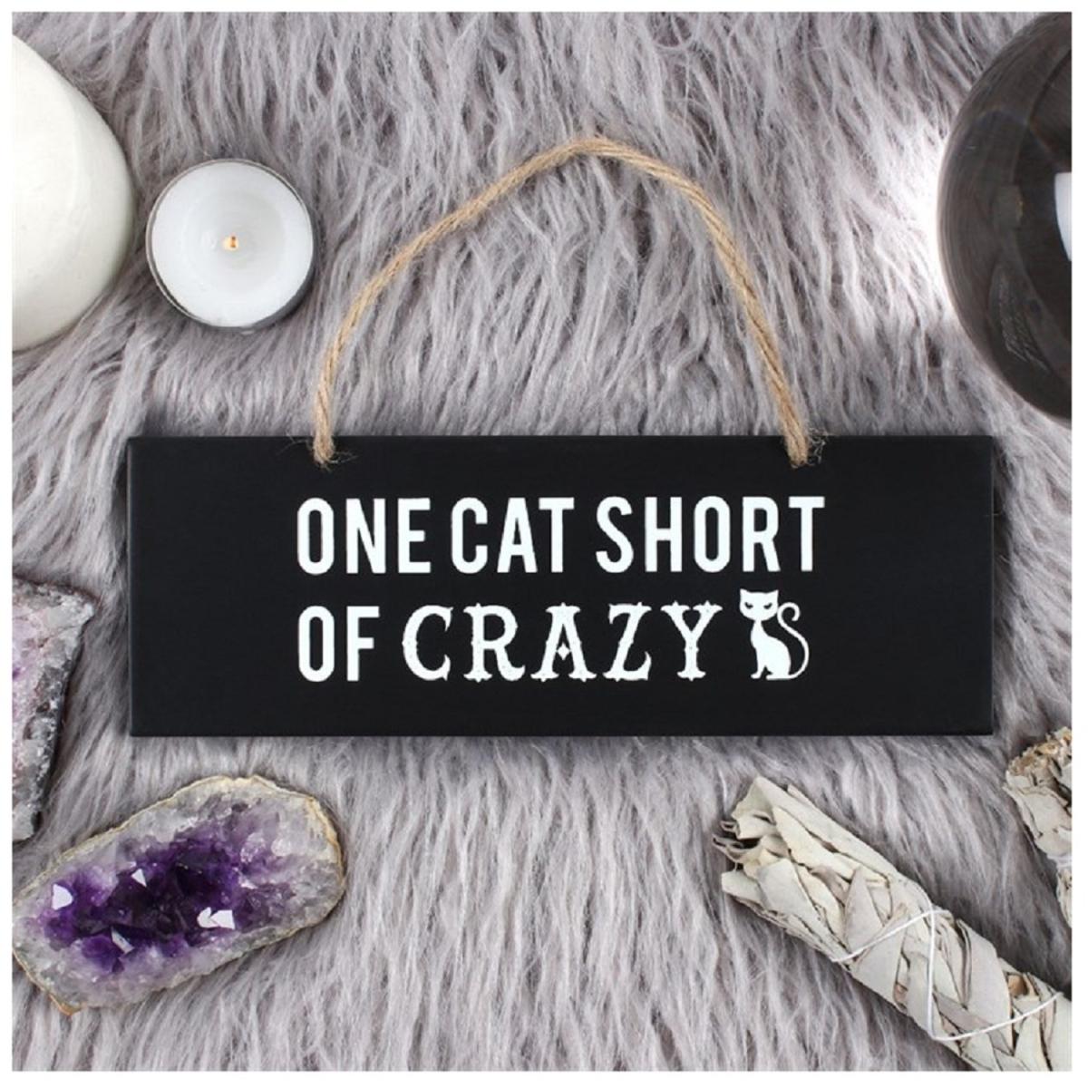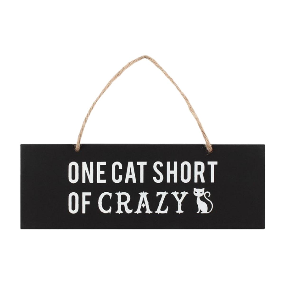 Black hanging wall sign featuring the text 'One Cat Short of Crazy'.