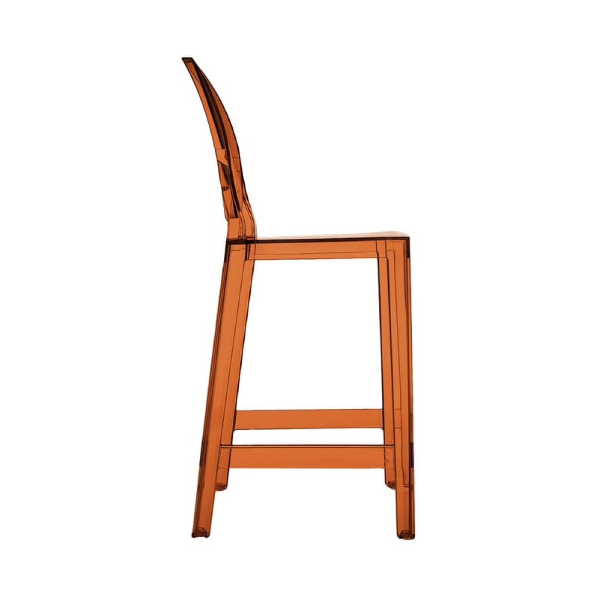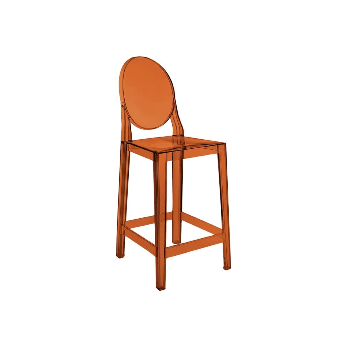 Timeless elegance by Philippe StarckWhen design plays with humor and classic heritage, the result is as unexpected as it is seductive. Designed by Philippe Starck for Kartell, the One More bar chair extends the world of the famous Victoria Ghost with its slender silhouette, medallion back and light, airy look. Made from transparent or solution-dyed polycarbonate, this iconic piece combines aesthetics and functionality. Its resistant structure, perfectly suited to both indoor and outdoor use, makes it ideal for punctuating a kitchen island, a hotel bar or an elegant terrace. Thanks to its wrap-around backrest, One More ensures long-lasting seating comfort, while adding a touch of graphic sophistication. Available in two heights (65 or 75 cm) and in a subtle palette of colors, it blends harmoniously with the most minimalist decors as well as revisited classic interiors. Why choose the One More Bar chair? - Design by Philippe Starck for Kartell - Rounded backrest inspired by medallion chairs - Ultra-resistant material: Molded polycarbonate - Suitable for indoor and outdoor use Add a touch of refined audacity to your interior with One More: a sculptural, convivial and resolutely contemporary Bar chair. In detail: Variation : Amber Brand : Kartell Designer : Philippe Starck Type :Bar chair Colour : Amber Material : Polycarbonate Dimensions :W 37.5 x D 51 cm x H 104 cm - Seat : H 65 cm Weight : 10.78 lb Characteristics : Made in Italy - Creation date: 2012 - For indoors and outdoors Country of Manufacture : Italy Show less
