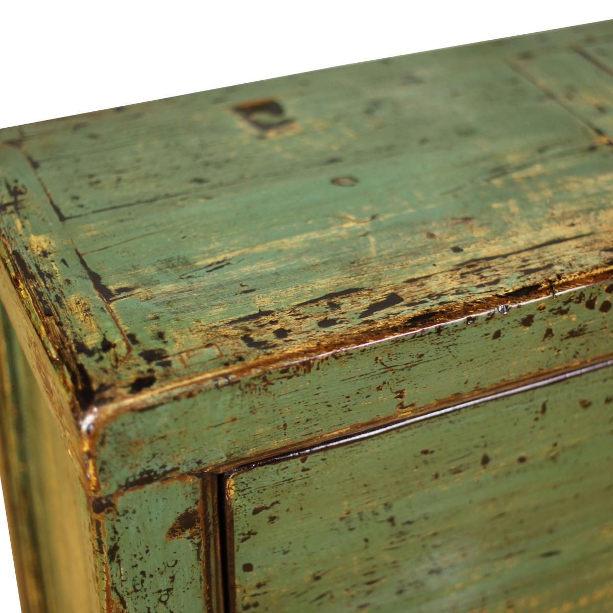 Introducing the Antique Painted Pine 2 Door Teal Sideboard a stunning blend of artistry and function. Crafted from durable pine, its distressed teal, yellow, and brown hues with a glossy finish suit many interiors whether contemporary or more traditional due to its distinctiveness. The interior boasts two roomy cupboards with shelves offering ample storage. This sideboard's enduring construction guarantees lasting use, making it a captivating addition to your space, effortlessly blending style, and practicality.