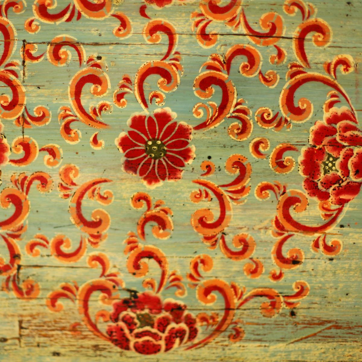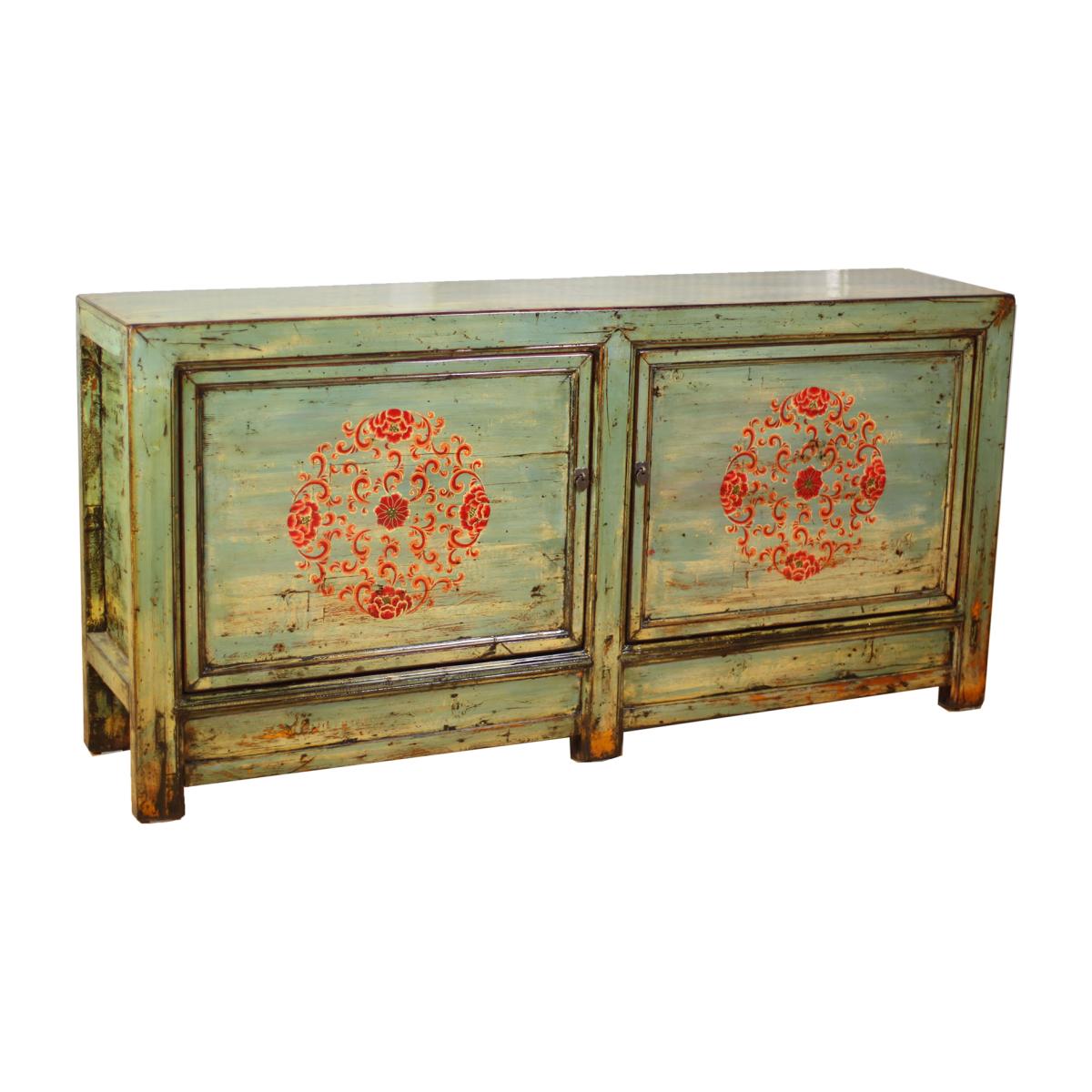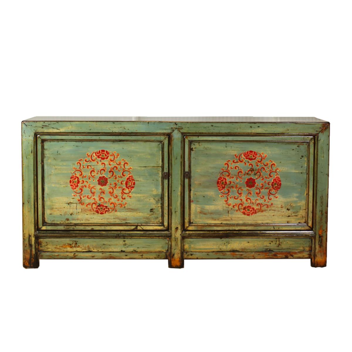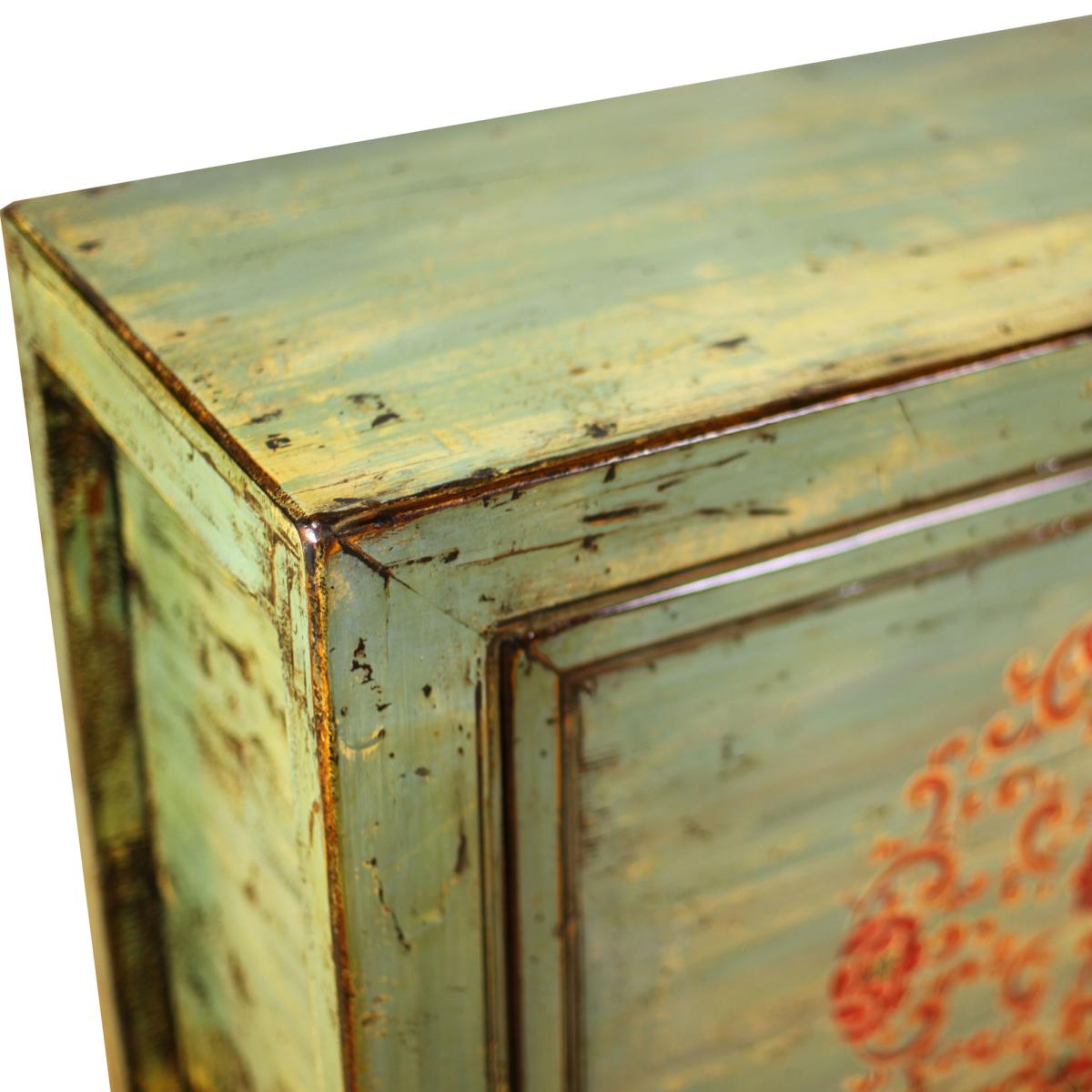 Bold and unusual, the Song Antique Painted Pine 2 Door Light Green Sideboard is ready to encourage character and attention to your home. The light green shade painted atop the reclaimed wood, is combined with a contrasting red painted pattern to the centre of each cupboard door, making for a daring design which is perfect for those who enjoy standing out from the crowd. Undoubtedly stylish, the Song Antique Painted Pine 2 Door Light Green Sideboard is every bit as practical; with an ample amount of storage space behind each door.