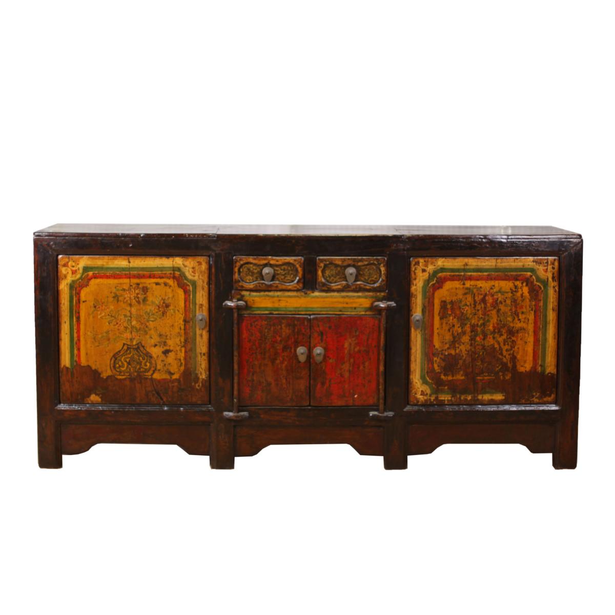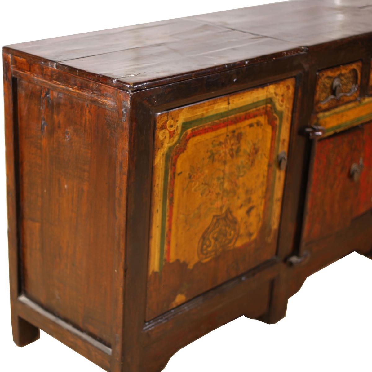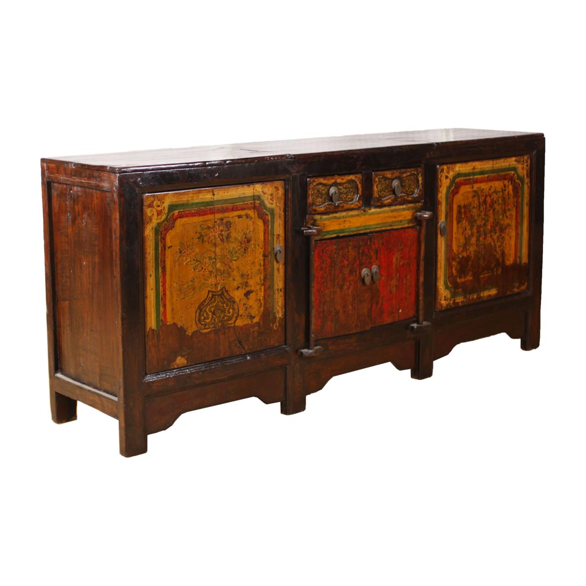 Capture a sense of timeless warmth with the Antique Painted Pine 4 Door 2 Drawer Brown Sideboard whether placed in your living or dining area, it exudes an enchanting and distinctive ambiance. The intricately painted floral design to its front in bold colours is a captivating feature that promises to be a focal point. Boasting three generous cupboards, and two small drawers this sideboard provides generous storage to maintain an organised space. Elevate your decor with this exquisite piece that effortlessly combines beauty and functionality.