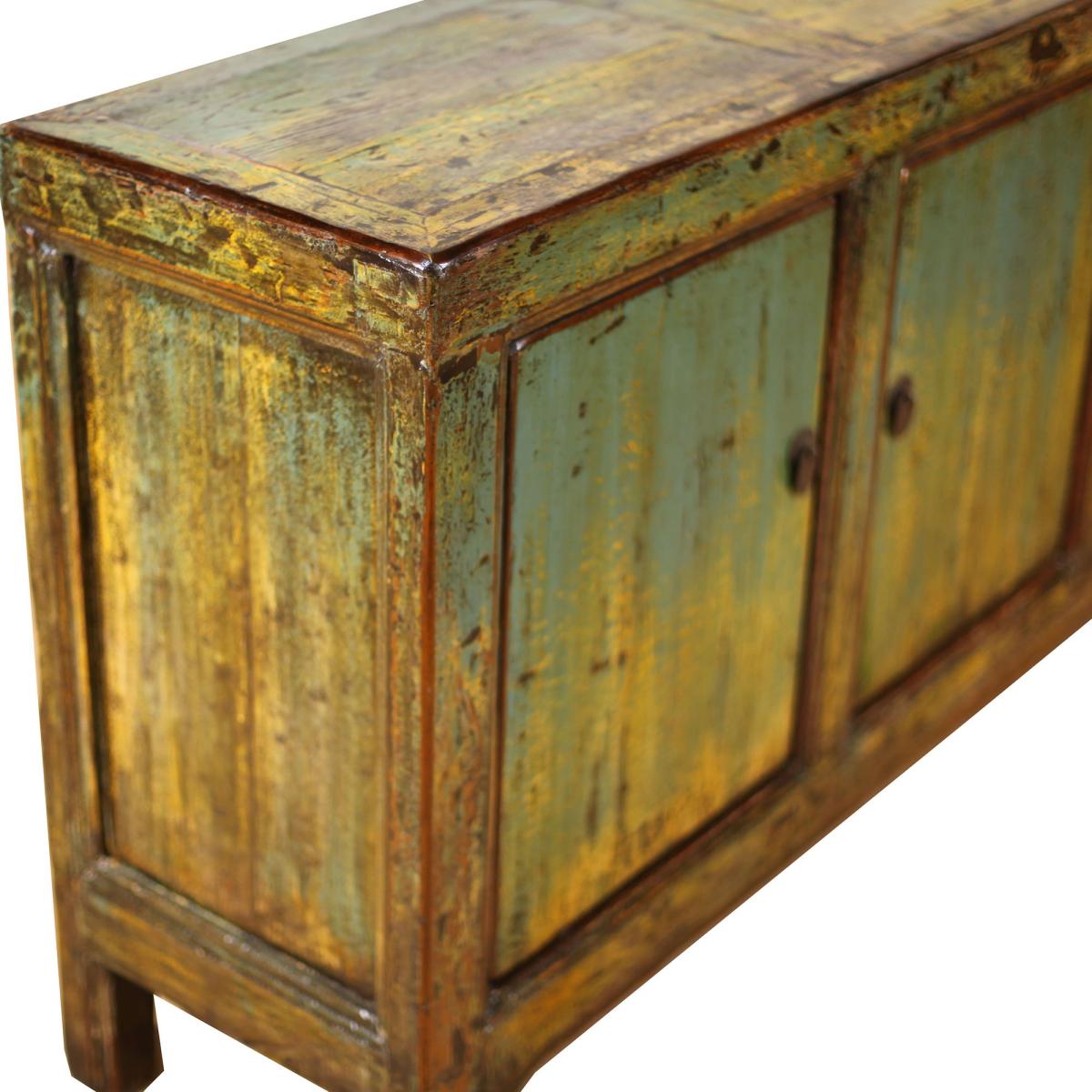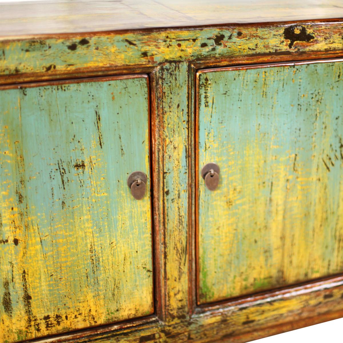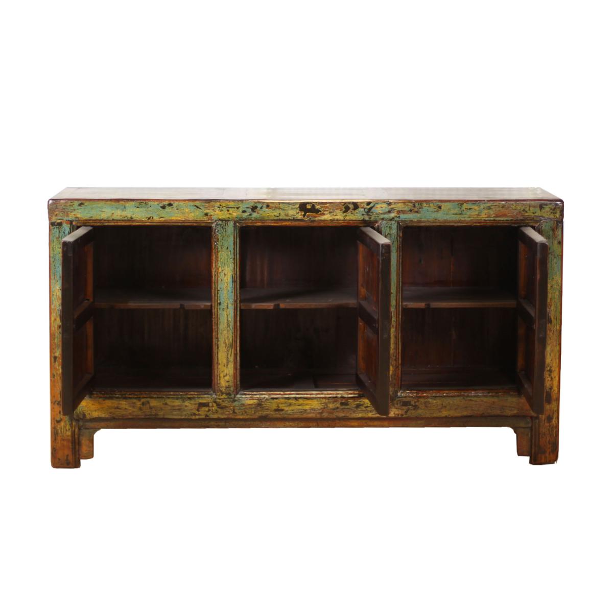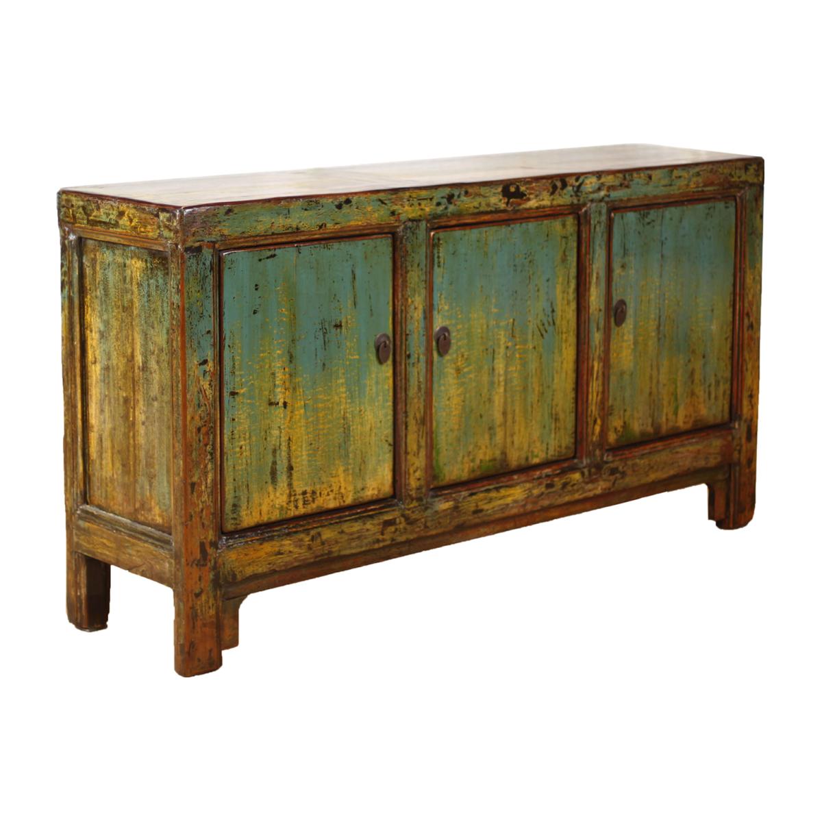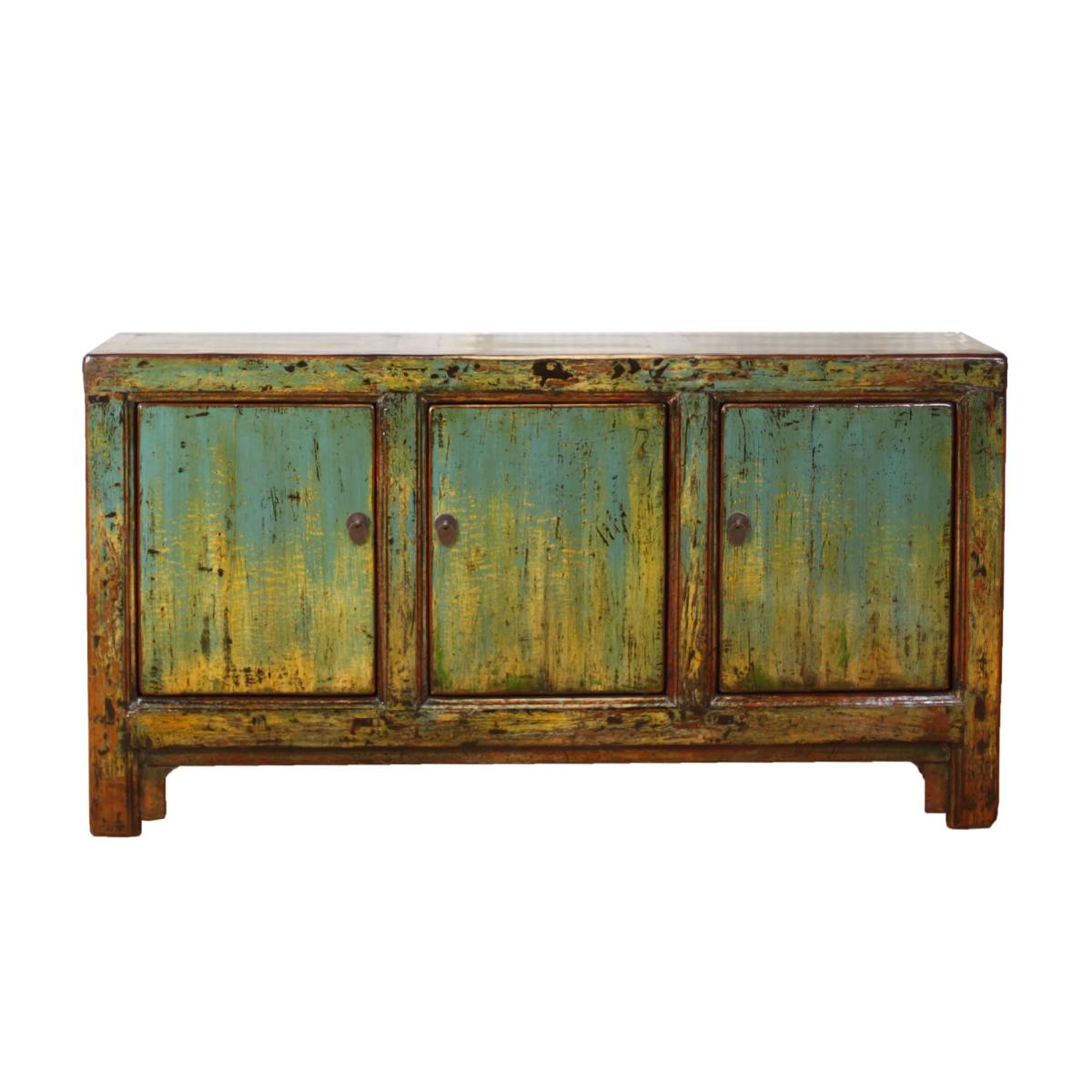 The Antique Painted Pine 3 Door Teal Sideboard is a breathtaking piece of furniture featuring distressed paint with a glossy finish that will add style to any room. Crafted from pine, it features faded hues of teal, yellow and browns that suits both traditional and contemporary interiors. Inside, there are three spacious cupboards with shelves, providing ample storage for any room it is placed in. Its durable construction ensures long-lasting use, making it a unique wonderful addition to your space.