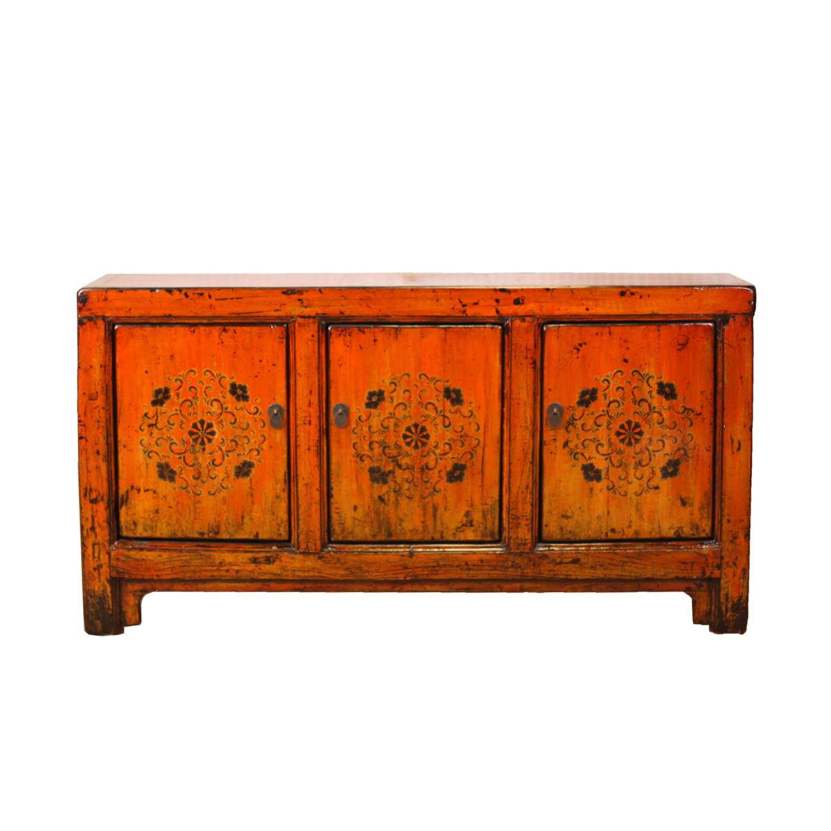 The Song Antique Painted Pine 3 Door Orange Sideboard makes for the perfect piece to add to your home, ideal if you love to collect pieces which are one of a kind and will become a conversation starter when guests visit. This beautiful Song Antique Painted Pine 3 Door Orange Sideboard boasts a striking shade of orange, with a sweet floral design to the centre of each cupboard. The stunning grain work and dainty metal handles all add to its undeniable charm.