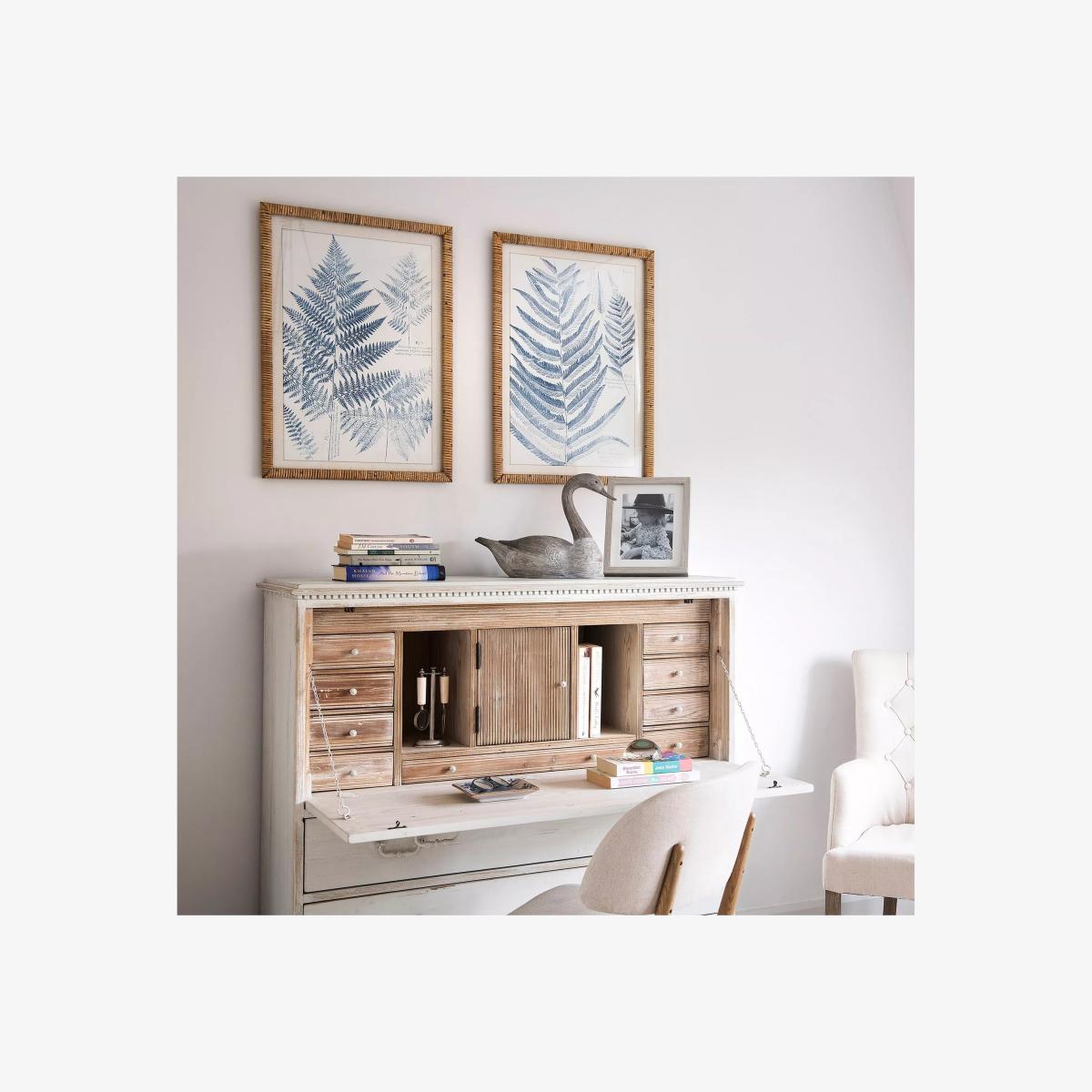 Beautiful rattan-framed blue fern prints, subtle yet bringing a pop of colour into your home. Positioned alongside one another or on top of each other, this glazed duo make an eye-catching pair. Have you thought about wall hooks and fittings?