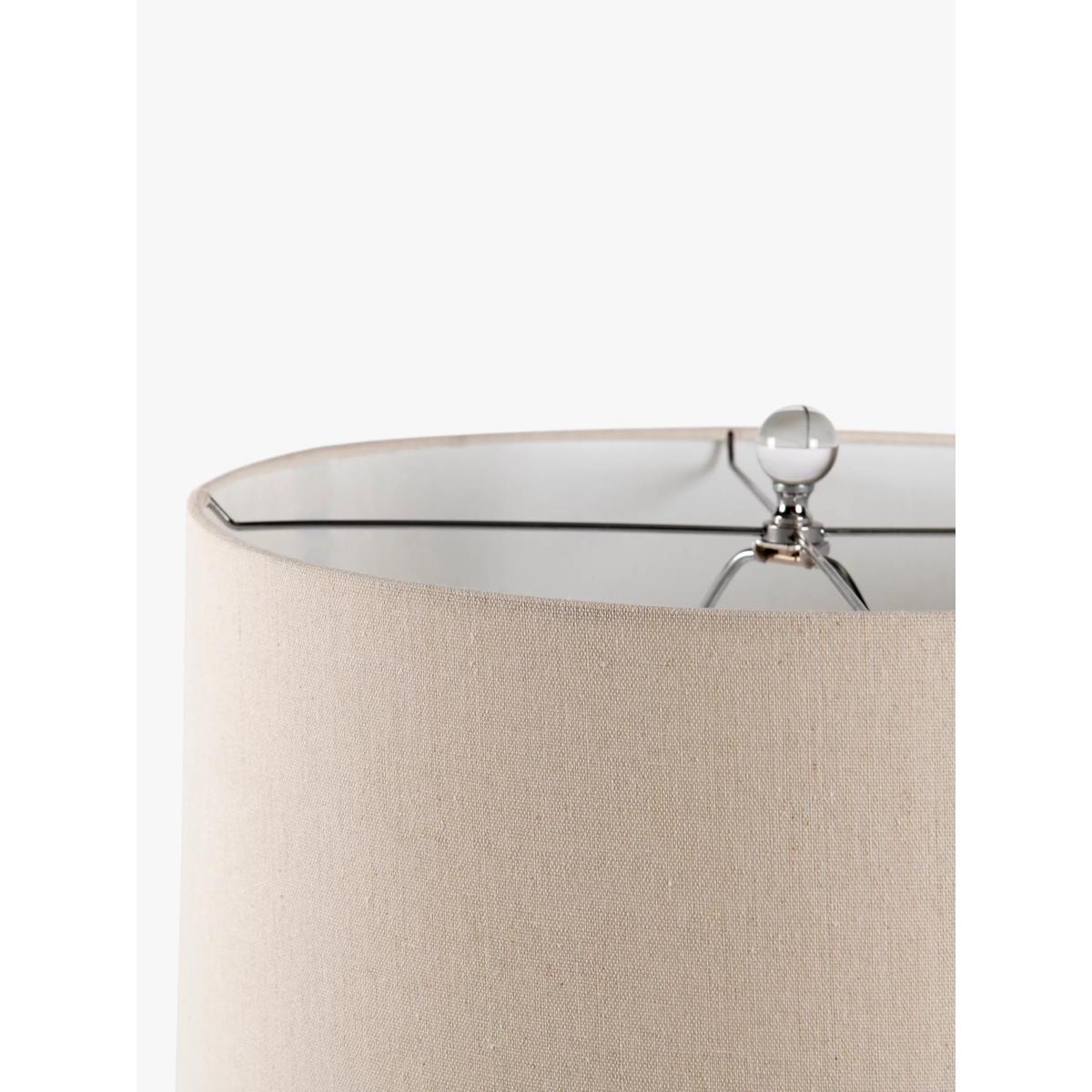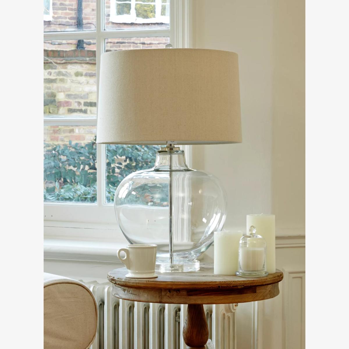 The beauty of this lamp is in its simplicity. A traditional silhouette, made timeless with a clear glass base and chrome effect hardware, topped off (literally) with a neutral tone shade. As this is hand blown glass you may see small bubbles in the glass, adding to the uniqueness and charm of each piece.