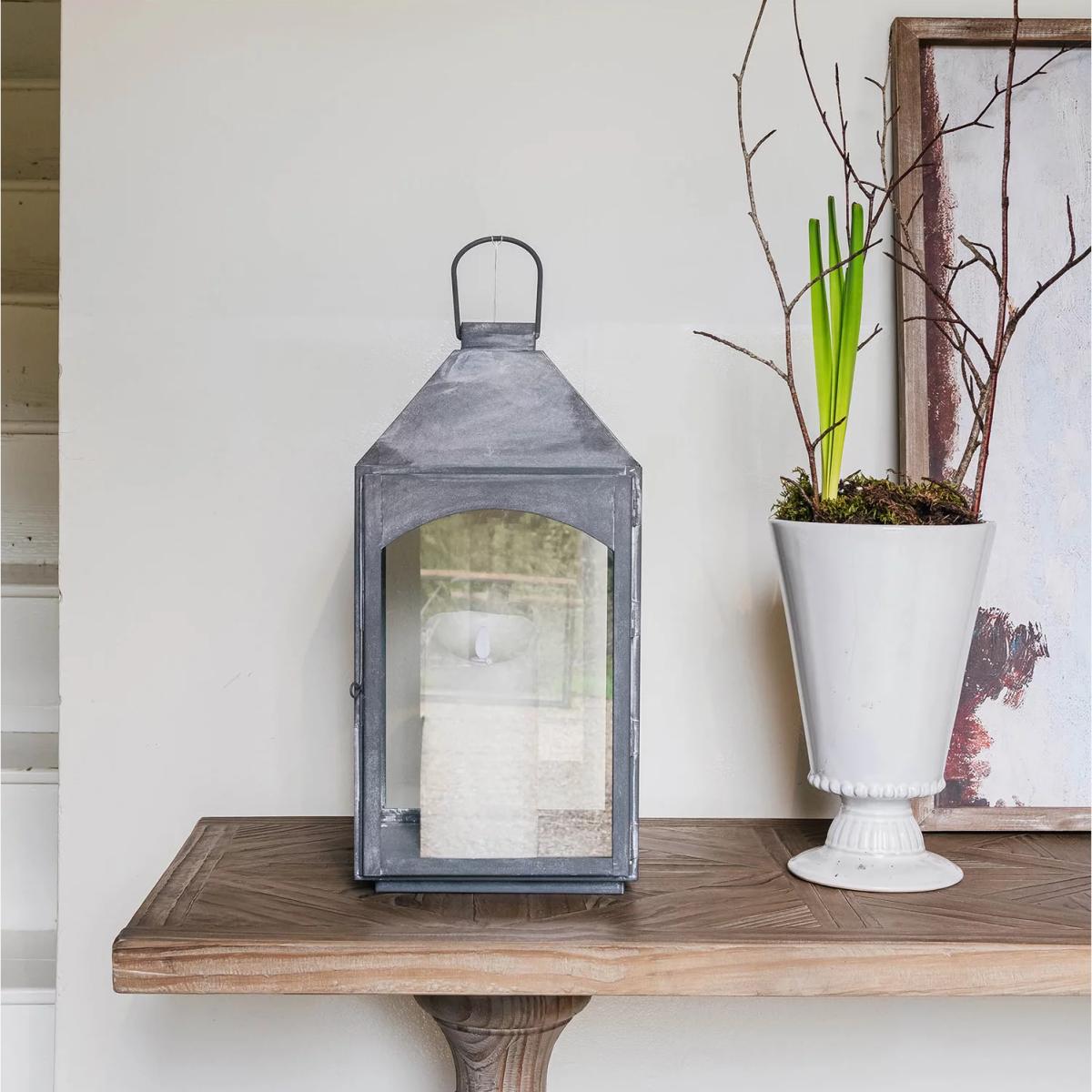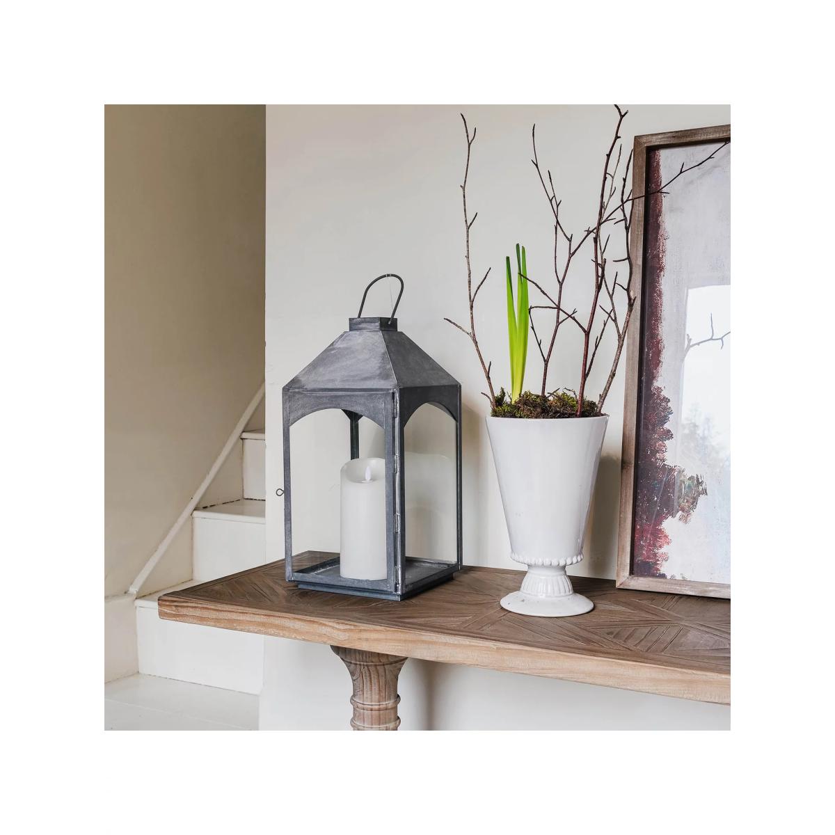 This lantern is a really versatile piece that adds a touch of understated industrial style to any space. I love how the grey finish gives it a contemporary edge, making it suitable for both modern and rustic interiors. It works well grouped on a mantle or sideboard, or even used as a centrepiece for outdoor gatherings. To style it effectively, consider pairing with neutral-toned candles or minimal greenery to keep the look clean and uncluttered. Its oversized silhouette makes it a statement piece, so it’s best placed where it can be admired without competing with other decor. Practical tip: ensure the candle fits snugly and the lantern is easy to move for safety and convenience.