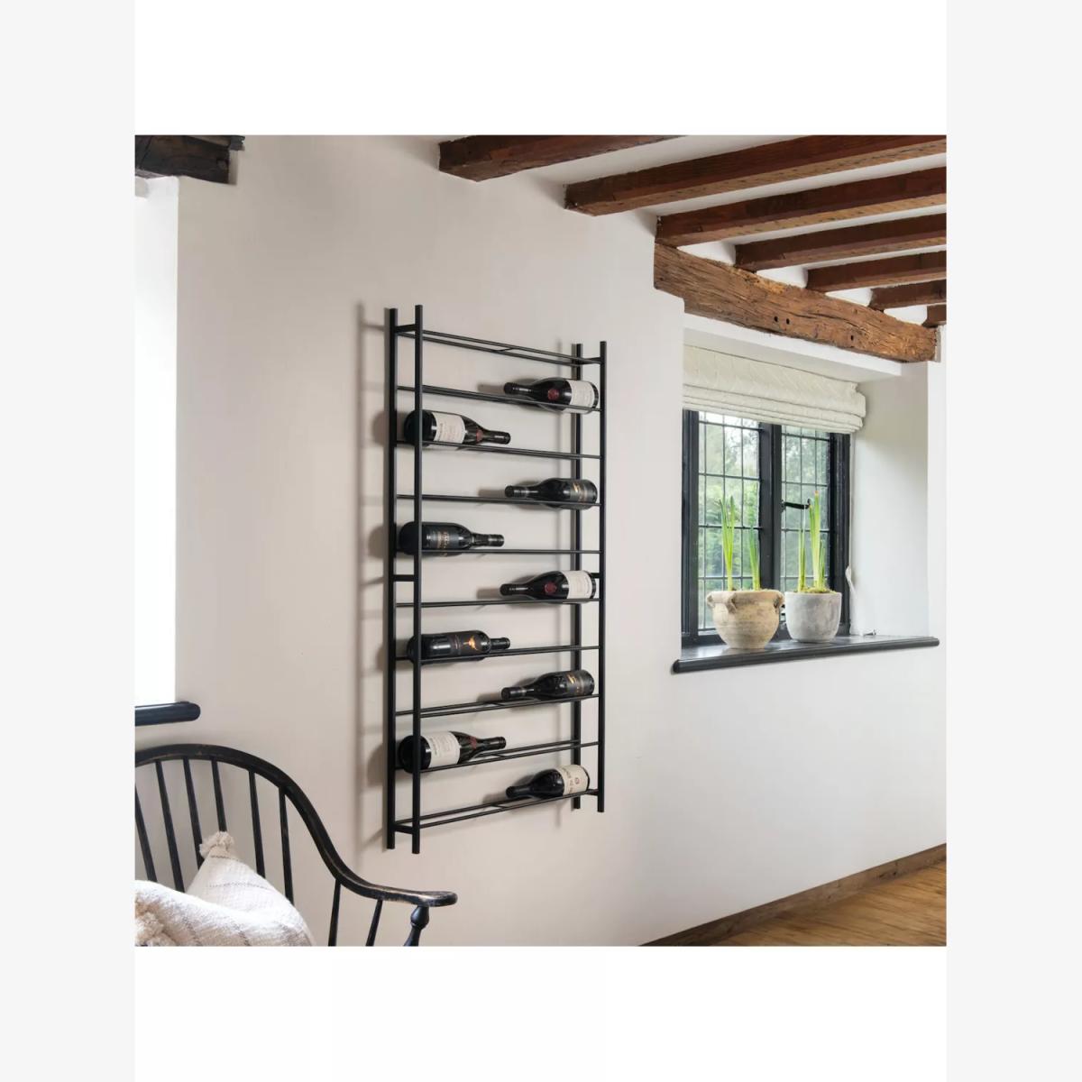 I’m a fan of the slim black iron rack - it holds 20 bottles without dominating the room and brings a neat, industrial edge to kitchens, dining areas or home bars. Its pared-back design works equally well in modern minimal, Scandi-inspired or exposed-brick spaces. For styling, stagger labels facing outwards to turn your collection into wall art, and keep it clear of splash zones by mounting over a sideboard or narrow console. Pair with a few simple glassware hooks or a small potted plant on a nearby shelf to soften the look, and always secure into studs or use strong wall anchors for a reliable, space-saving display.
