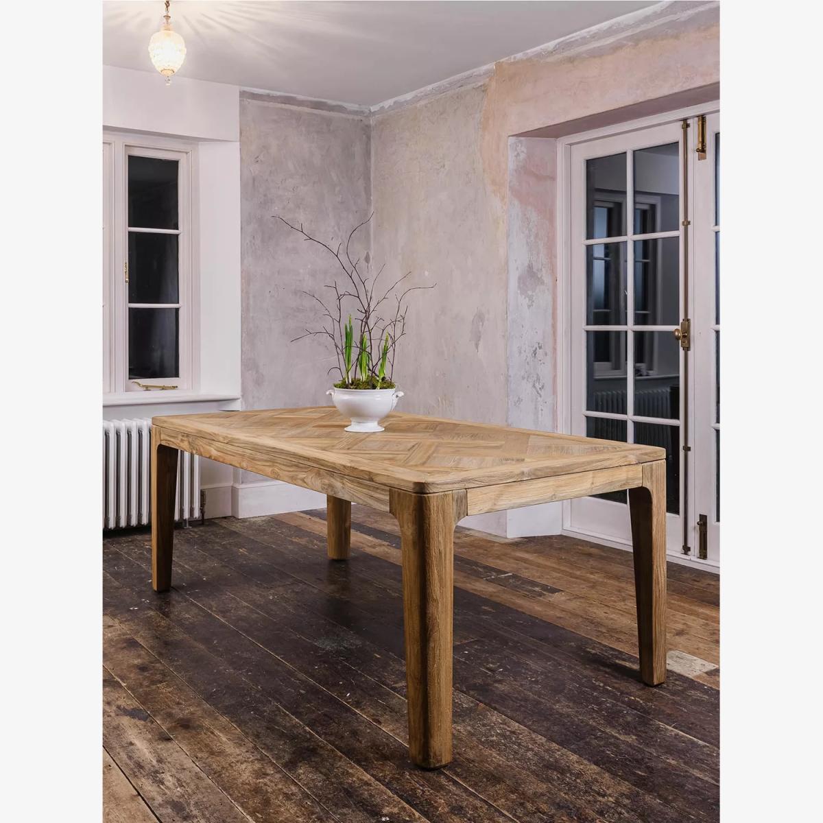 I love this rustic reclaimed teak table for its robust, natural character and versatility. Its sturdy, straightforward design makes it a great focal point in both modern and traditional interiors, especially those leaning towards a rustic, industrial, or Scandinavian aesthetic. It pairs beautifully with a mix of seating styles-from minimalist chairs to vintage armchairs-and works well in open-plan kitchens or dining areas where practicality is key. For styling tips, consider adding simple tableware, a neutral or textured table runner, or a statement centrepiece like a large vase or botanical arrangement. To keep the look balanced, complement the table's warmth with soft textiles and layered lighting that highlight its natural grain and raw finish.
