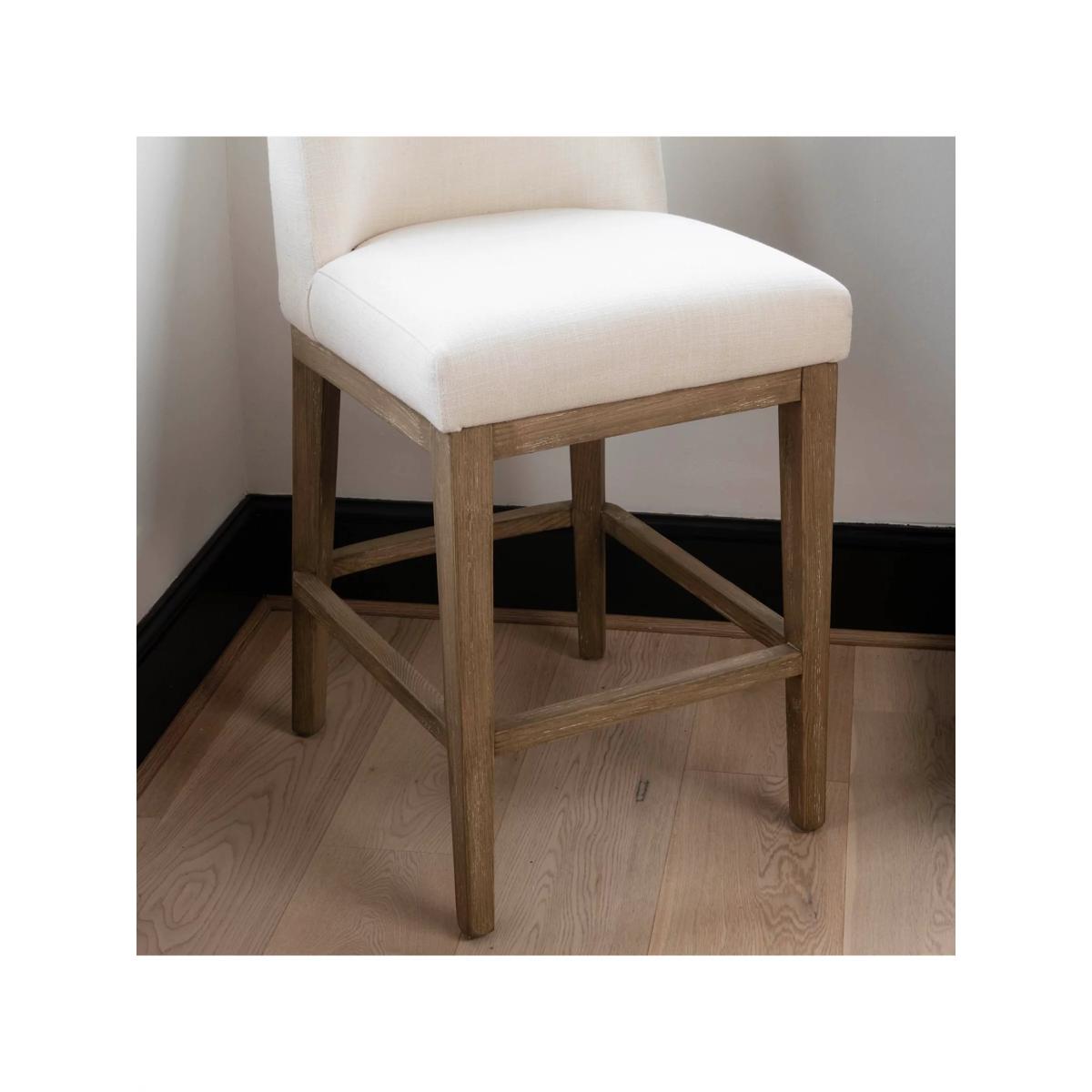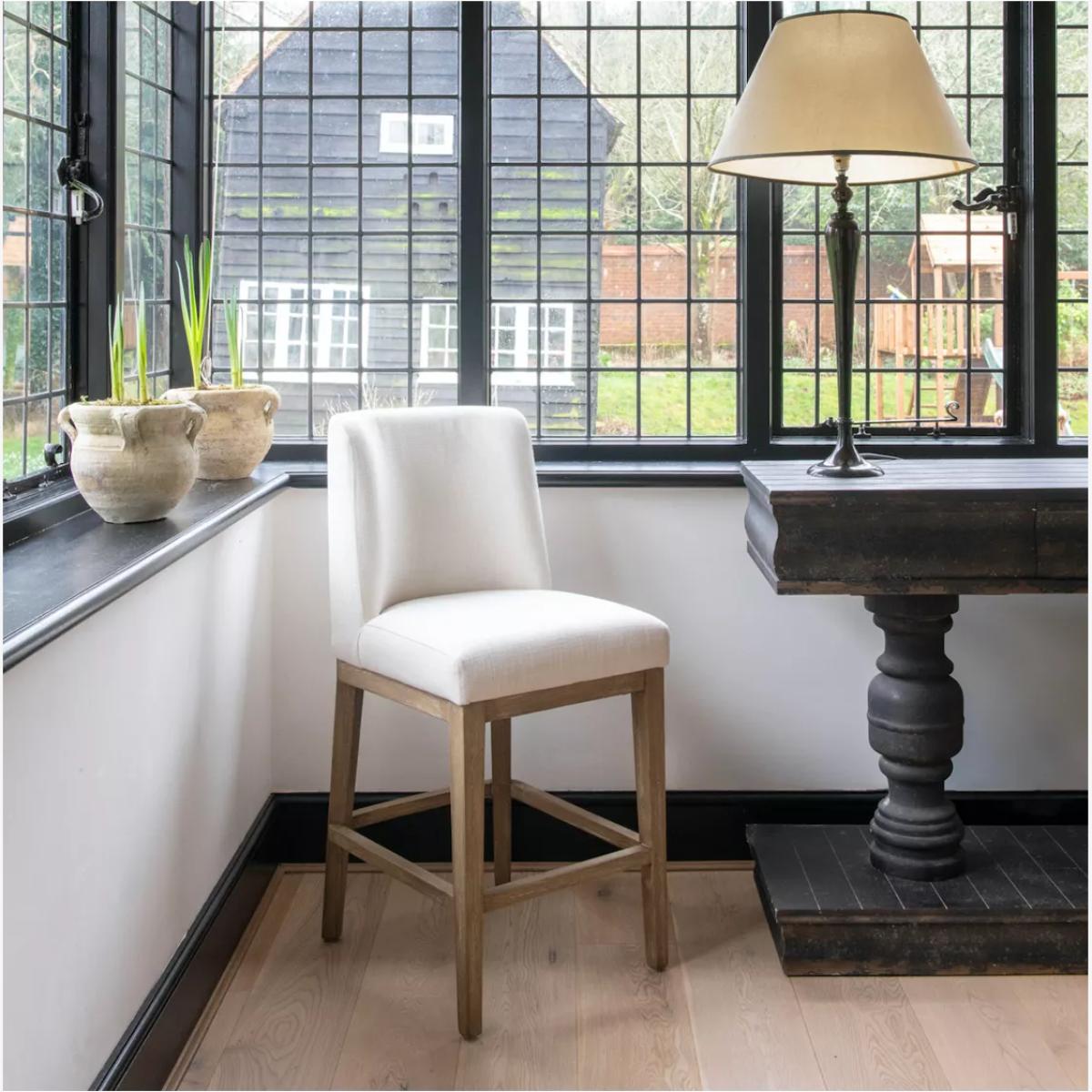 I’m a fan of the St James stool for its clean lines and neutral, oak frame - it slots effortlessly into Scandi-inspired, coastal or modern farmhouse kitchens. The subtle grain of the wood and soft, off-white upholstery keep the look fresh without competing with bolder splashbacks or worktop surfaces. For styling, pair it with brushed brass bar pendants and a few potted herbs along the sill to introduce texture and greenery. If you want a touch of pattern, switch in a seat pad or small lumbar cushion in muted stripes or checks; it’s an easy way to refresh the scheme seasonally without losing the stool’s pared-back appeal.