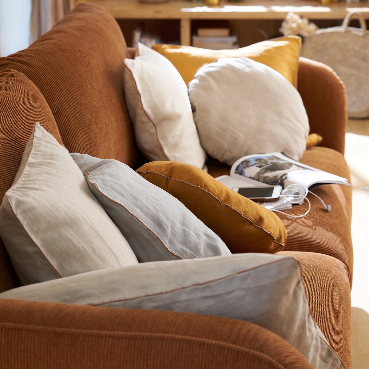 The Onega washed linen cover with a slightly wrinkled effect. Product Details • 100% pre-washed linen • Gold taped-edging trim • Concealed zip fastening. See the Terra cushion pad collection online. Sizes • 45 x 45cm • OEKO-TEX® Standard 100. Standard 100 certification by OEKO-TEX® tests textile products for harmful substances via an independent, international label.