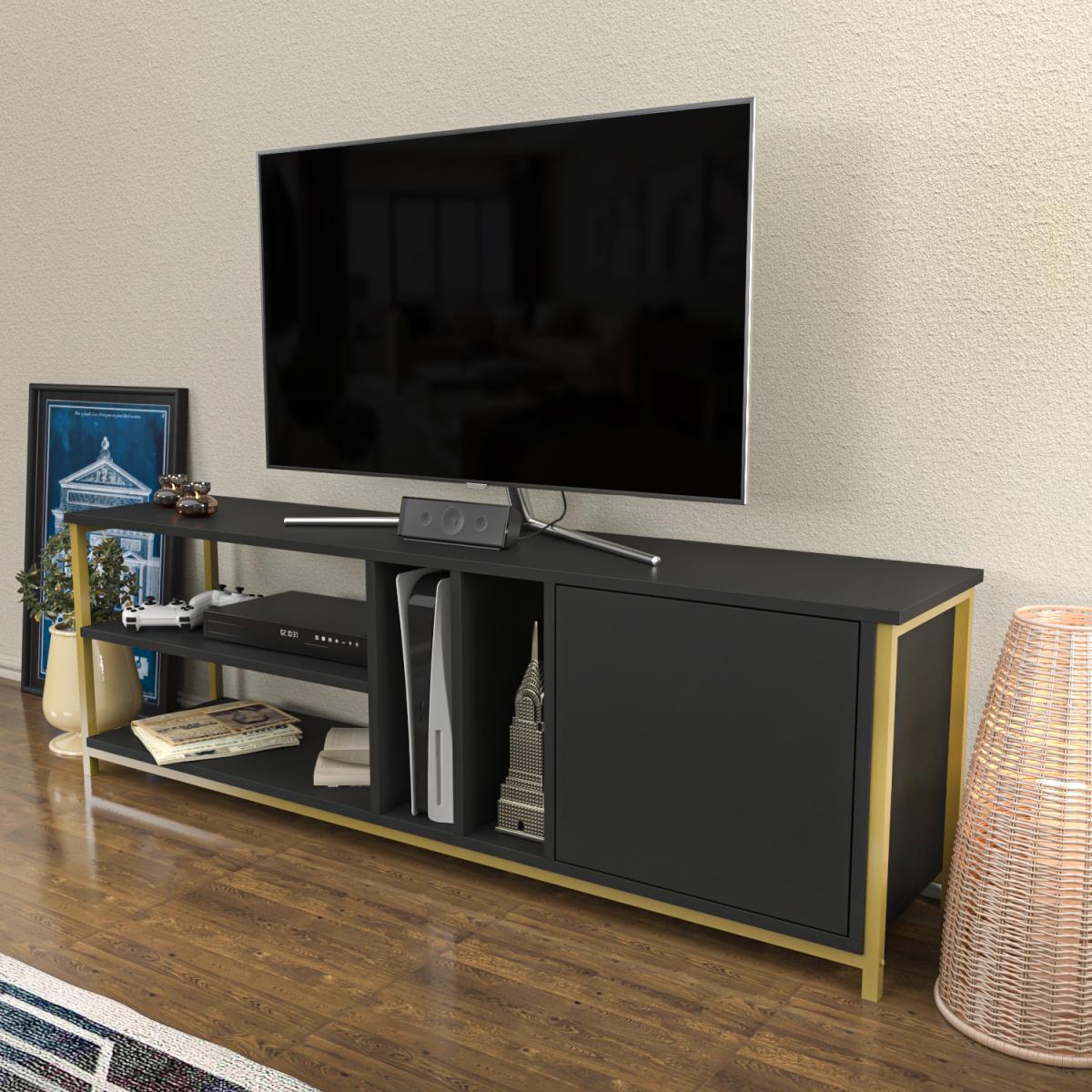 Oneida 160cm wide simple and minimalist media stand for TVs up to 72'' is defined by practical functionality and streamlined design. With four open shelves and one cabinet, this design offers huge storage space for your books, magazines, TV tuner, remote controller, or other media devices/collections. Top this design with a sleek flat-screen TV, then deck out open shelves with your favourite books and DVDs, framed family photos, while using horizontal open shelves for your new video game console, tuner, and cable box. The cabinet is opened without a handle through a simple but innovative solution. The media stand is made of 18mm thick quality melamine coated particle board and banded with first-class PVC edge banding tape. The stand is also enhanced and strengthened with metal legs which makes it sturdy and durable. Metal legs are coated with scratch and impact-resistant industrial static paint. It is manufactured using eco-friendly and health-friendly TSE-certified materials. The product will be delivered to the customer in the original package as disassembled. It is designed to be assembled by the customer easily using simple household tools like a power drill or screwdriver. Assembly instruction and installation hardware are included in the package. For fast and error-free installation, product parts are numbered with stickers in accordance with the assembly guide.