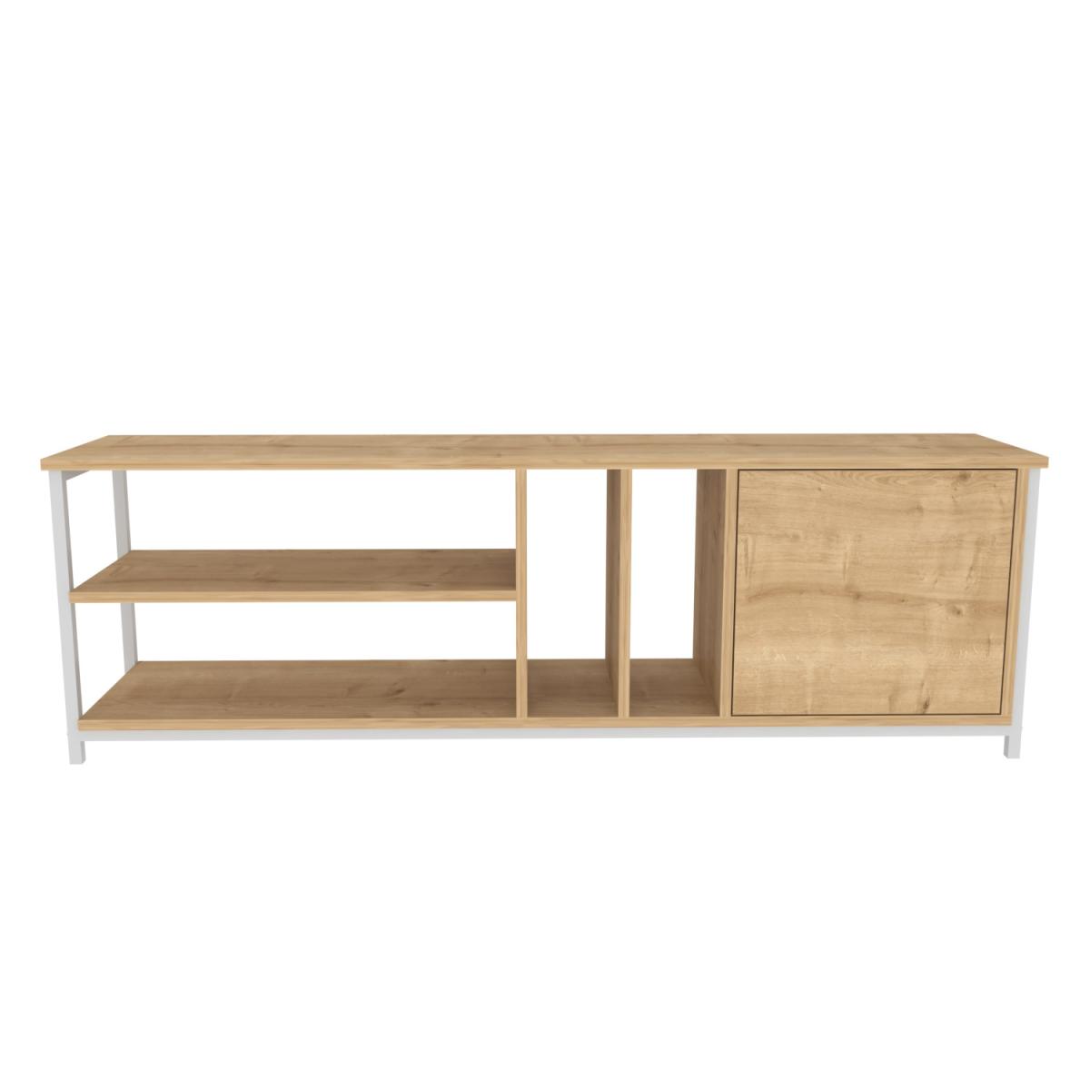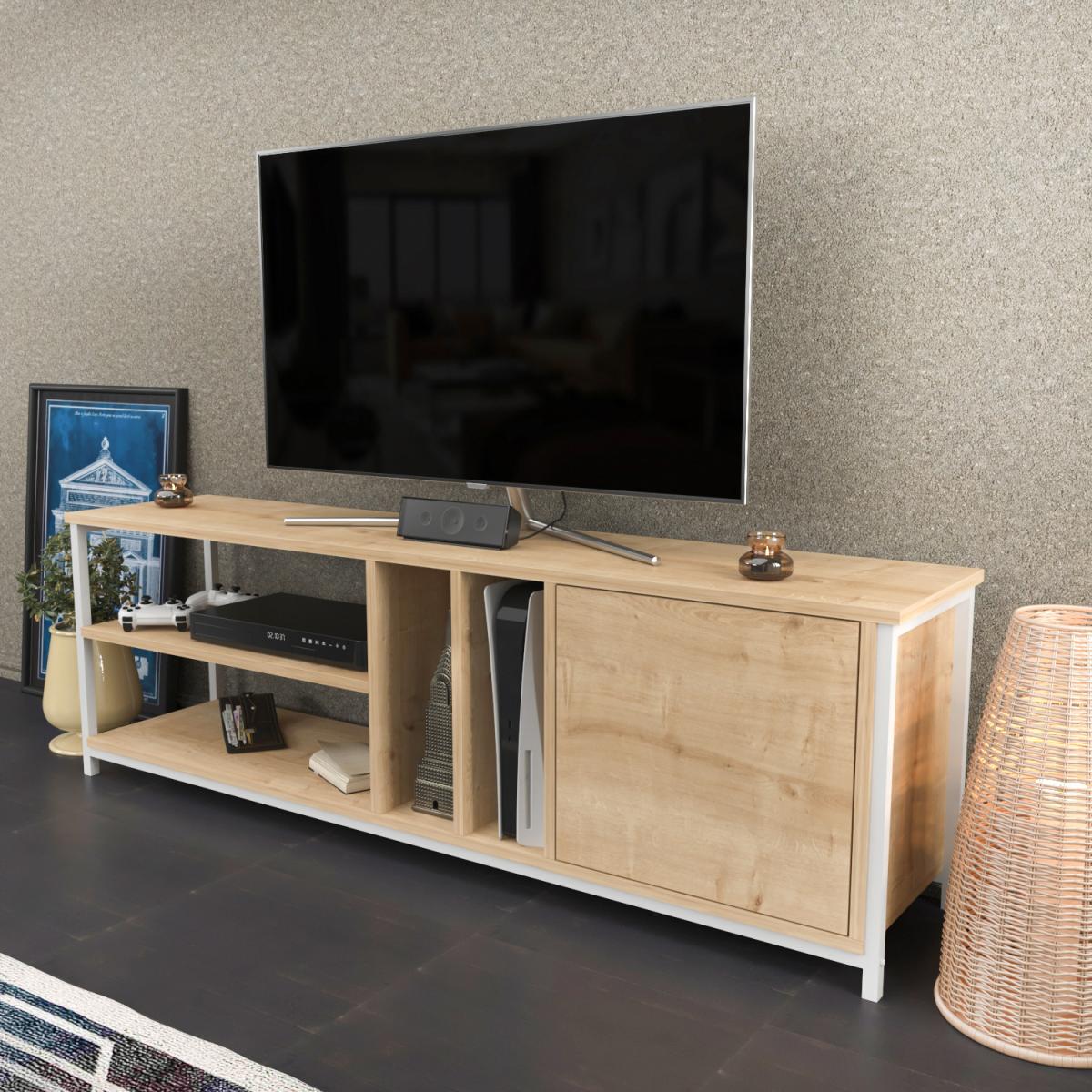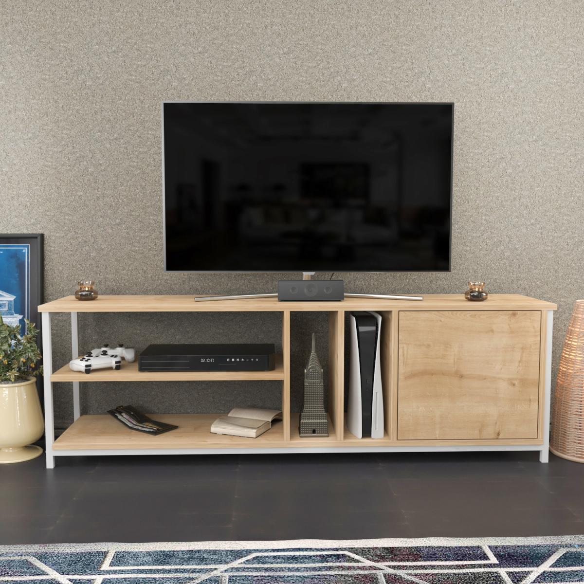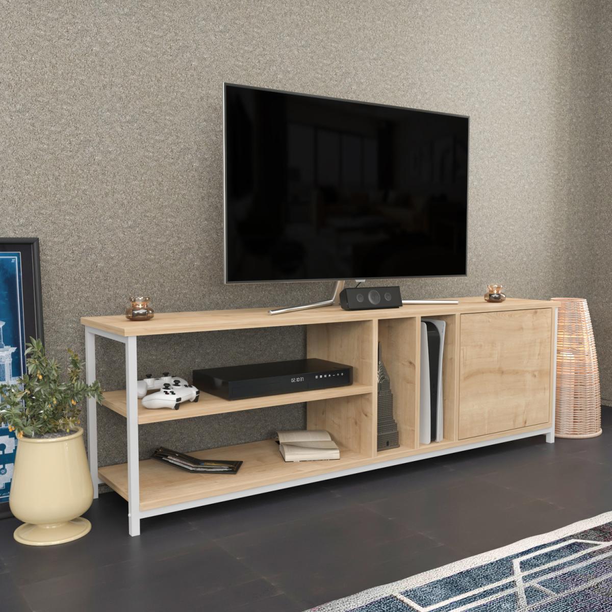 Oneida 160cm wide simple and minimalist media stand for TVs up to 72'' is defined by practical functionality and streamlined design. With four open shelves and one cabinet, this design offers huge storage space for your books, magazines, TV tuner, remote controller, or other media devices/collections. Top this design with a sleek flat-screen TV, then deck out open shelves with your favourite books and DVDs, framed family photos, while using horizontal open shelves for your new video game console, tuner, and cable box. The cabinet is opened without a handle through a simple but innovative solution. The media stand is made of 18mm thick quality melamine coated particle board and banded with first-class PVC edge banding tape. The stand is also enhanced and strengthened with metal legs which makes it sturdy and durable. Metal legs are coated with scratch and impact-resistant industrial static paint. It is manufactured using eco-friendly and health-friendly TSE-certified materials. The product will be delivered to the customer in the original package as disassembled. It is designed to be assembled by the customer easily using simple household tools like a power drill or screwdriver. Assembly instruction and installation hardware are included in the package. For fast and error-free installation, product parts are numbered with stickers in accordance with the assembly guide.