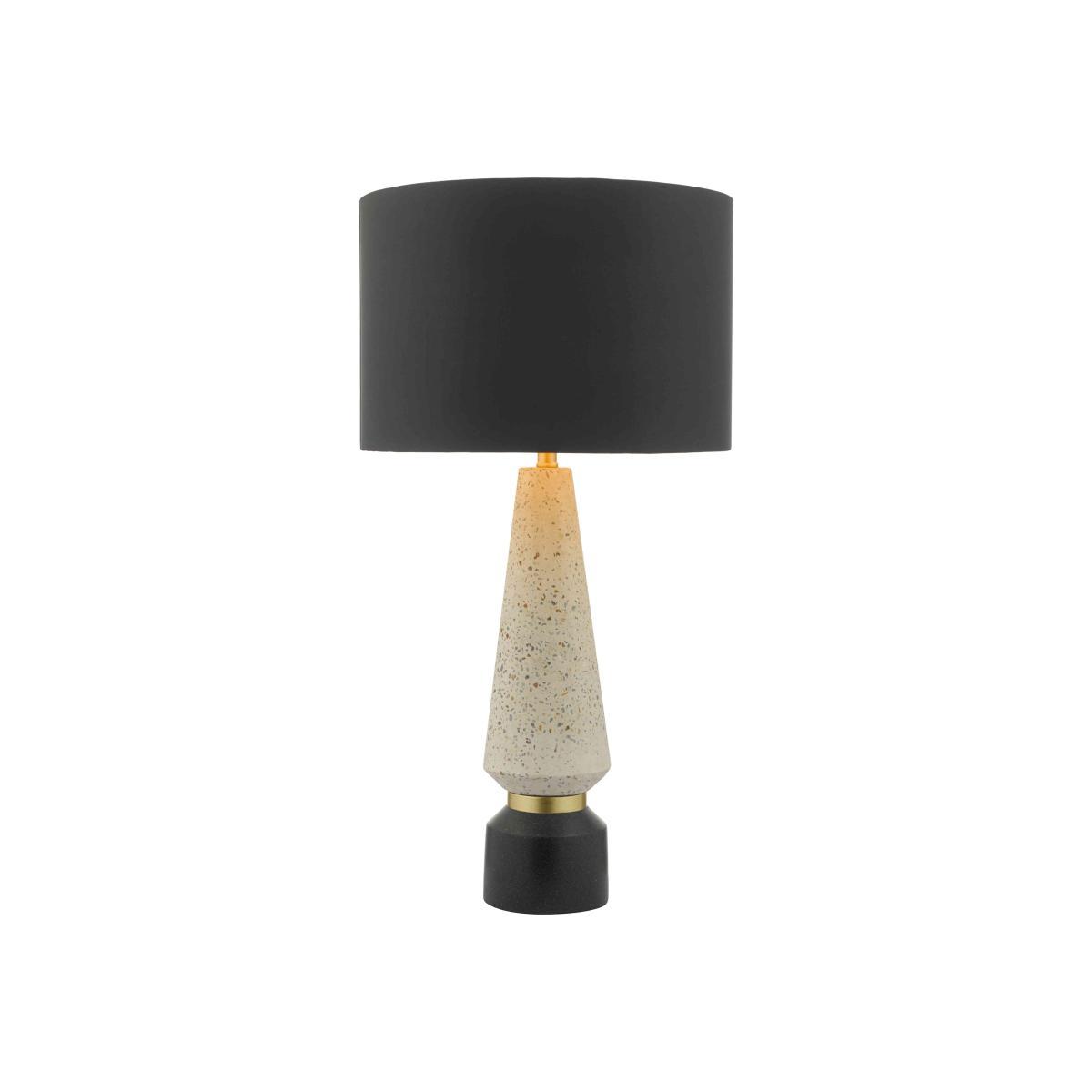 Add some bold modern style to your space with the Onora table lamp. The intricate terrazzo base sets the scene, with indulgent touches, such as gold details and faux silk. Why you’ll love it. Sleek, eye-catching table lamp. Broad mix of materials, from terrazzo to faux silk. Complete with black braided cable. Bold interior statement. Made with care for Furniture Village. What you need to know. Terrazzo base, with black and gold detailing. Black faux silk drum shade with matt gold inner. 1 x 60W max LED bulb recommended. Dimensions. Height: 58cm (22.83 in). Width: 30cm (11.81 in).