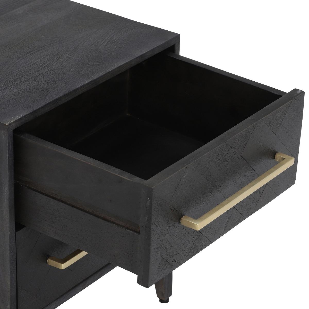 Design. The perfect place to store away personal belongings and keep your bedroom looking clean and tidy. The Onyx 2 Drawer Bedside is a functional and stylish item which will add a moody undertone to your space. Parquet detailed fronts and brass handles work together to create an opulent look which will suit a contemporary or traditional home.