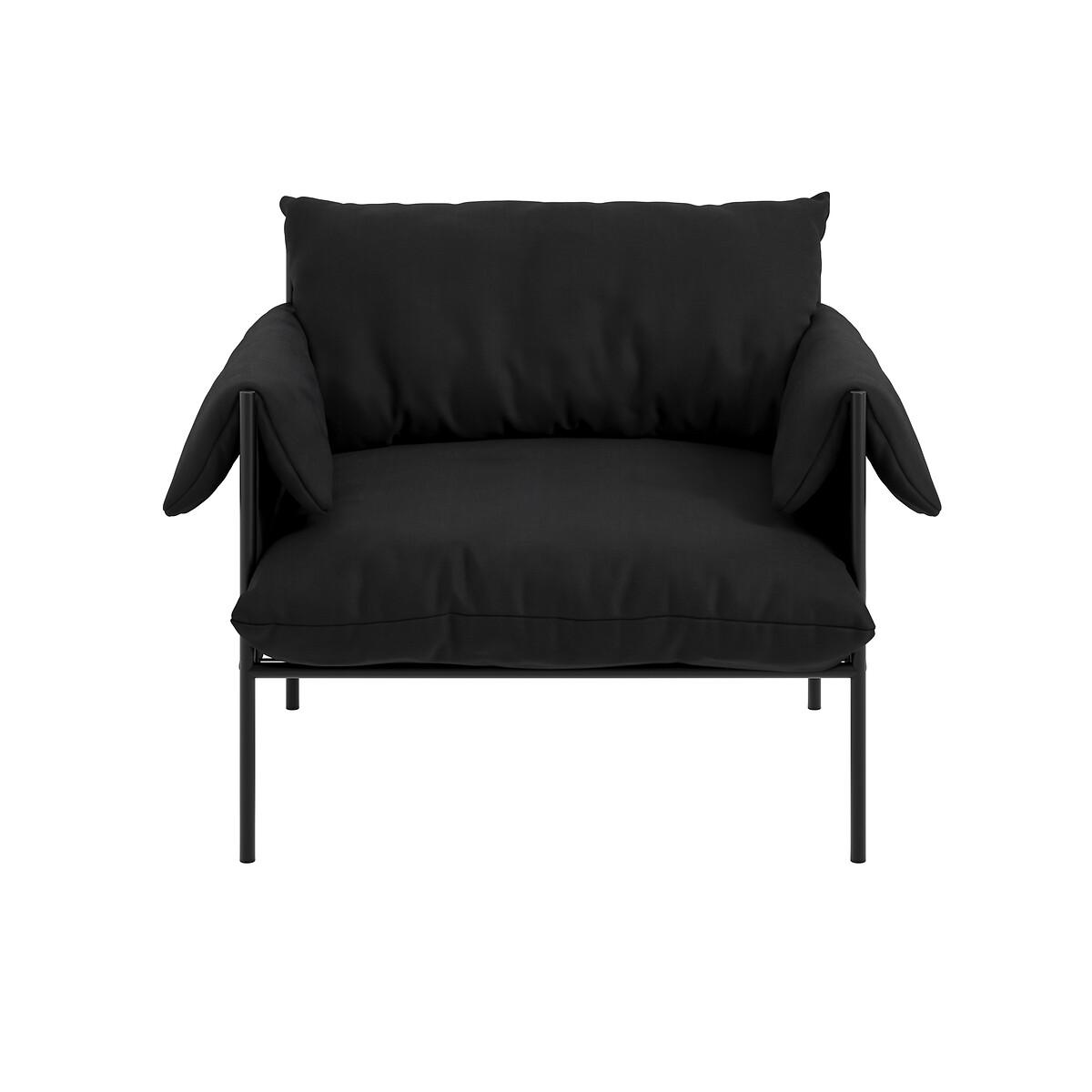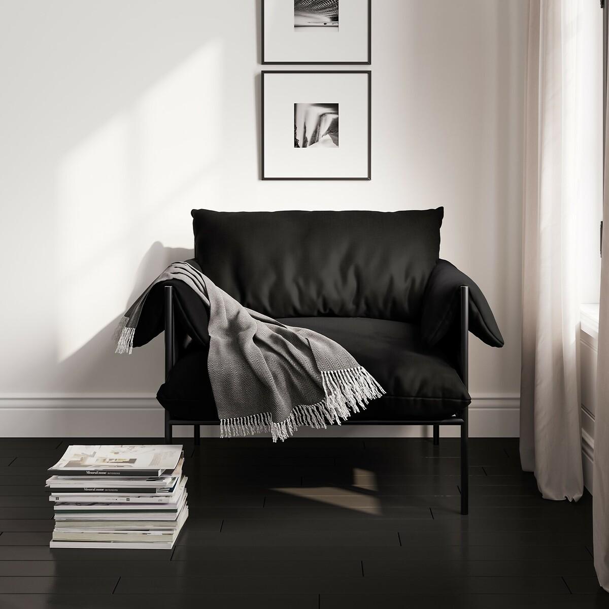 Elevate your living space with the elegant Onyx Accent Chair. Sleek, contemporary design is paired with beautifully matte woven cushions to create an opulent look and feel. Soft and squishy fillings create a cosy sitting spot perfect for any bedroom corner or living room. An unusual design feature in the form of soft pillowed arms adds extra comfort. A sturdy metal frame ensures durability, while the chic silhouette adds a touch of sophistication to your home. Product Details • Upholstered in woven fabric with flat pile and smooth texture • Sleek black metal frame and legs • Cushioned armrest • Dacron wrapped foam cushions - dacron has the benefit of eliminating any wrinkles ensuring your cushions always look neat • Soft level of comfort • Delivered fully assembled • Care advice - Clean damp cloth or duster. Product Composition - House Weave, Metal, Foam. Product Dimensions • Overall dimensions - 83 cm x 100 cm x 83 cm , Weight - 14 KG • Seat Height - 43 cm • Back height - 67 cm • Seat width - 67 cm • Seat depth - 63 cm Package Dimensions - 81 cm x 76 cm x 71 cm, Weight 17 KGPlease note: this product cannot be be delivered to all Offshore Islands, Scottish Highlands, Northern Ireland or Republic of Ireland. This product will be dispatched by one of our trusted suppliers. You’ll be contacted by their selected courier about your delivery.