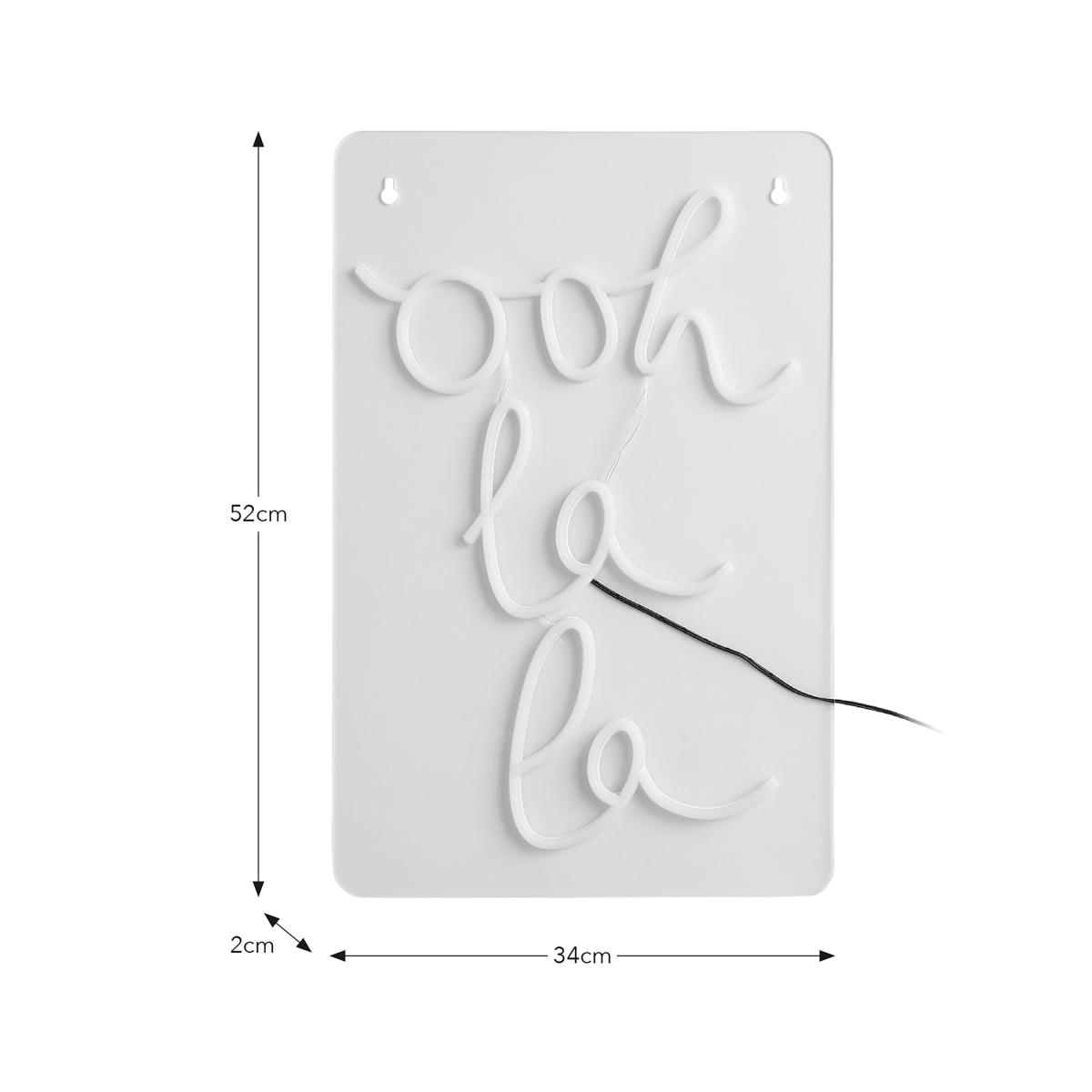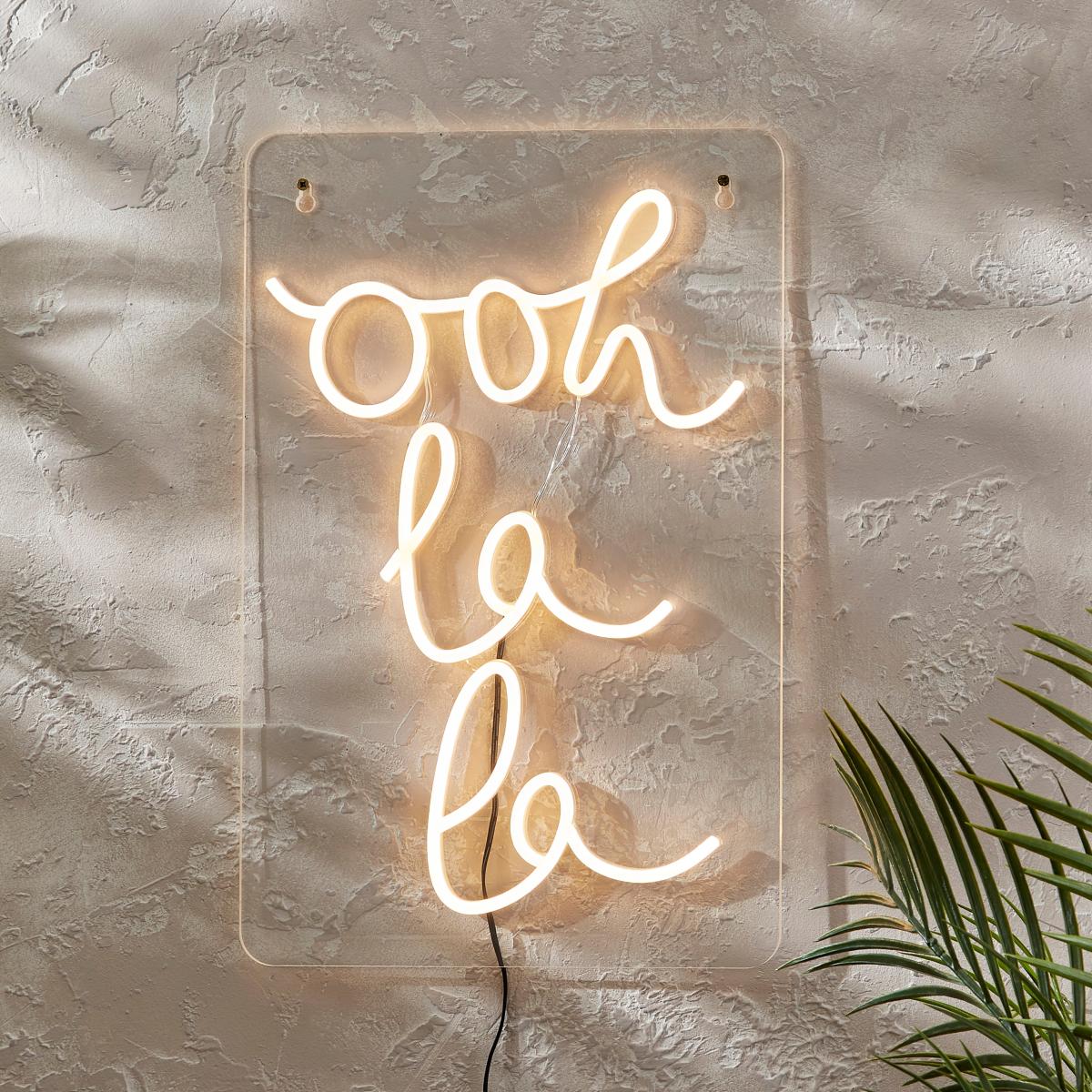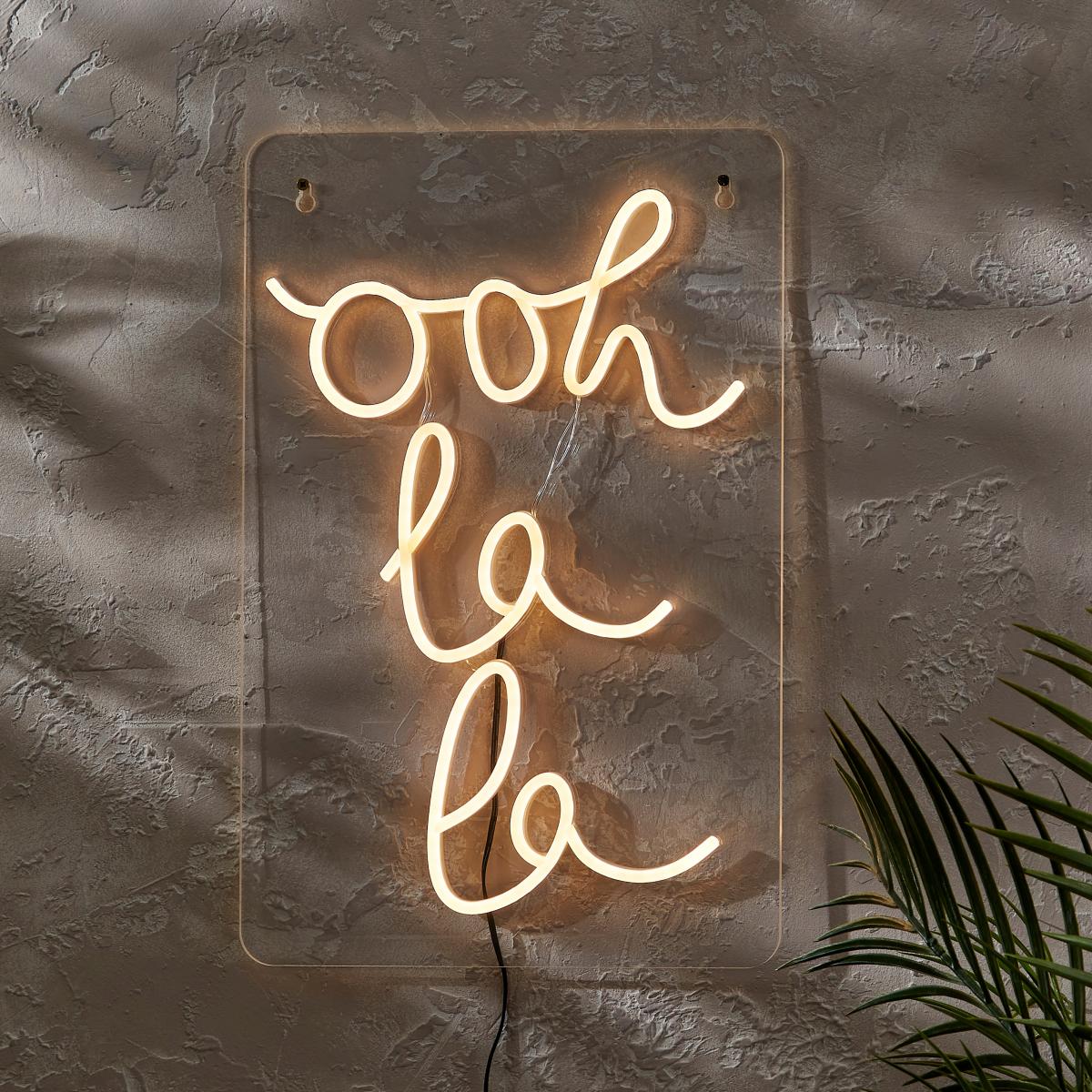 * 'Ooh La La' Wording* Soft LED Strip* Warm White Glow* Waterproof Plug* Suitable for Indoors & Outdoors Add a touch of French flair with the Ooh La La Neon Sign. Modern and chic, it boasts a warm white glow from its soft LED strip, creating a gorgeous ambient light. Waterproof and suitable for both indoor and outdoor use, this sign is not just a statement piece; it's an experience.
