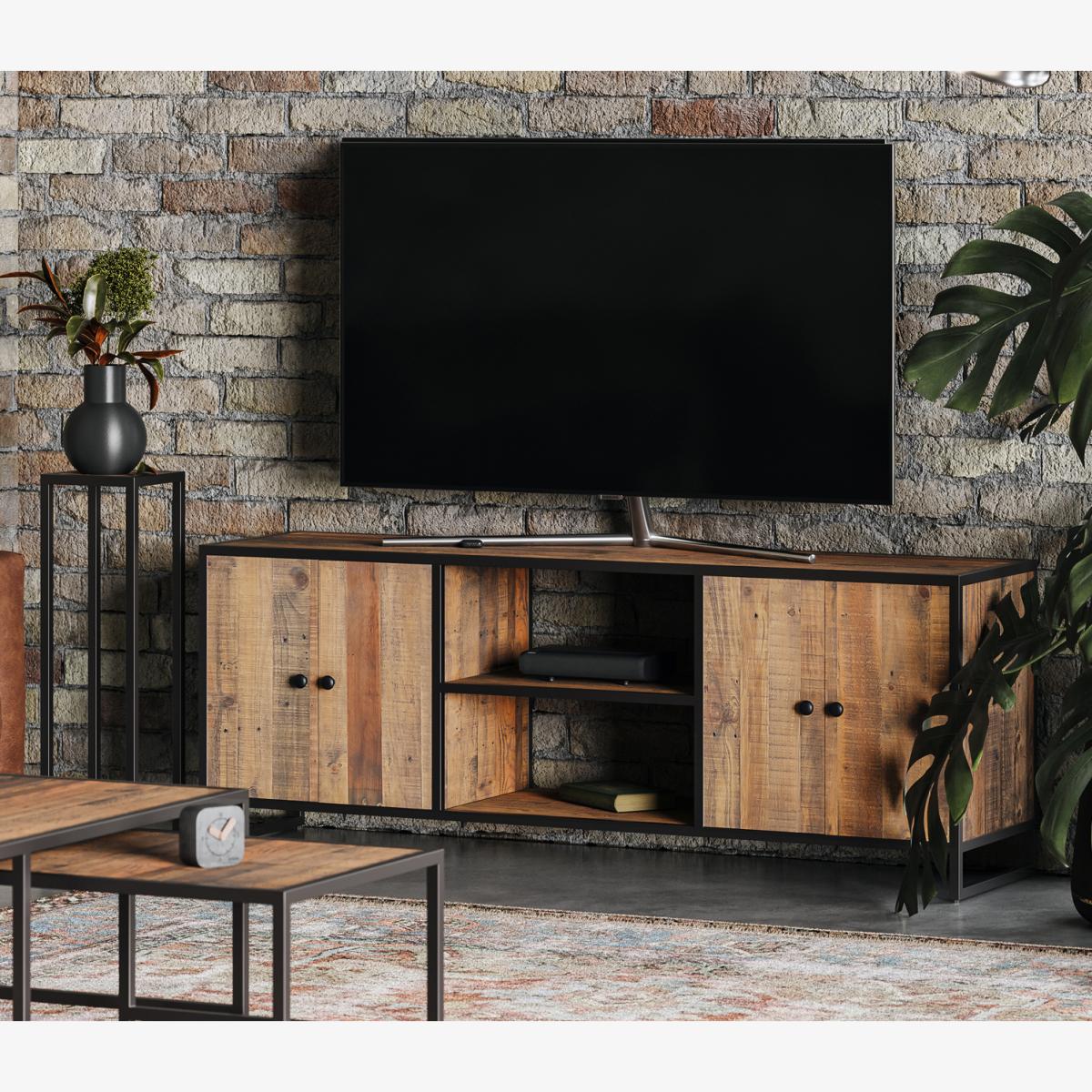 The Ooki Extra Large Widescreen Television Cabinet offers ample space for an 85-inch TV and is versatile enough to stand alone or be combined with other pieces in the range to create a stylish media shelf unit. As part of the modular Ooki collection, you have the freedom to rearrange and customize your furniture layout to suit your space perfectly. Featuring double cupboards on each side, this cabinet provides ample storage for DVDs, remotes, and gaming equipment, while the two open shelves are ideal for a soundbar and other media devices. Crafted from reclaimed wood, the Ooki collection boasts a unique distressed finish, creating an authentic vintage look that adds character to your home decor. Using reclaimed materials not only reduces waste but also adds a sense of history and uniqueness to each piece. The warm, natural brown tone of the rustic wood complements various colour schemes and interior styles, while panel effect detailing adds depth and visual interest. Complementing the wood's texture, the smooth matte finish of the metal accents provides a modern contrast. The Ooki collection blends industrial characteristics with a sturdy design and contemporary look. Delivered fully assembled for your convenience, the Ooki extra-large widescreen TV cabinet comes with a five-year manufacturer's guarantee, ensuring durability and quality craftsmanship.