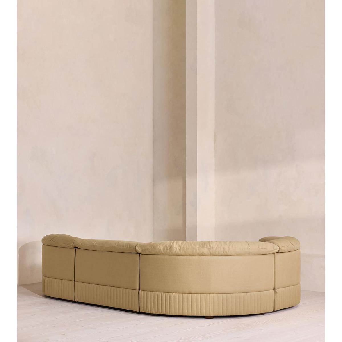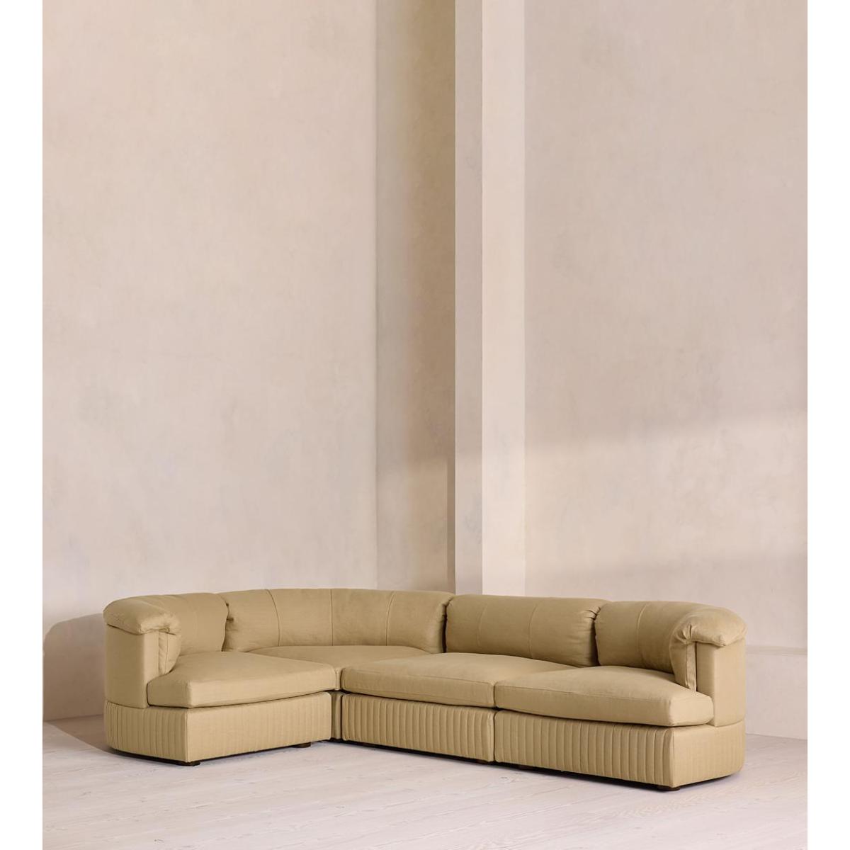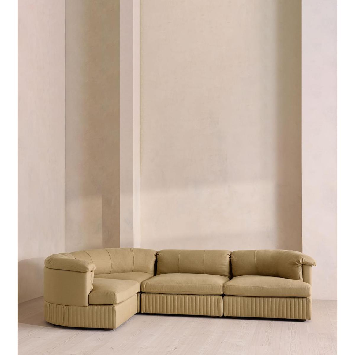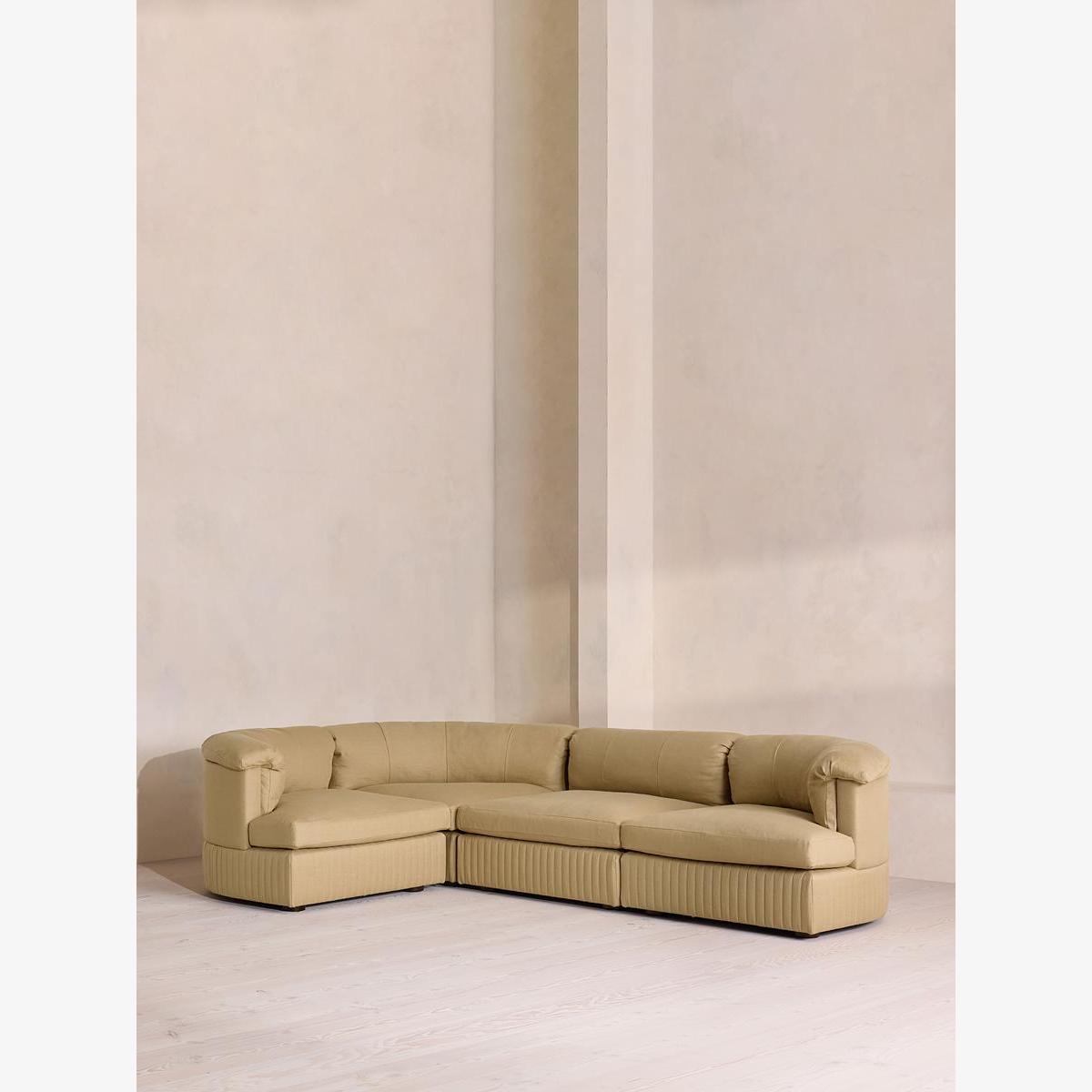 Made in the UK, a generous, rounded silhouette is finished with feather-wrapped cushions in linen upholstery. Designed to perfectly adapt to your space, our L-shaped Oona modular sofa is made to create the ideal configuration for your living requirements. Comfortable feather-wrapped seat and back cushions are fully upholstered in linen, complemented by channelled upholstery at the base.