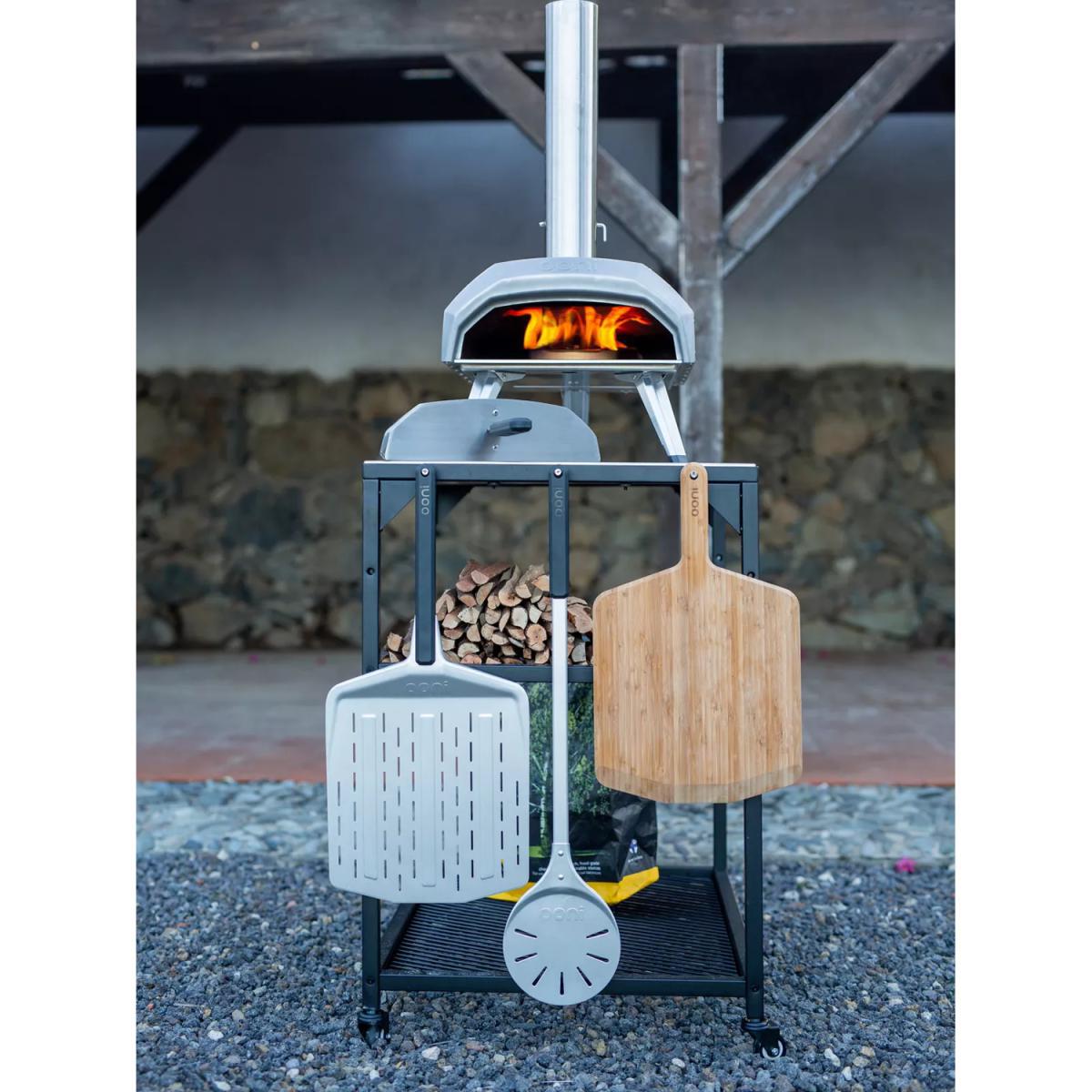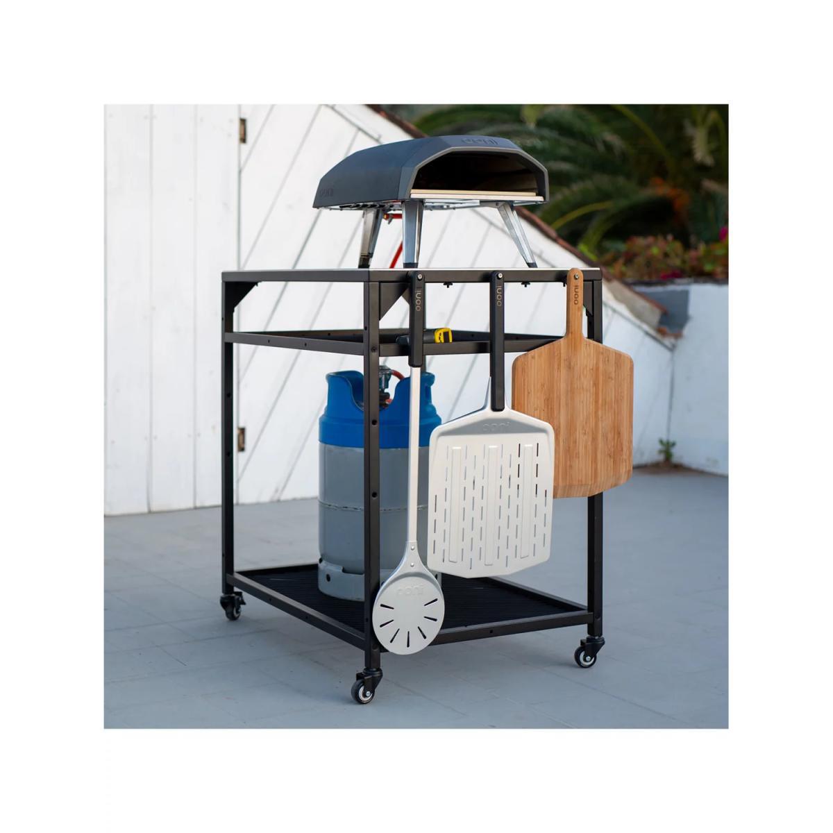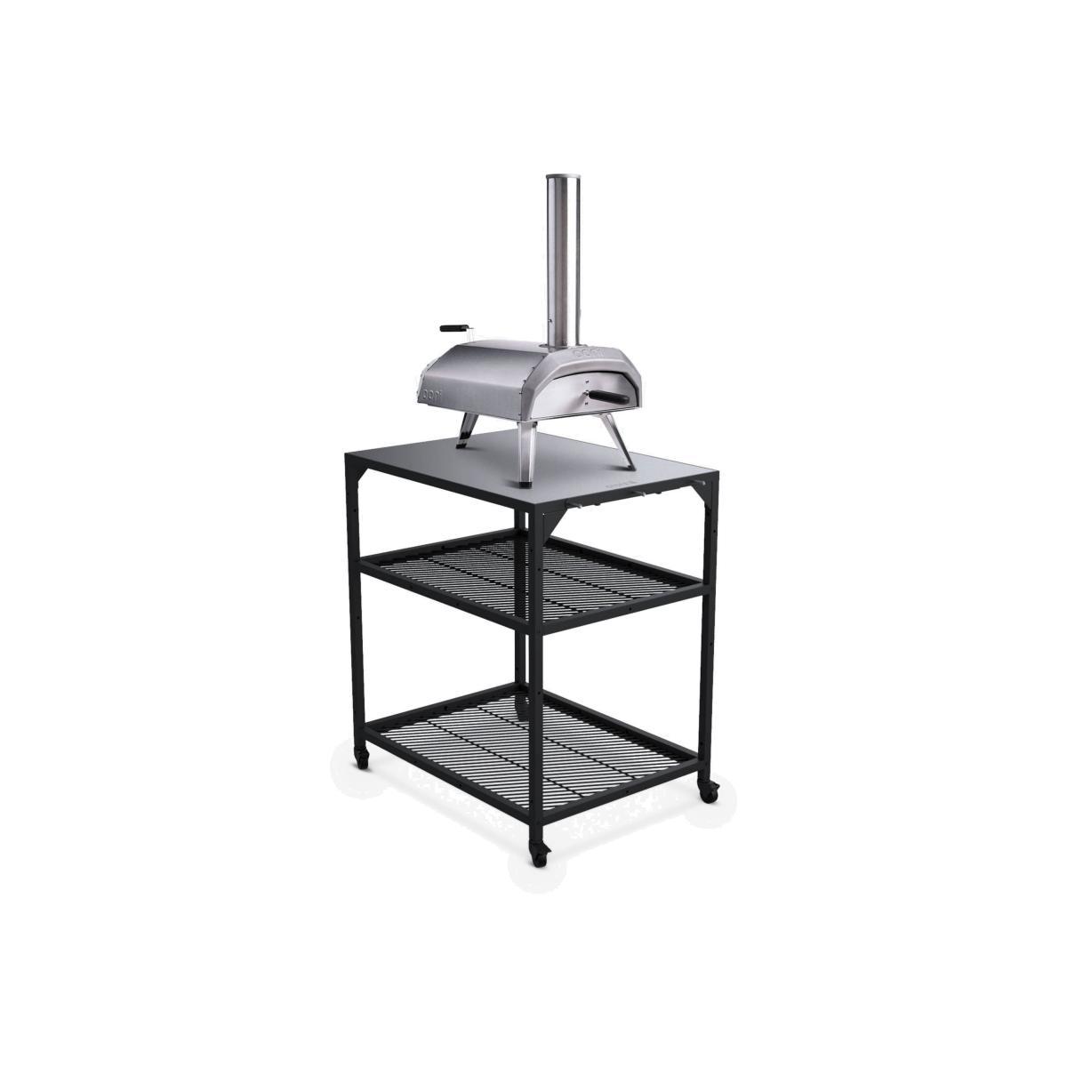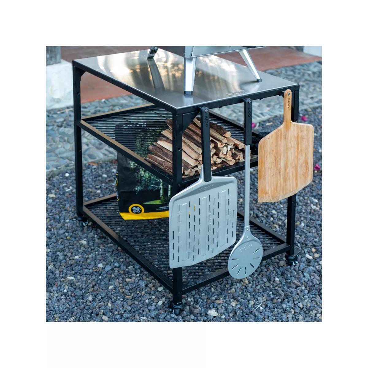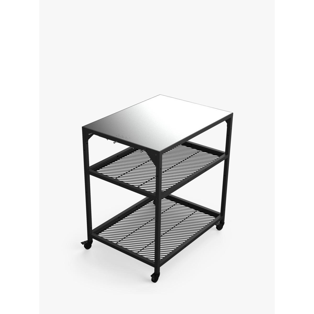 Compatible with all Ooni outdoor ovens, this regular-sized outdoor kitchen trolley has plenty of handy space when you're cooking in the garden. Customise the storage space you need with the two height-adjustable shelves for keeping ingredients such as pizza dough at the ready. The trolley is also designed to join with other Ooni modular outdoor tables. The table has a durable and stylish stainless steel work surface and a robust powder-coated carbon steel frame. Four lockable castor wheels make it easy to move and then lock it into position. Built-in hooks are ideal for hanging pizza peels and barbecue or oven accessories while cooking.