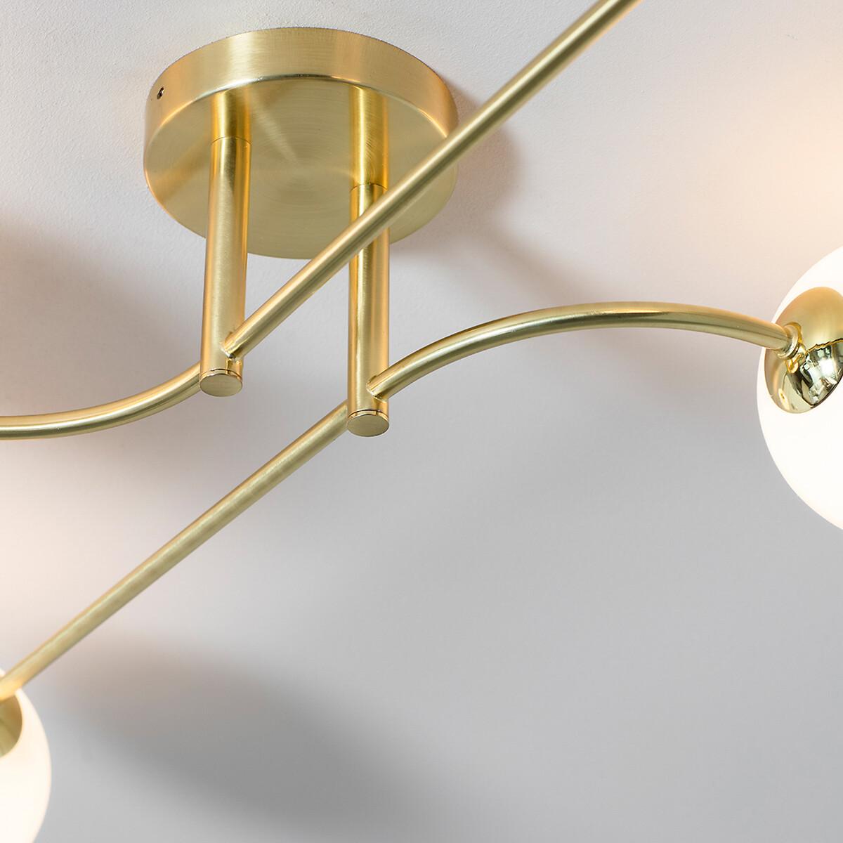 Create an 'on-trend' mid century feel with this ceiling light, a perfect combination of gloss opal blown glass shades with brushed brass metalwork. This ceiling light explores the art of balance with a mix of soft curves blended with a linear structure. H17 X W52CM.. This product will be dispatched by one of our trusted suppliers. You’ll be contacted by their selected courier about your delivery.