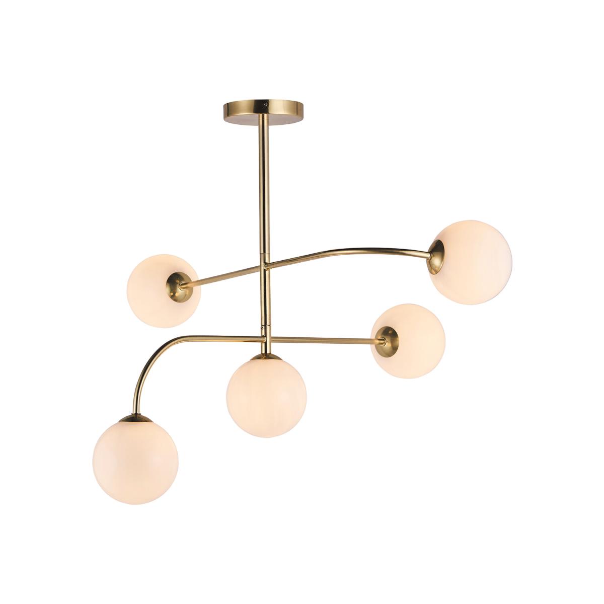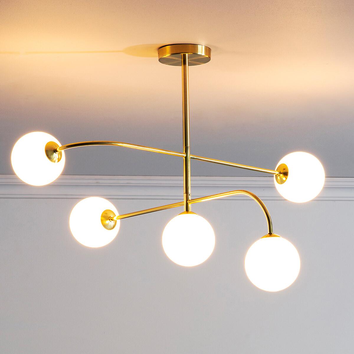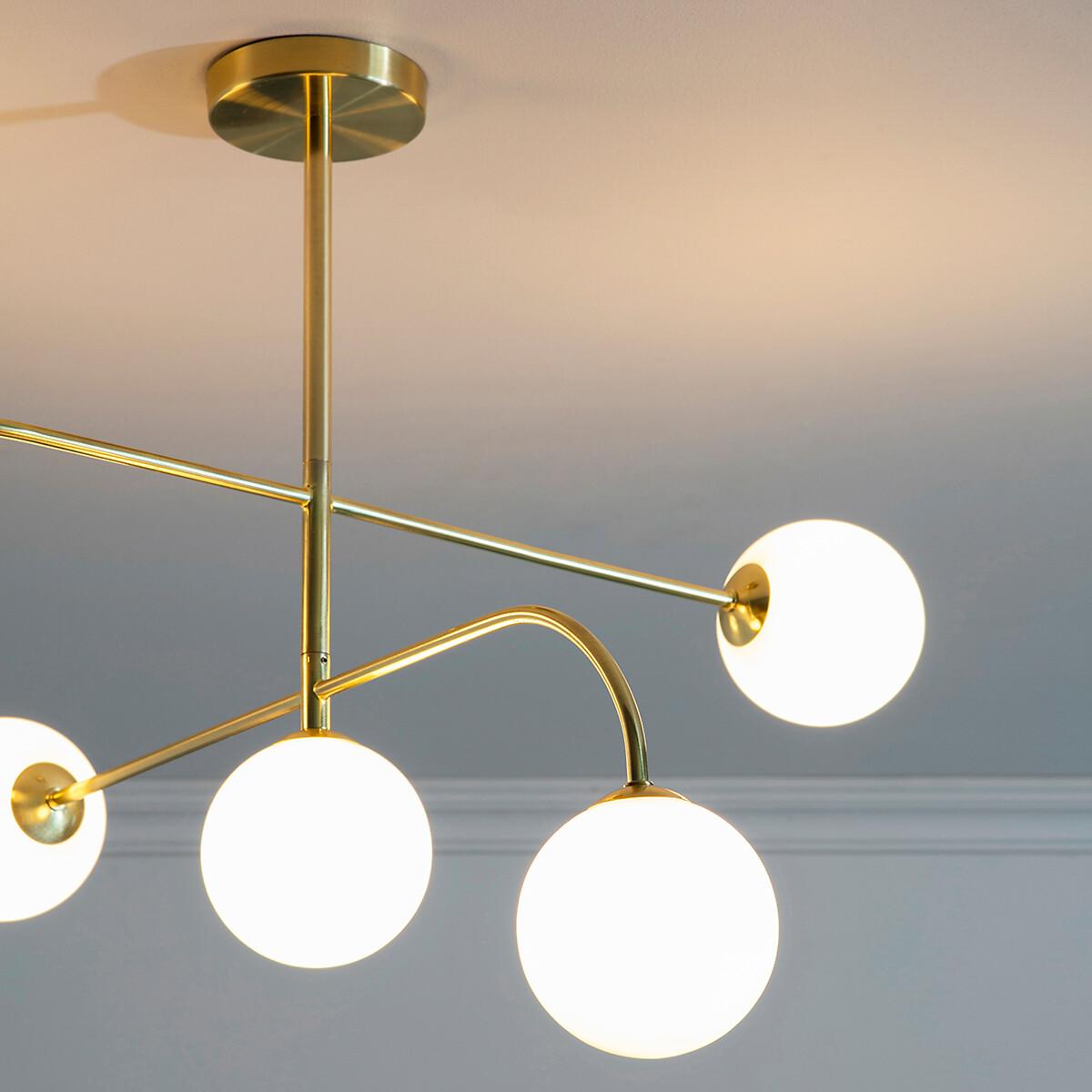 Create an 'on-trend' mid century feel with this ceiling light, a perfect combination of gloss opal blown glass shades with brushed brass metalwork. This ceiling light explores the art of balance with a mix of soft curves blended with a linear structure. H58 X W80CM.. This product will be dispatched by one of our trusted suppliers. You’ll be contacted by their selected courier about your delivery.