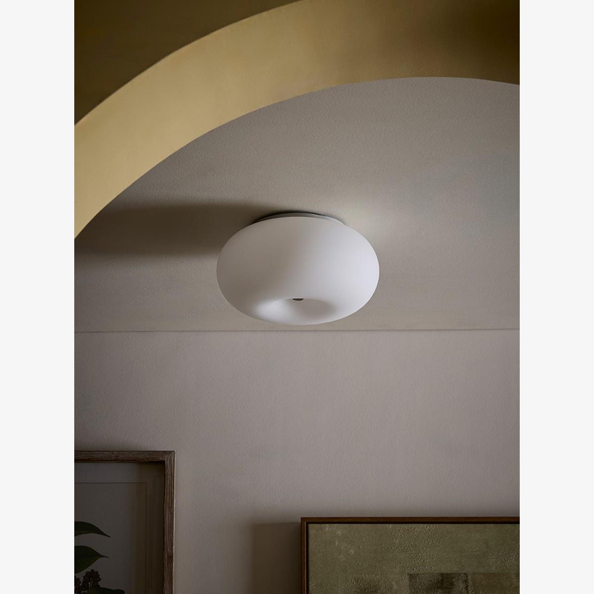 Simple with a modern twist, this ceiling pendant has a doughnut ring shape that casts a gentle glow across your space. With a steel plate, the matte-opal shade works in a variety of homes and fits wonderfully in our Scandi trend.