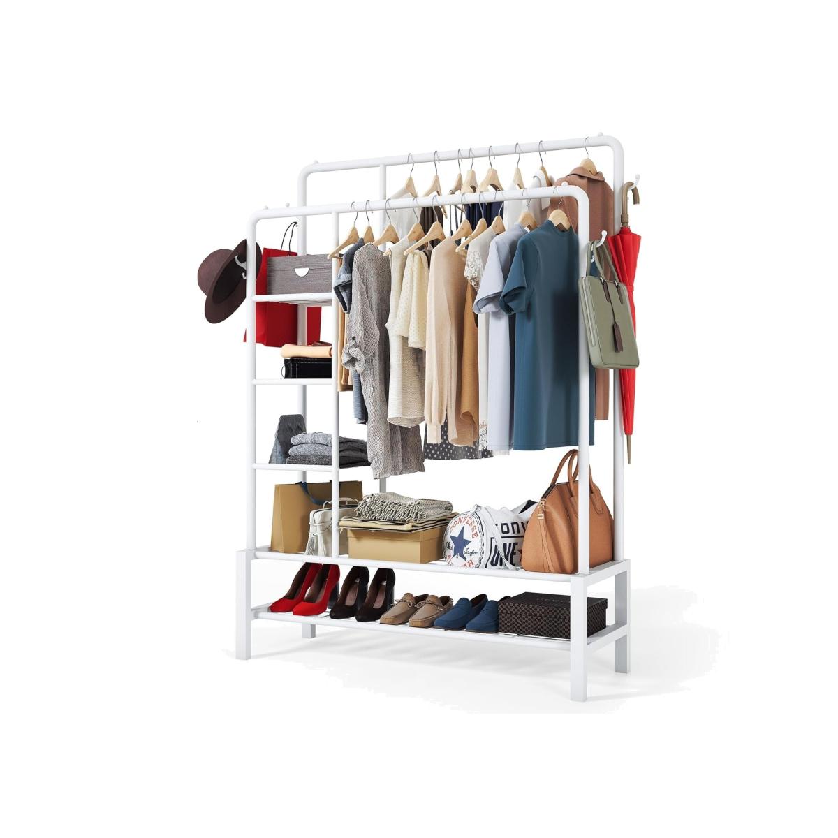 The Klass Home Collection Clothes Rail is a solid clothes rack constructed with high-quality steel tubes for unmatched durability and stability. The clothes rail, heavy-duty, features a stable base and double hanging rods, offering a combined maximum capacity of 120kg. 4-in-1 solution with a double clothes rail with anti-slip beads, two shoe rack shelves, four side storage shelves and four hanging hooks. The compact design of this portable clothes rail makes it suitable for various spaces. It is a free-standing, sturdy White clothes rail that keeps your clothes and belongings organised. An ideal hanging rail for small spaces and temporary wardrobes. Effortlessly assemble this black clothes rail with shelves using the provided tools. It is a versatile open wardrobe clothing rack suitable for clothes rails for bedrooms, shops, and offices. A convenient hanging rail solution. Designed in Britain, trust Klass Home Collection for all your storage needs. Our sturdy and reliable metal clothes rail comes with a one-year free guarantee and professional customer service. Contact us for assistance with your clothes rack.