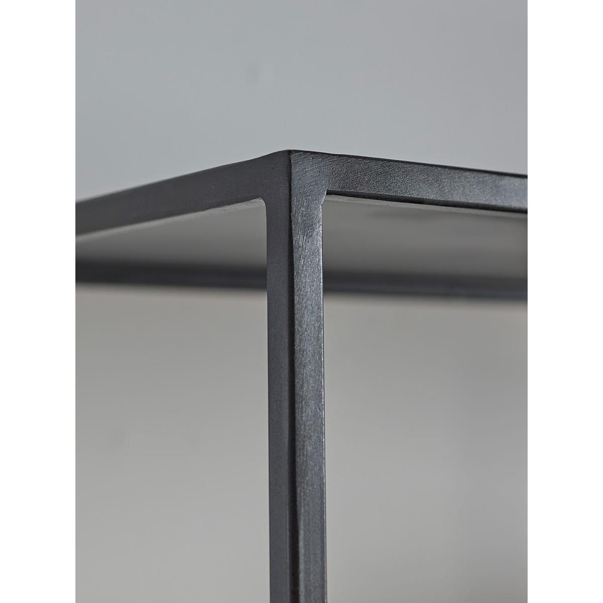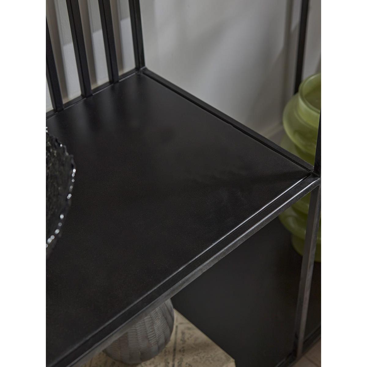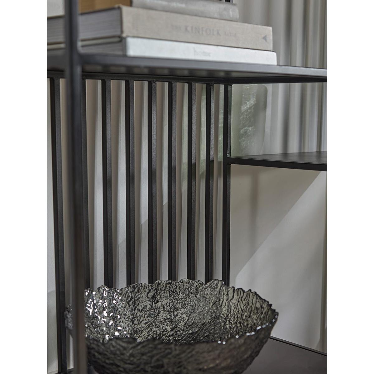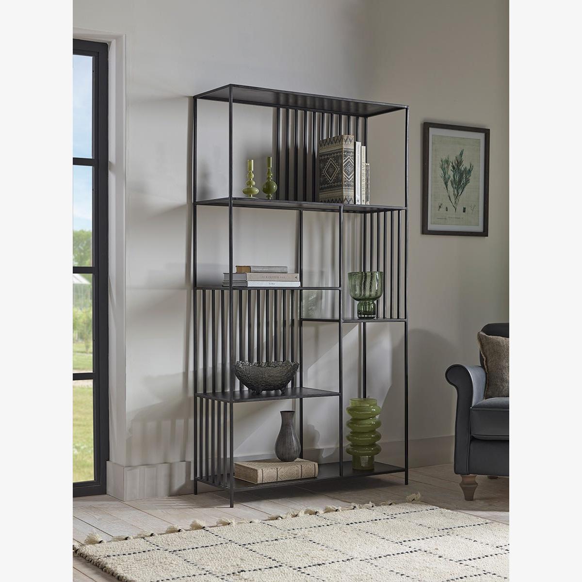 A simple metal frame creates cubby hole style shelves that can display your beautiful home accessories. In a striking black colour, the open shelf design pairs with horizontal bars that infill some areas of the unit creating a refined and contemporary design. Pair with our Rounded Olive Glass Vase or our Standing Textured Glass Bowl as weve done here.