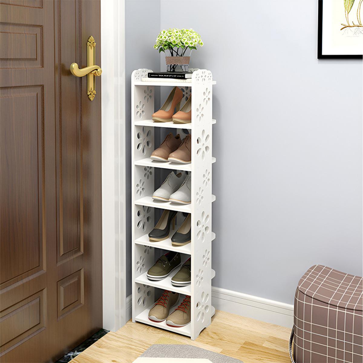 Discover the perfect footware storage solution for limited spaces with this tall and narrow shoe rack. With six to eight tiers in total that are equally spaced, it accommodates your daily footwear or frequently used items for easy reach. Covering a small footprint, it makes an ideal addition to tight doorways. Crafted from durable plastic, it offers stability and sturdiness without wobbling. Maximize your storage efficiency and keep your space tidy with this simple yet functional shoe rack.