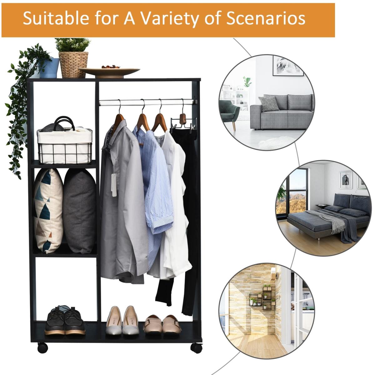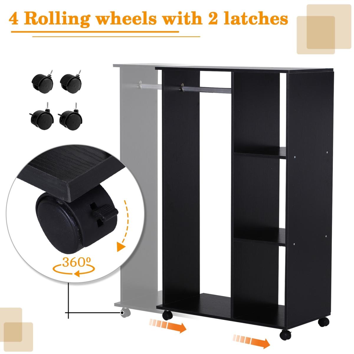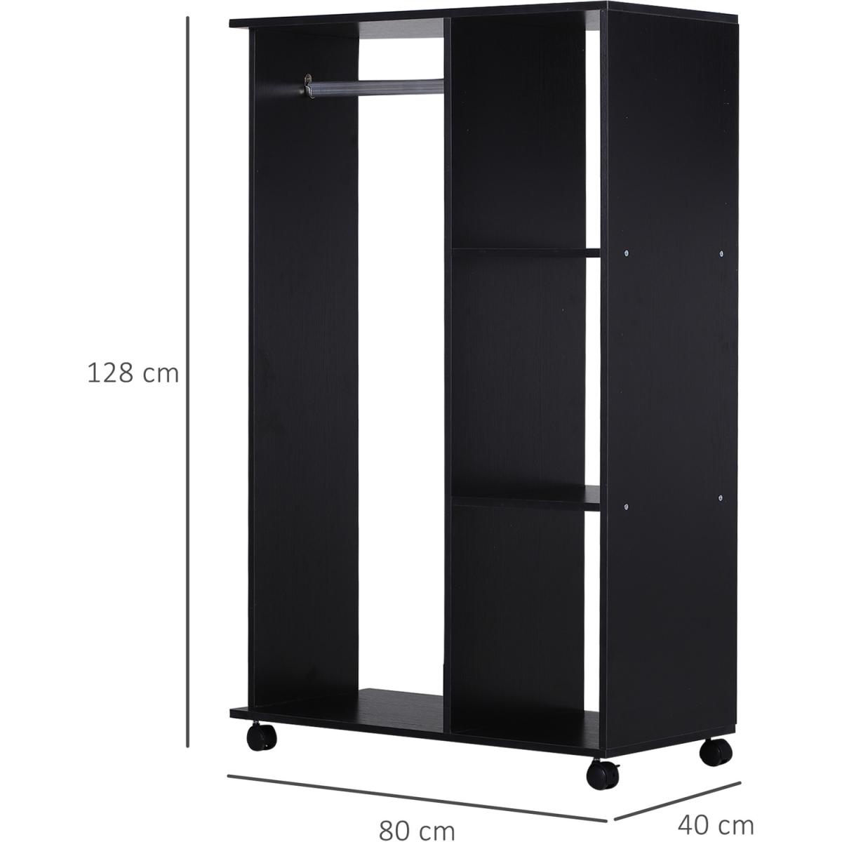 This high-quality mobile open wardrobe is perfect for storing your clothes and keep it organized. It comes complete with a hanging shelf and three cubbies, offering sufficient space to meet all storage needs. The wheels under the wardrobe enable you to move with ease to where you need it to be.