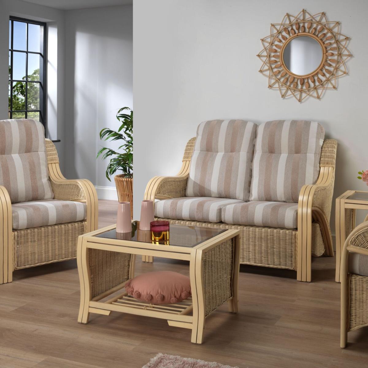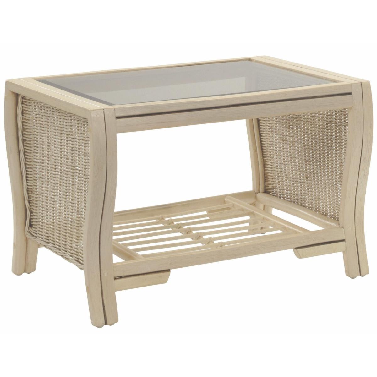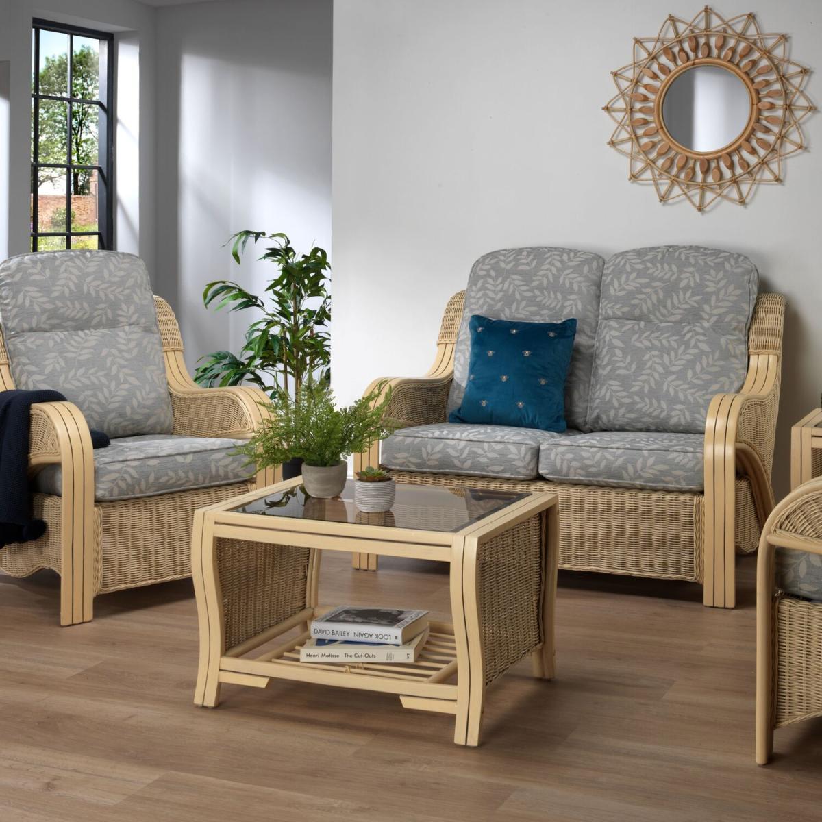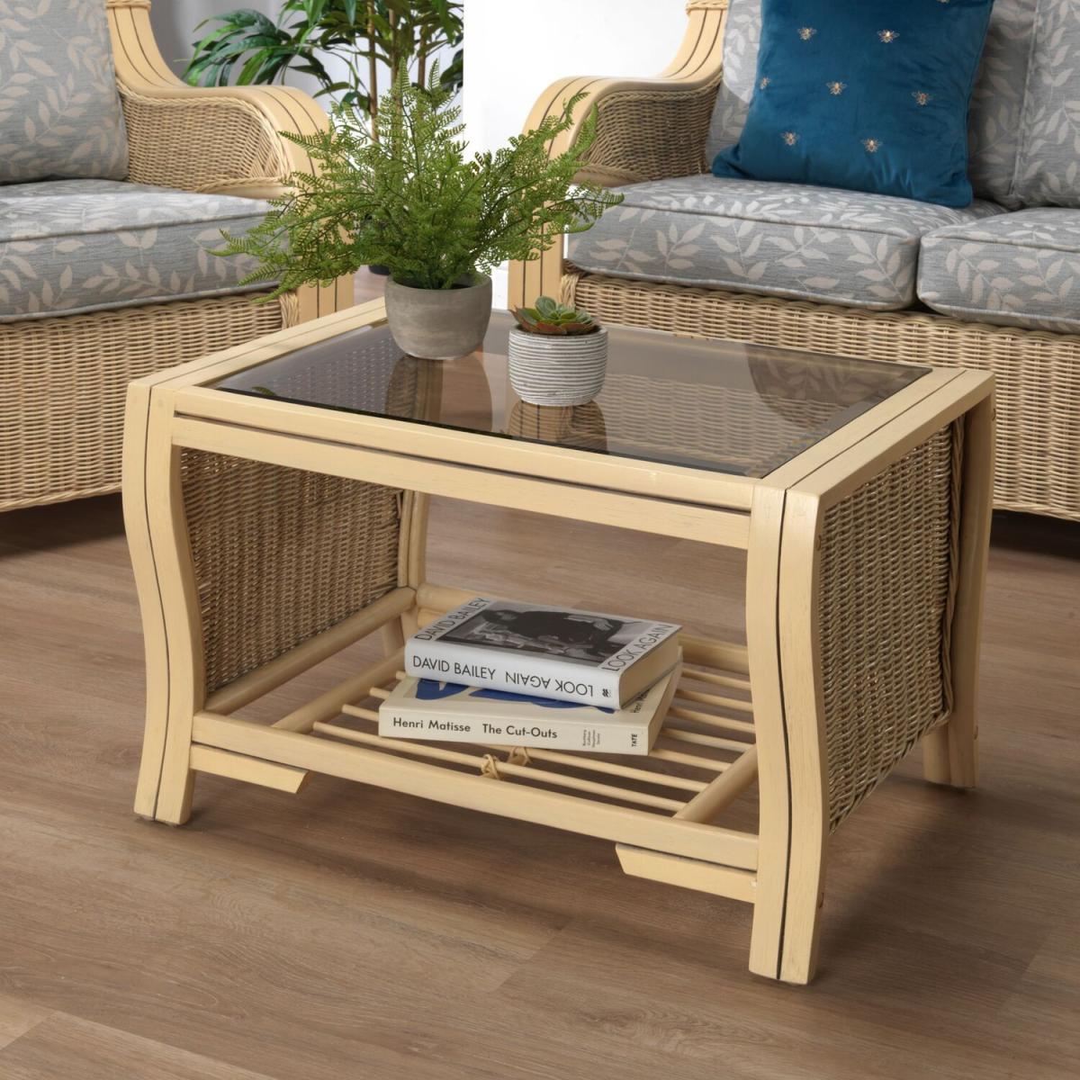 A sustainable natural rattan coffee table with 5mm toughened glass top and bottom shelf