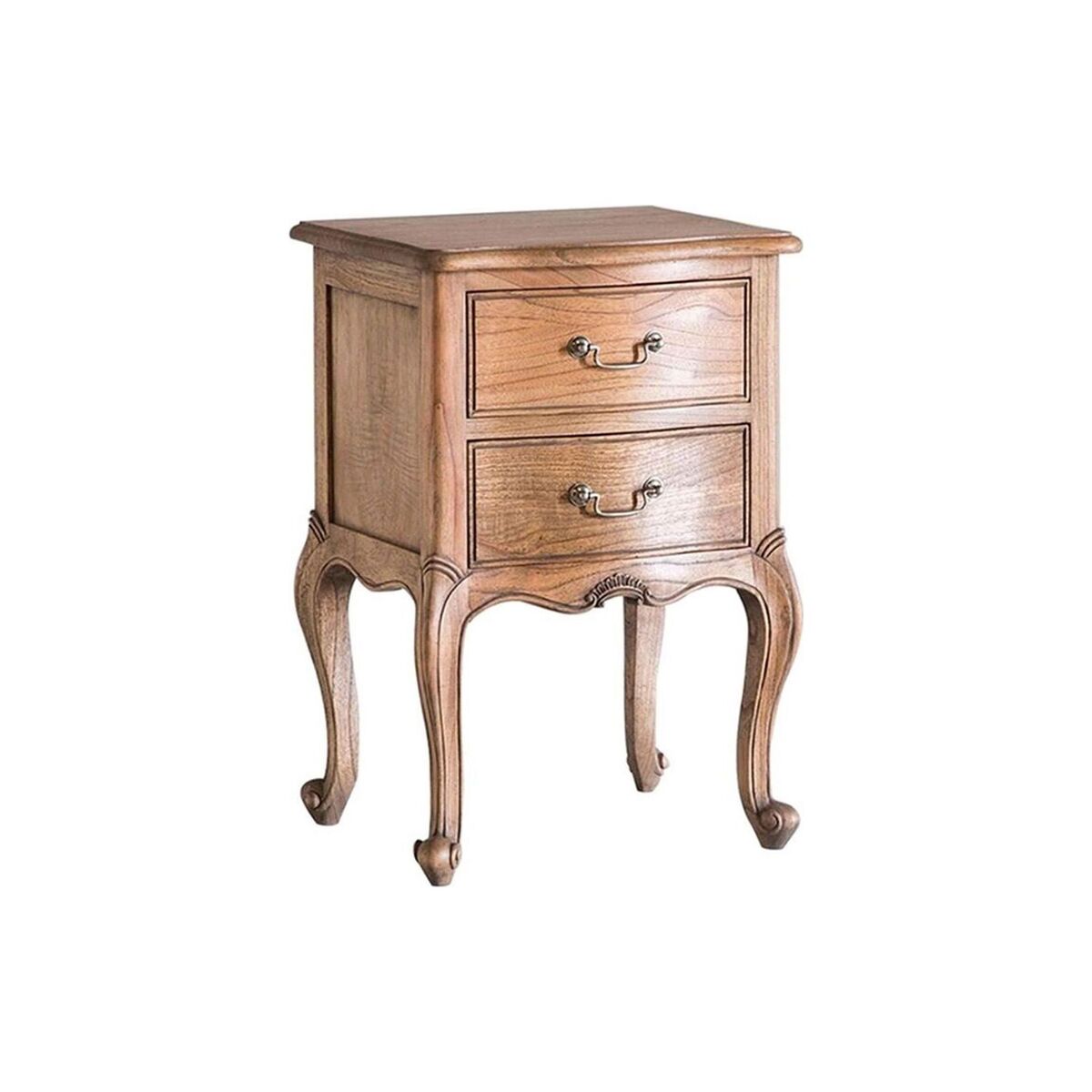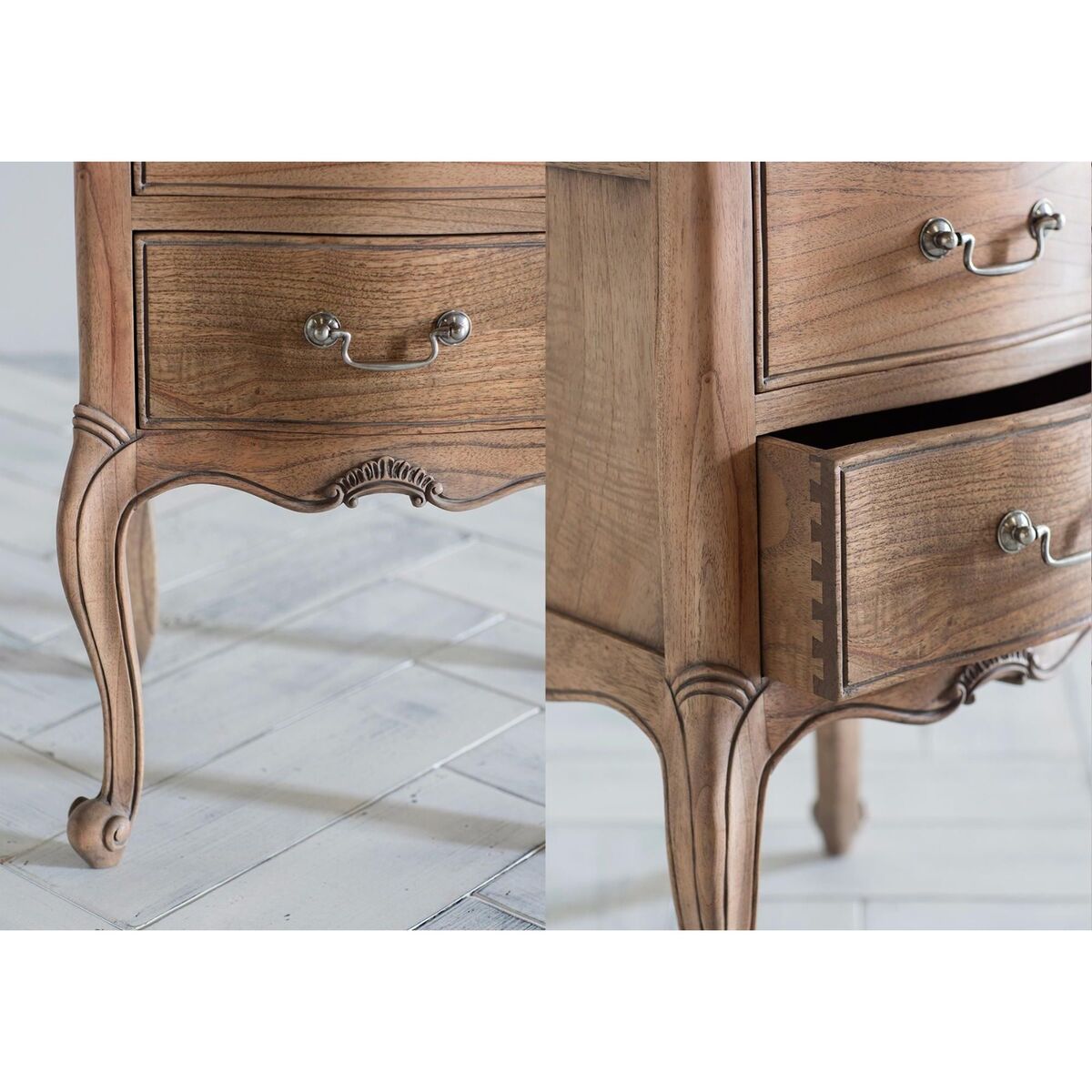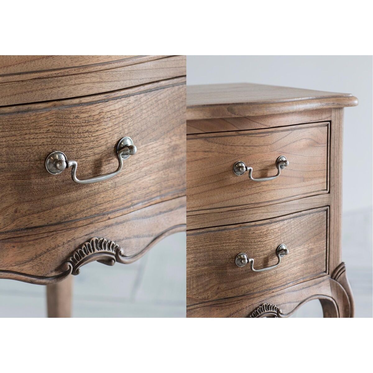 Real love has gone into the carving of this intricate and shamelessly ornate wooden bedside table which forms part of our Opera range in weathered wood. Two drawers adorned with antique-style handles and fabulous curved legs. Seriously French, seriously fancy.