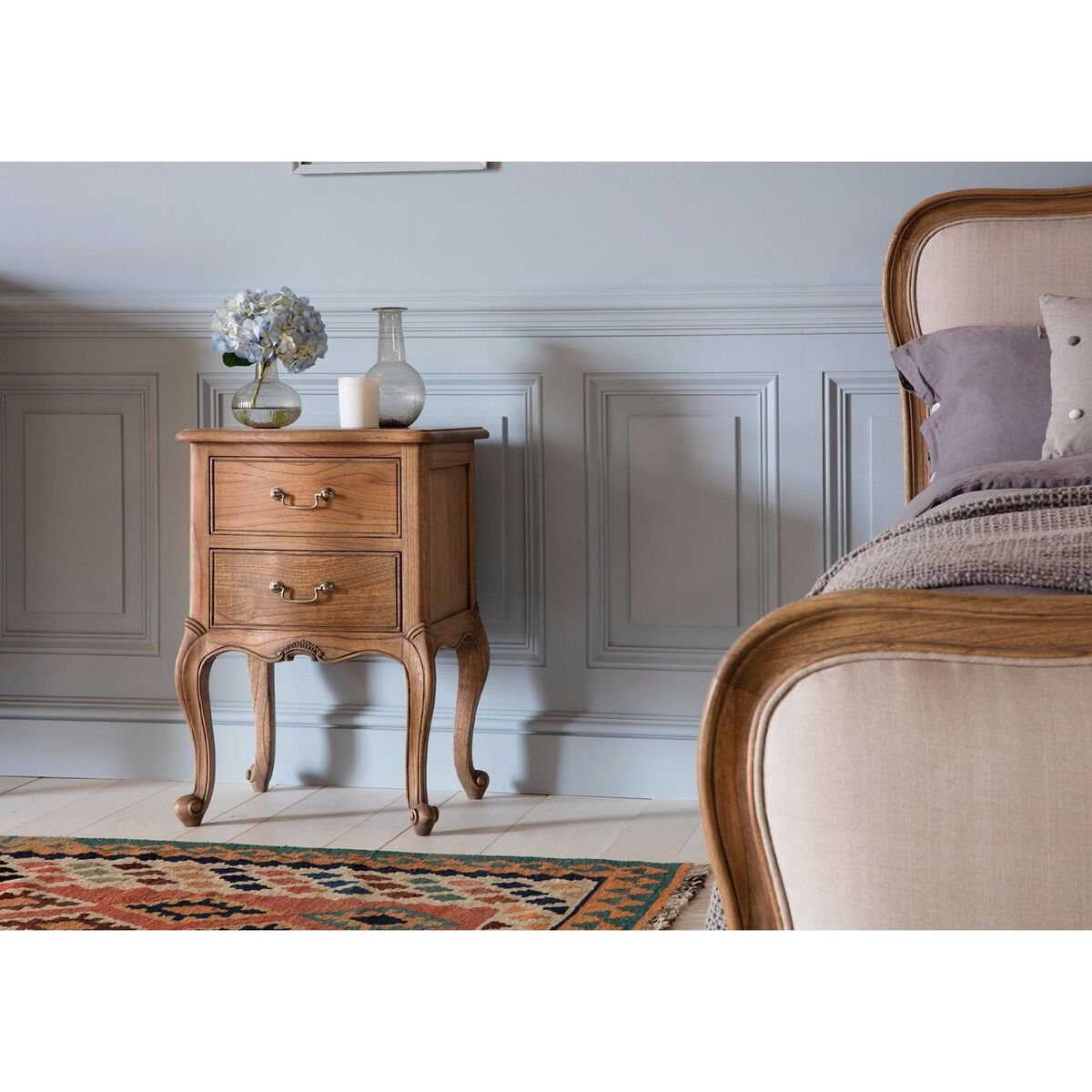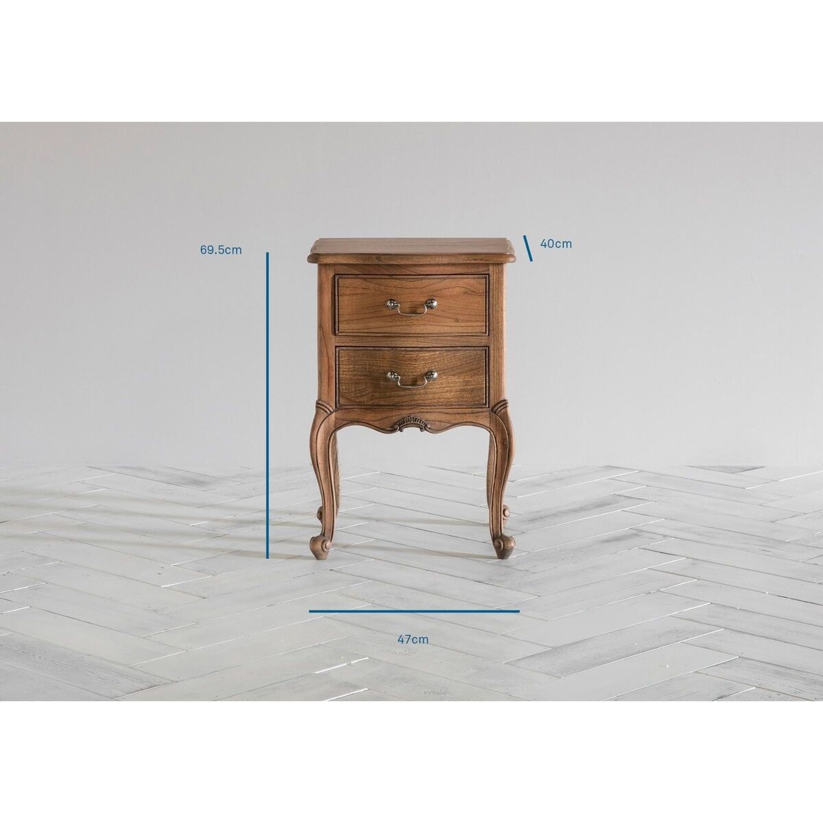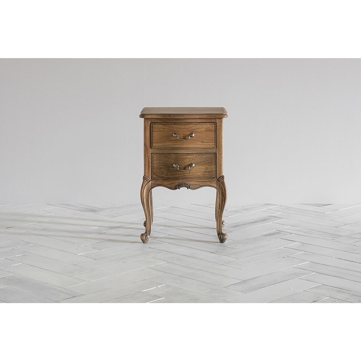 Real love has gone into the carving of this intricate and shamelessly ornate wooden bedside table which forms part of our Opera range in weathered wood. Two drawers adorned with antique-style handles and fabulous curved legs. Seriously French, seriously fancy.